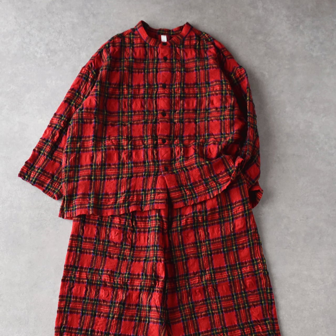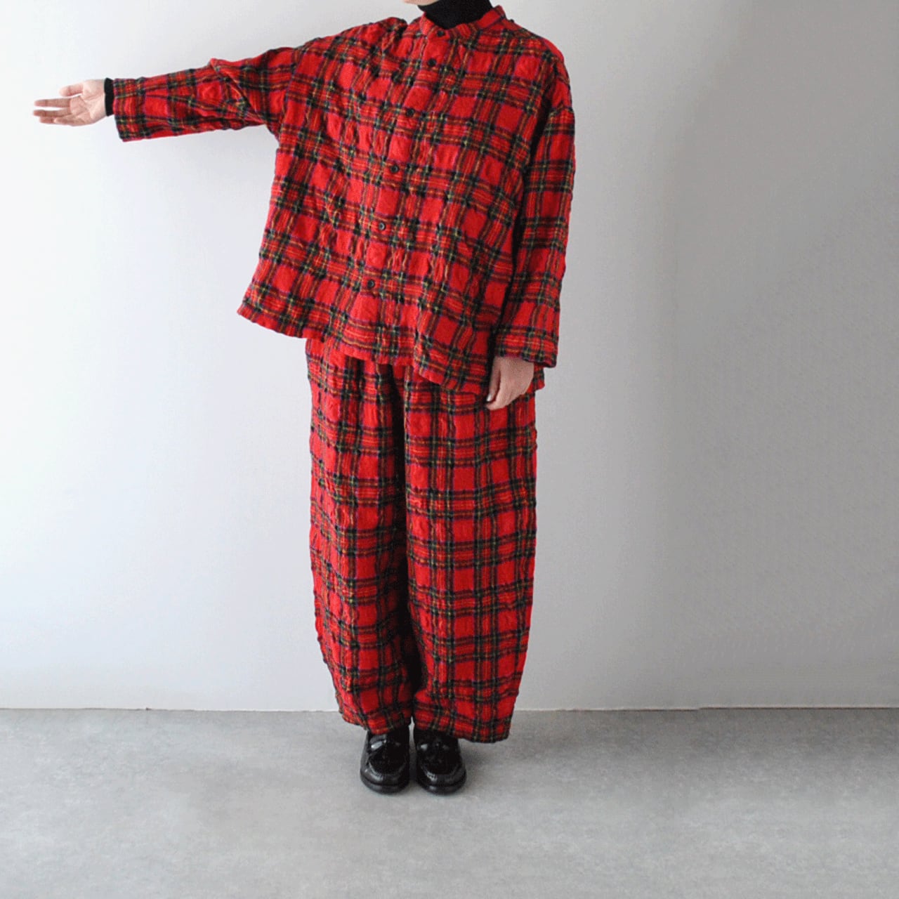 pritから赤いタータンチェック柄が印象的なスタンドカラーシャツが届きました。オーバーサイズのゆったりとしたサイズ感で、シンプルにブラウスとしてはもちろん、前を開けてジャケット感覚で羽織っても雰囲気よく楽しめる便利な一枚。ワンピースにサッと羽織るのも可愛いですよ。ウールとコットンの収縮差で生まれるウネのある立体的な生地感も優しい表情。同素材のバギーパンツとセットアップで着用頂くのもとっても可愛いです。