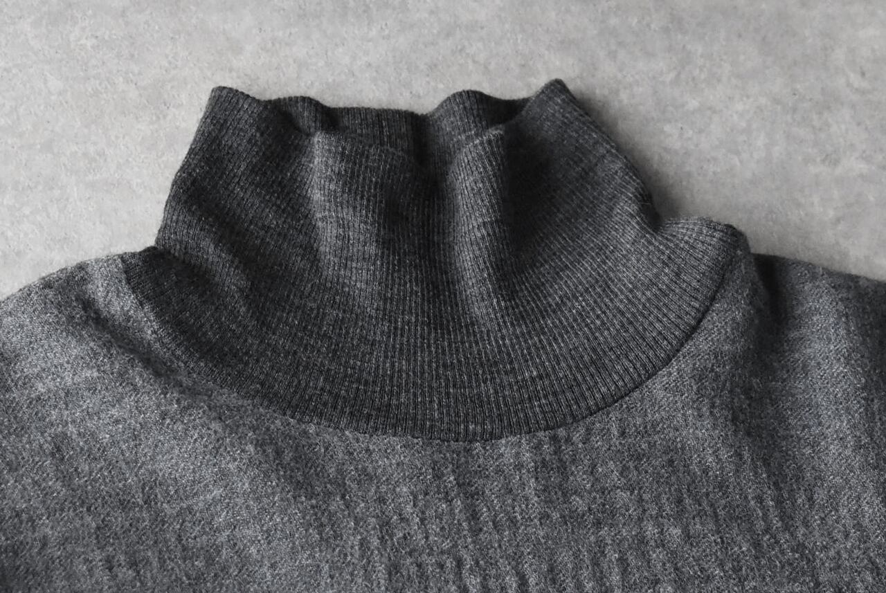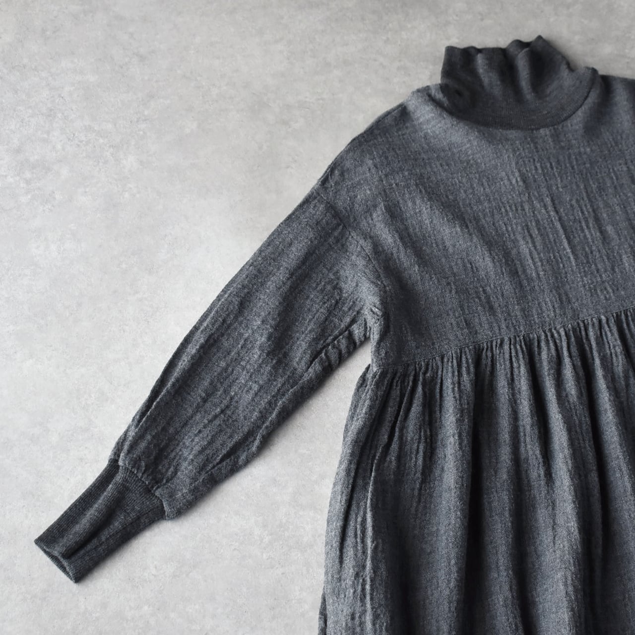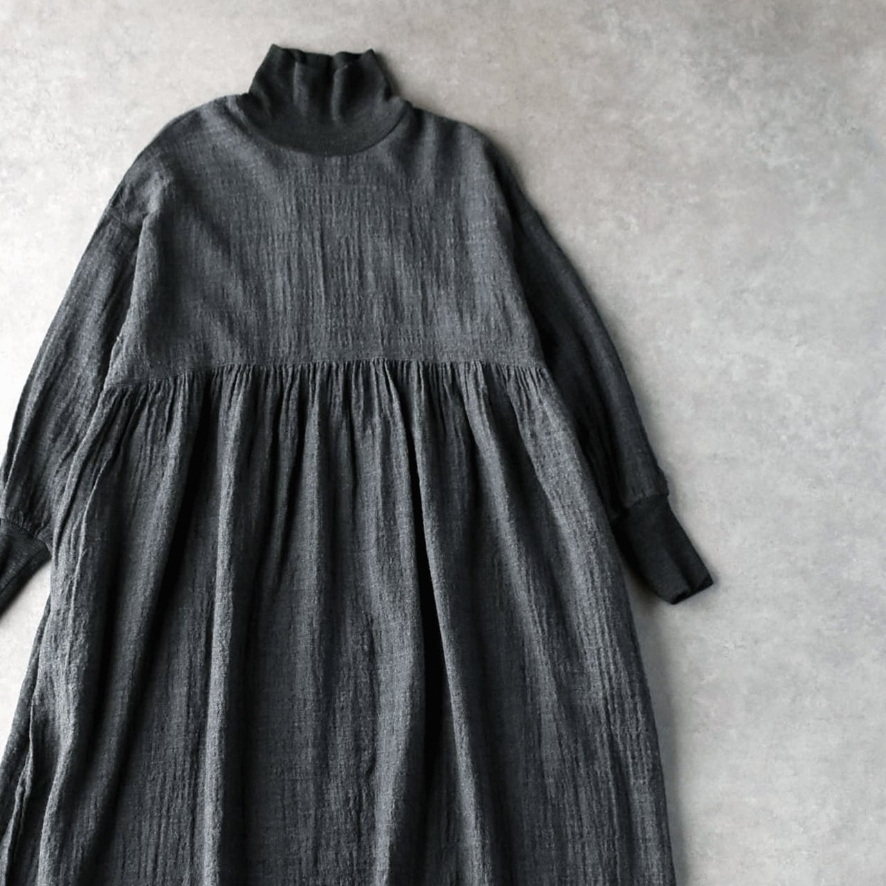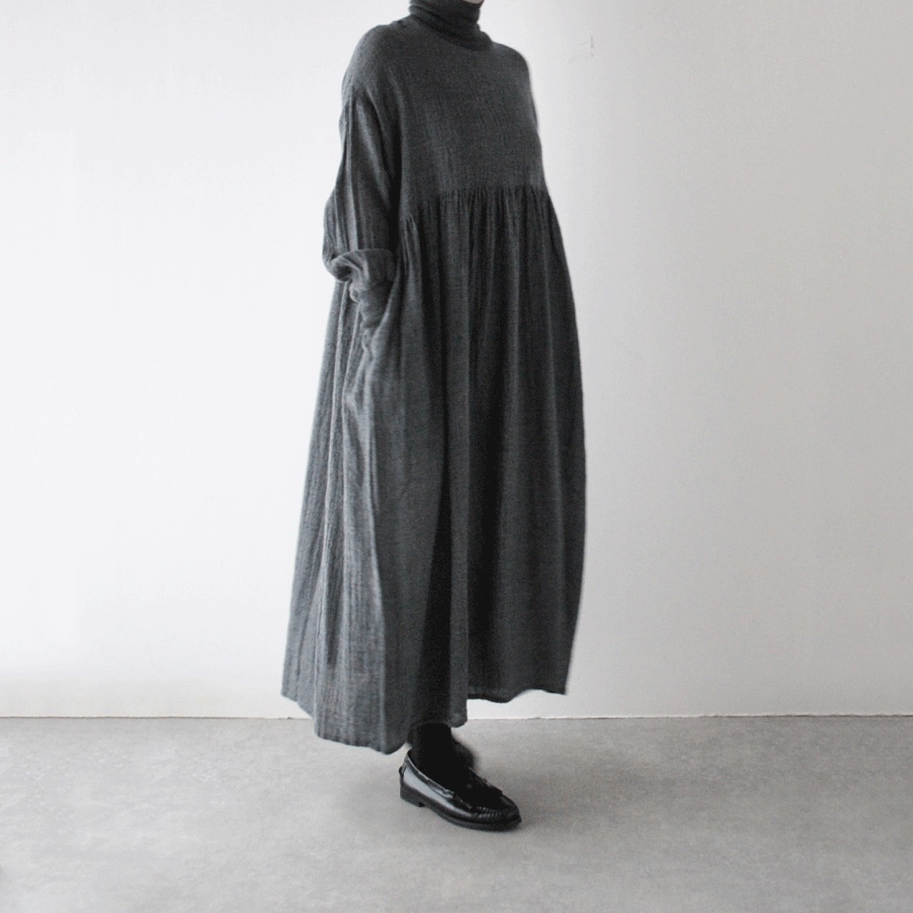 pritから、ガーゼのようにふっくらと織り上げたウールビエラ生地で仕立てたタートルネックワンピースが届きました。とにかく軽くて温かな着心地が嬉しい一枚です。ウエストの高めの位置で切り替えてギャザーを寄せたデザインがとってもスタイル良く見せてくれますよ。タートル部分と袖口はリブ素材になっているので、チクチク感なく楽しめます。ちょっとかしこまったシーンにもオススメです。