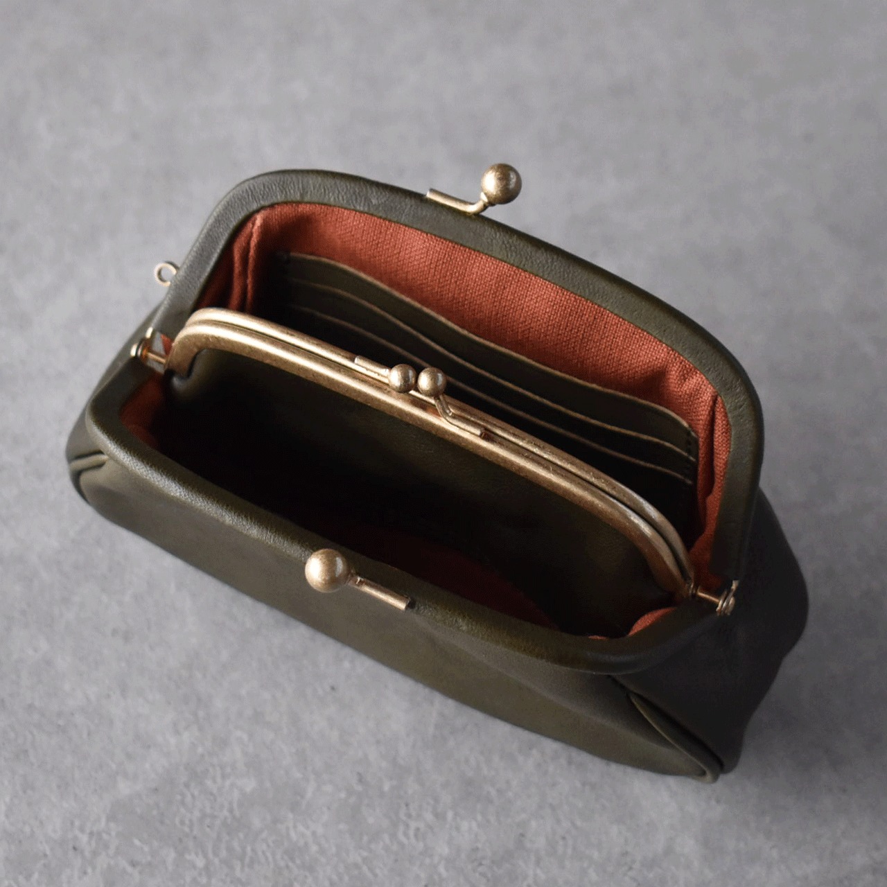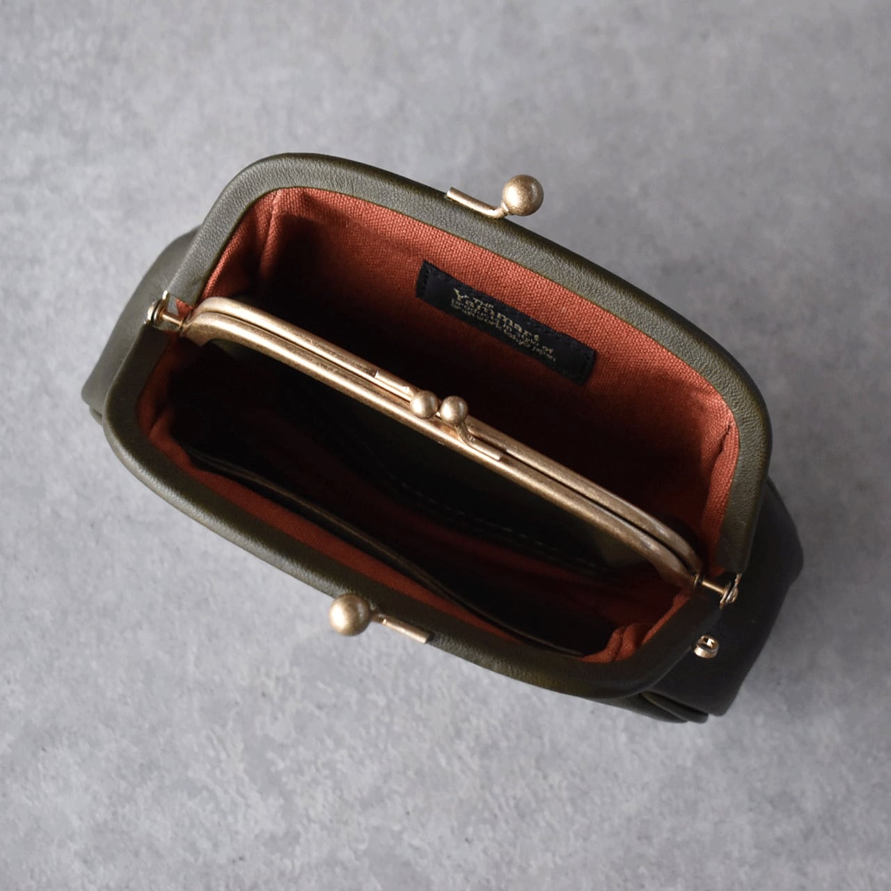 年齢やスタイルを問わず永く使っていただけるようにとの願いを込めて、ビルの一室にある小さなアトリエでお一人で製作されているYammart(ヤマート)さんのレザーアイテム。ぷっくりコロンとした形が特徴のシンプルながま口のお財布は、口金部分にも革を巻きクラシックな印象に仕上げられています。親子がま口仕様で、中で小銭とお札を分けて収納でき、カード3枚分の収納ポケットがついています。見た目以上に容量があり、小銭入れを仕切りにして、片側にカード約20枚、もう片側に二つ折りにしたお札やレシートをたっぷり収納出来ます。使い込むほどに色の深みと自然なツヤが増し、味わい深くなっていく変化の過程も楽しめます。