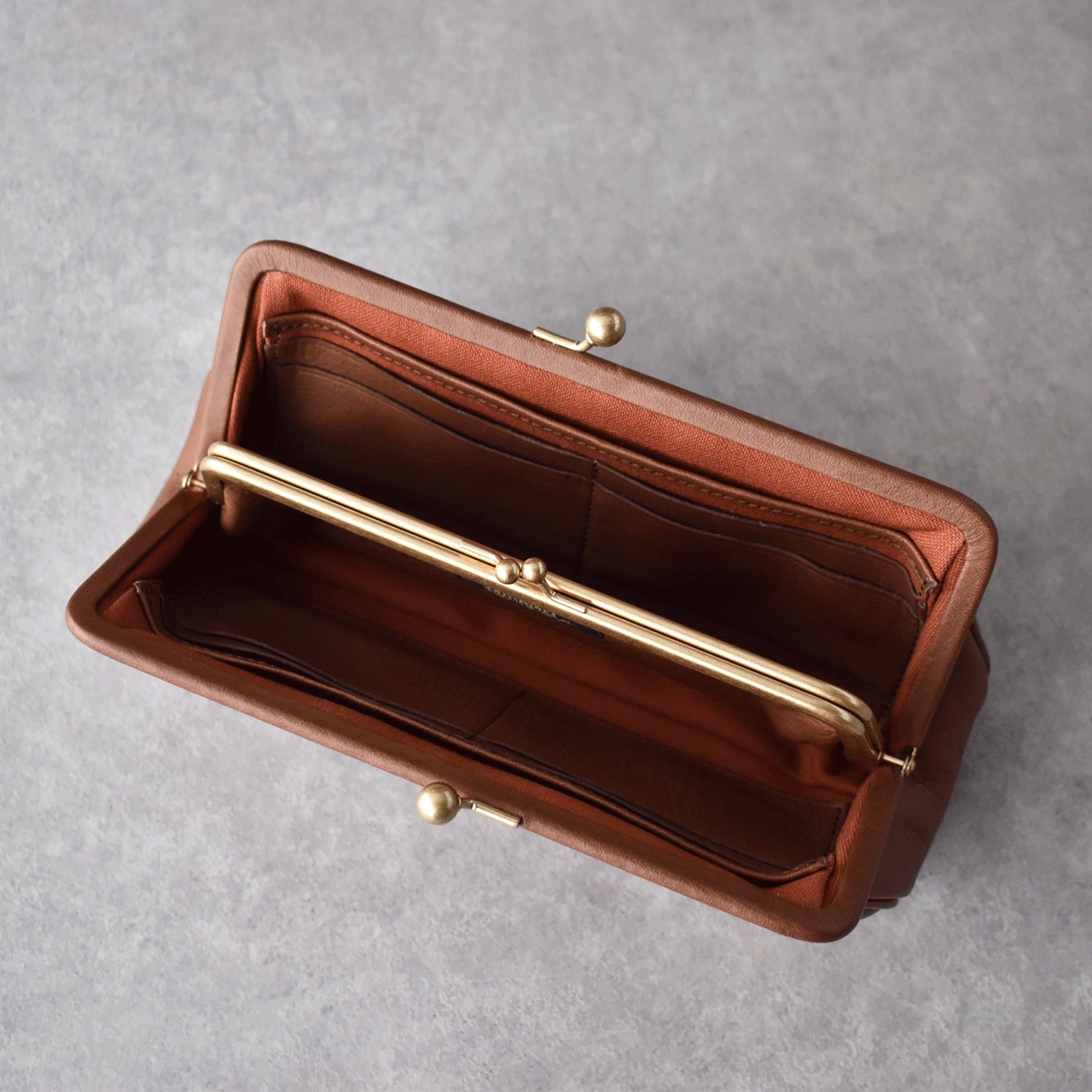 年齢やスタイルを問わず永く使っていただけるようにとの願いを込めて、ビルの一室にある小さなアトリエでお一人で製作されているYammart(ヤマート)さんのレザーアイテム。ぷっくりコロンとした形が特徴のシンプルながま口の長財布は、口金部分にも革を巻きクラシックな印象に仕上げられています。親子がま口仕様で、中で小銭とお札(折らずに入ります)を分けて収納でき、カードポケットは前後4つづつ、合計8枚収納できます。コンパクトなお財布ではないけれど収納力や存在感が抜群なので、中に鍵などの貴重品を入れてクラッチバッグ風にもお楽しみ頂けますよ。使い込むほどに色の深みと自然なツヤが増し、味わい深くなっていく変化の過程も楽しめます。