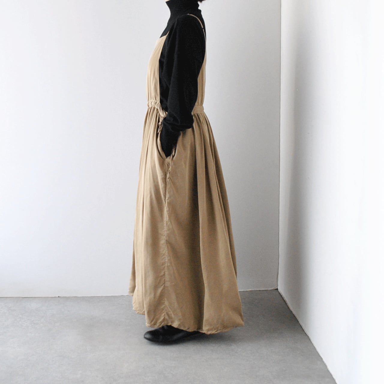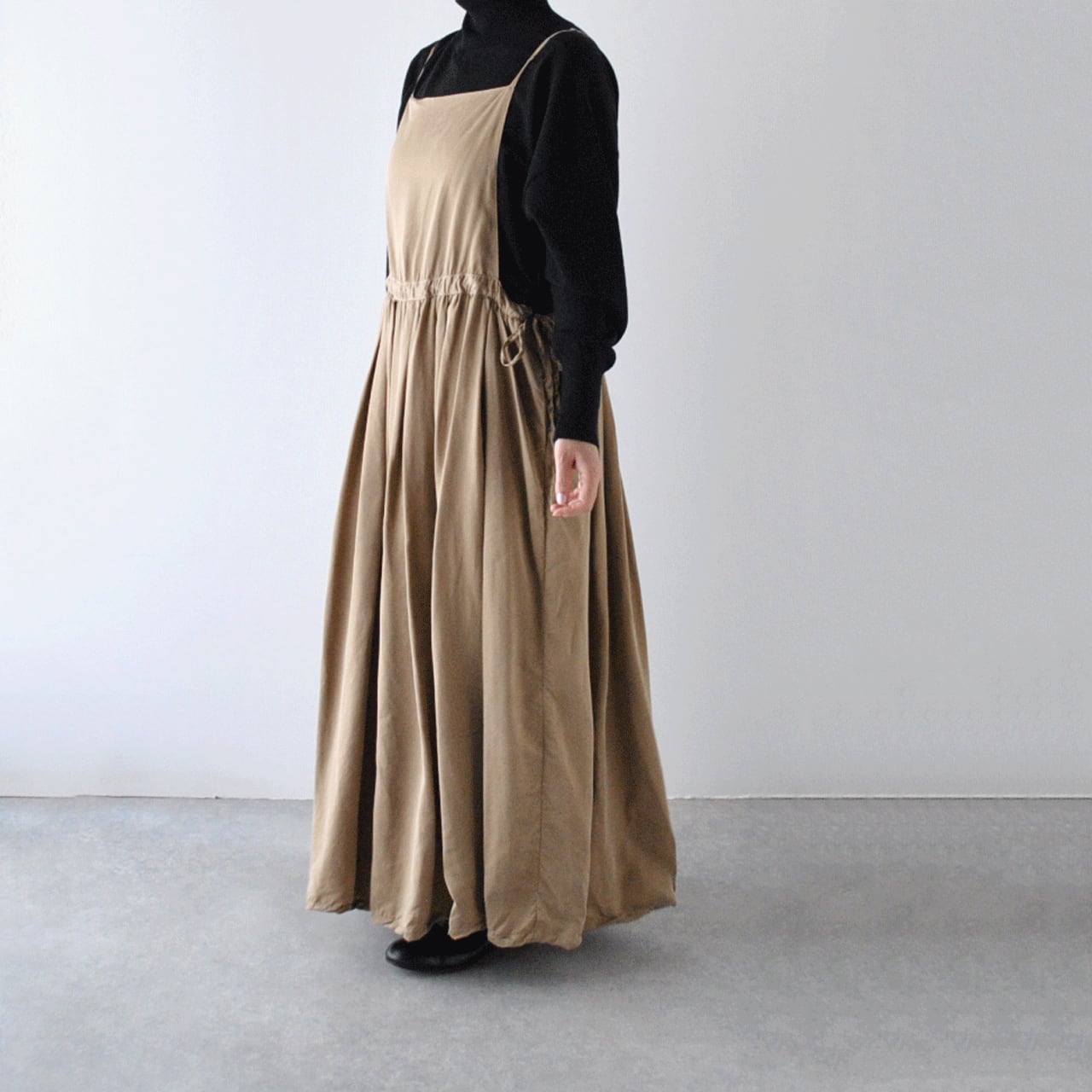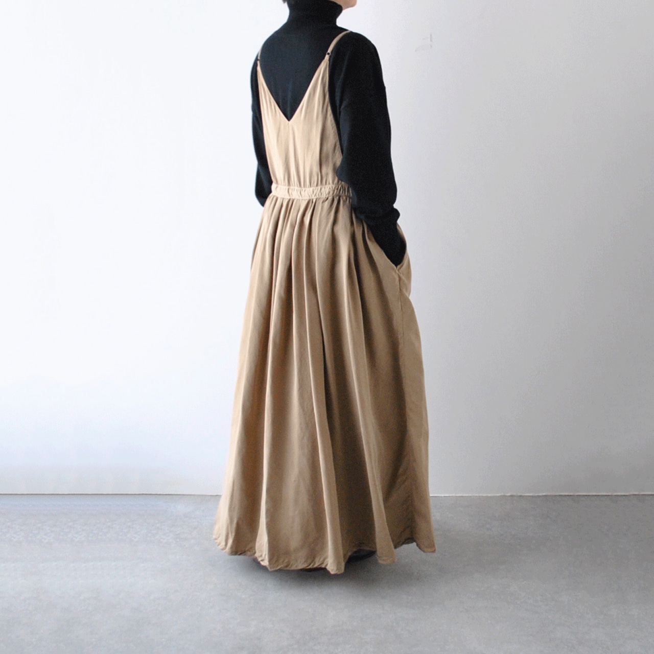 Gauze# からスウェードタッチの滑らかなキュプラ地で仕立てたキャミソールワンピースが届きました。ウエストには細かなタックを寄せ、動くたびに緩やかに揺れる姿が本当に美しい一枚です。これからの季節、ニットやブラウスにサッと重ねて上品に楽しんで頂けますよ。キュプラ素材ですがしっかりとした肉感で、しっとりとした光沢のある表情は、まるで上質なドレスを身に纏っているようです。ウエストにはリボンが通っていますので、キュッと絞ってお好みのフォルムにブラウジングが可能。前後どちらを前にしても着れる2WAY仕様になっています。肩ヒモは無段階で調節可能。