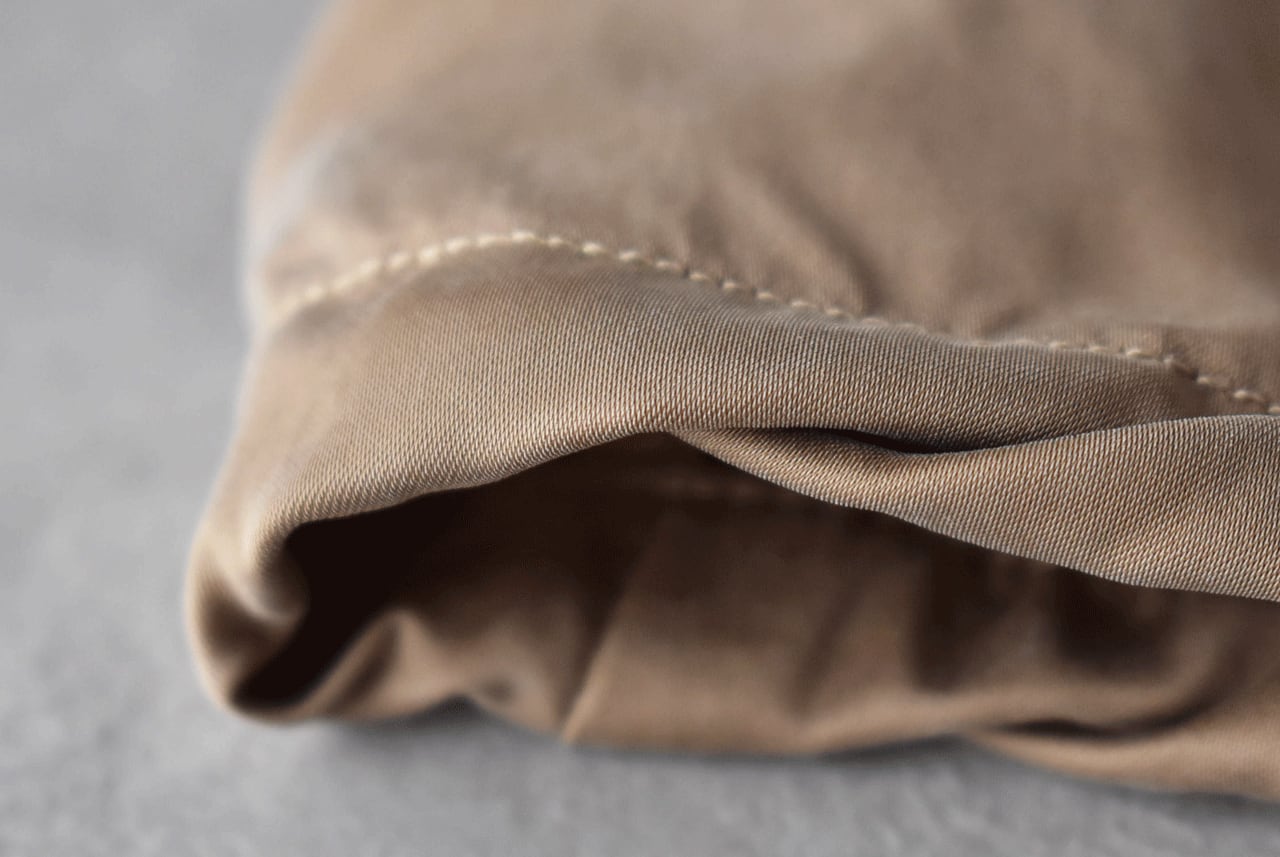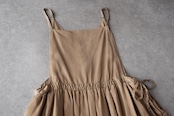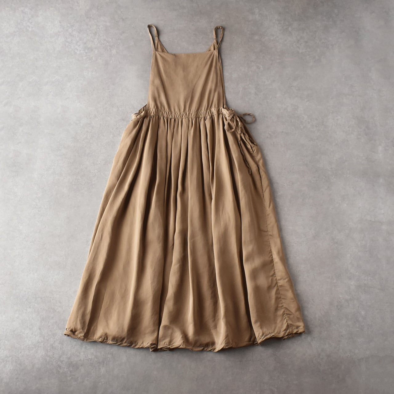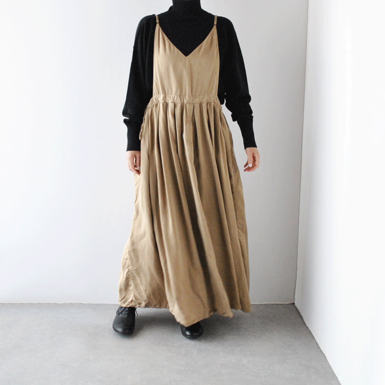 Gauze# からスウェードタッチの滑らかなキュプラ地で仕立てたキャミソールワンピースが届きました。ウエストには細かなタックを寄せ、動くたびに緩やかに揺れる姿が本当に美しい一枚です。これからの季節、ニットやブラウスにサッと重ねて上品に楽しんで頂けますよ。キュプラ素材ですがしっかりとした肉感で、しっとりとした光沢のある表情は、まるで上質なドレスを身に纏っているようです。ウエストにはリボンが通っていますので、キュッと絞ってお好みのフォルムにブラウジングが可能。前後どちらを前にしても着れる2WAY仕様になっています。肩ヒモは無段階で調節可能。