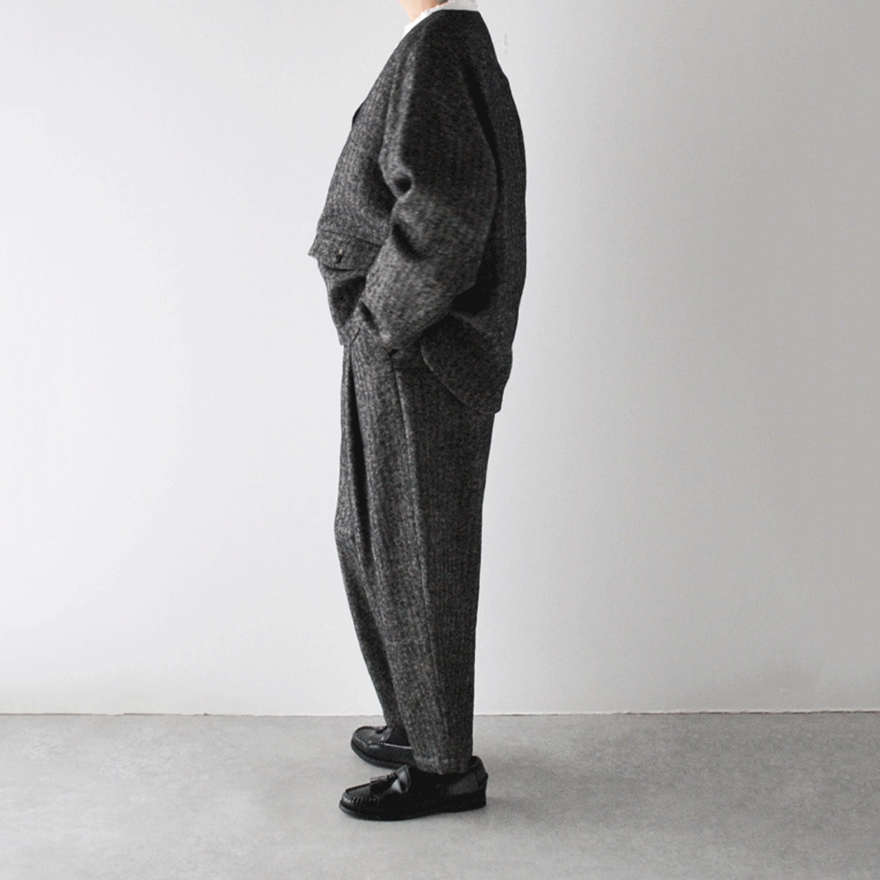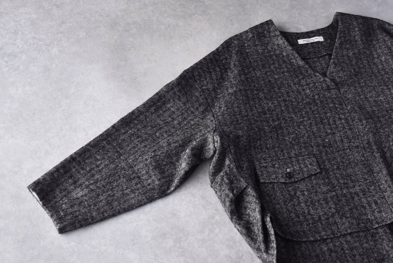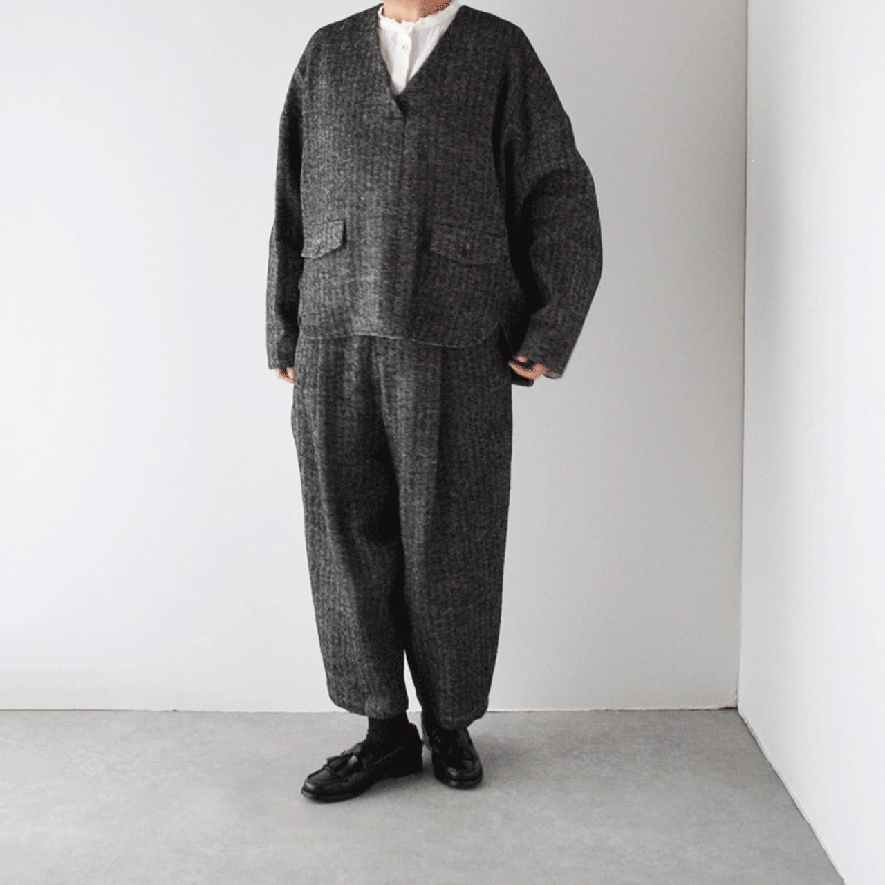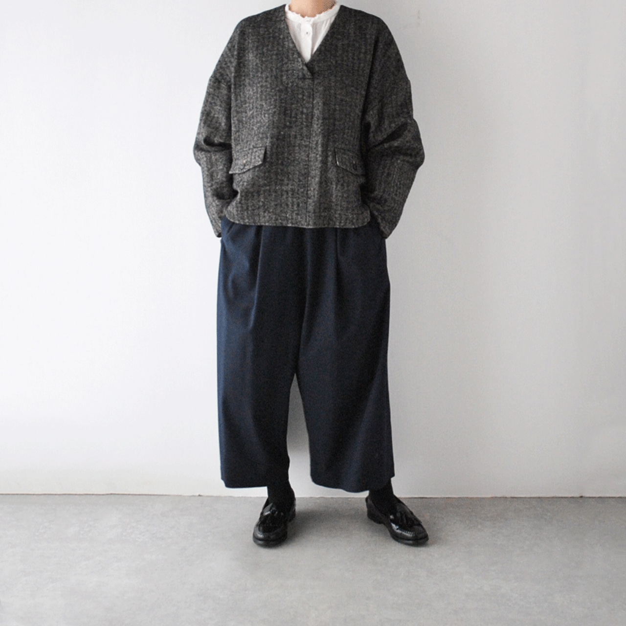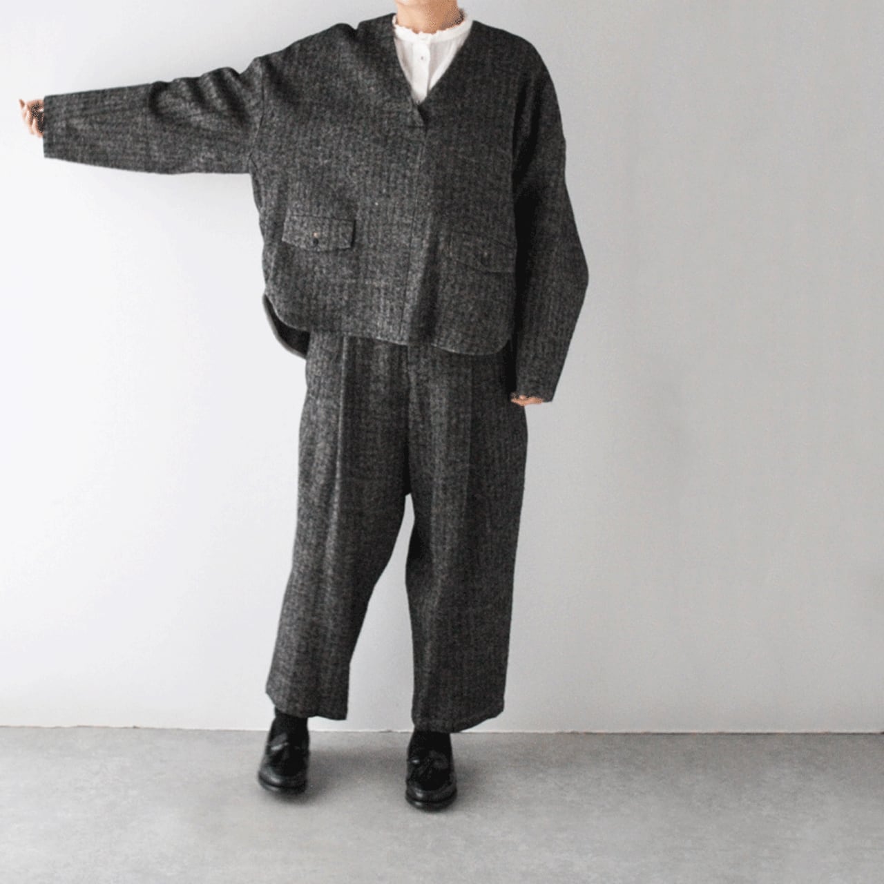 atelier naruseから、トップスとしても、アウターのようにも着て頂ける、スモックタイプのシャツジャケットが届きました。ヘリンボン柄に織り上げたリネンウール素材を使用した、愛らしさの中にも少し渋さのある一着。ゆったりとした肩幅、身幅で、これからの季節Tシャツやブラウス、タートルニットなどにサッと重ねるといい雰囲気に仕上げてくれますよ。同素材のタックワイドパンツとのセットアップもオススメ。