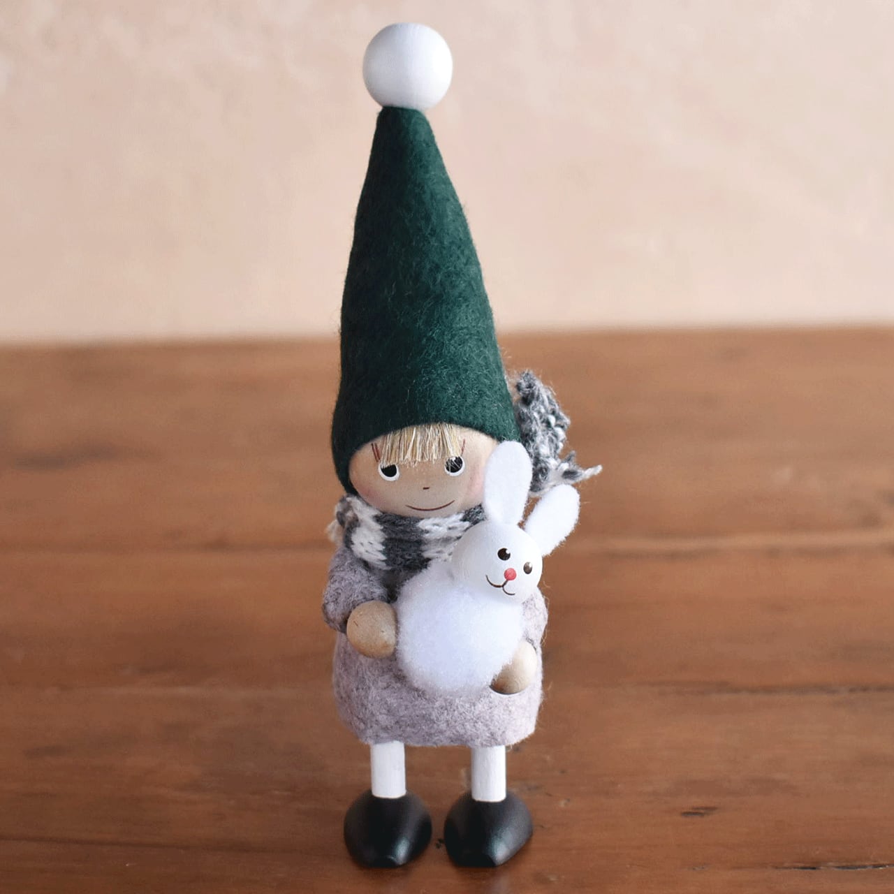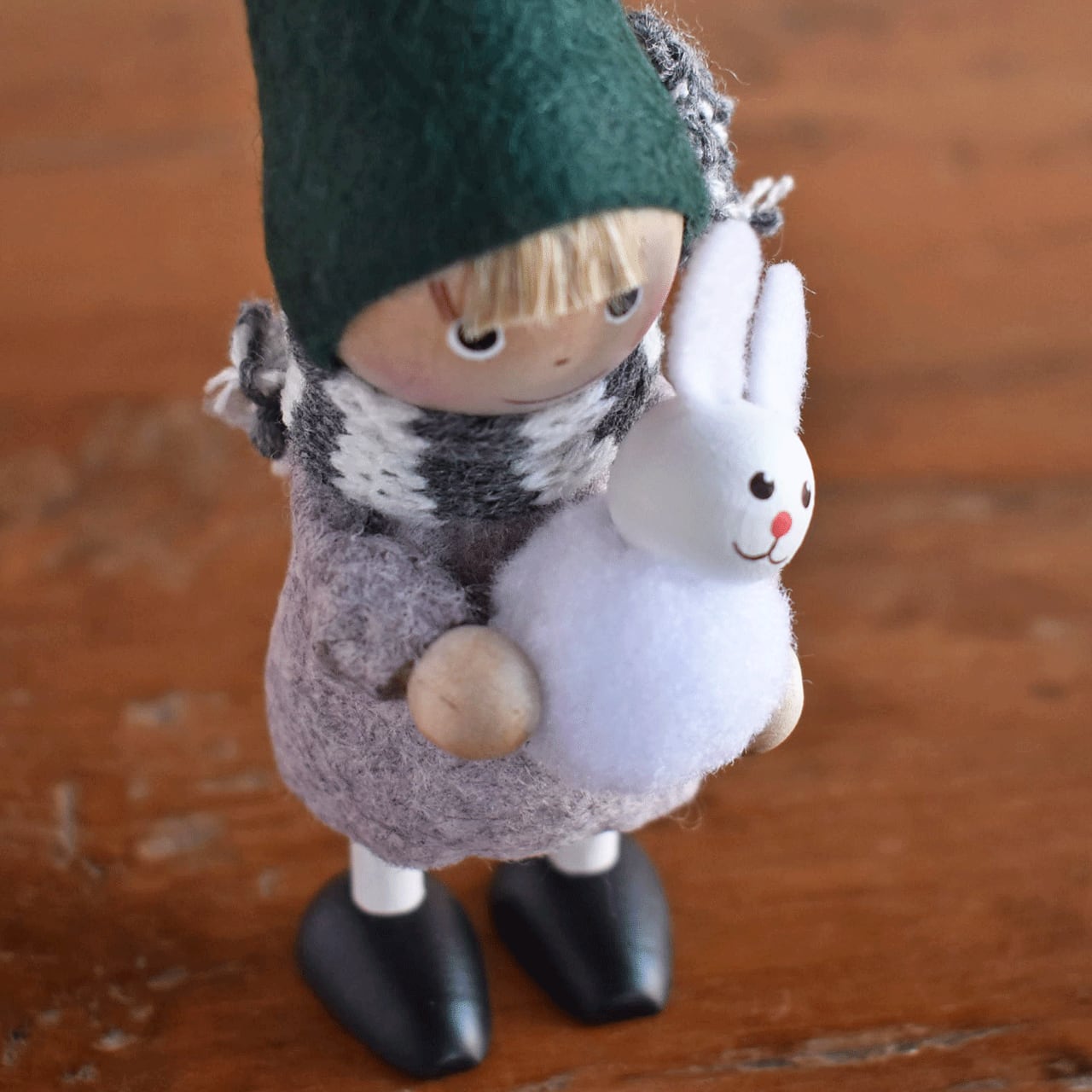 北欧で、古来より家や子供たちを守りクリスマスの時期にはサンタクロースのお手伝いをすると言い伝えられている「妖精ニッセ」。イタズラ好きで働き者のニッセが住む家には幸福が訪れると言われています。素朴でどこかあどけない木の人形は、1つ1つエストニアの職人たちの手によって作られたハンドメイド製。毛糸で編んだマフラーや両手で抱えているプレゼントのラッピング、リネンの生地の袋や素材感のある丸太など、人形だけでなく添えられた小物の細部に至るまで細かく丁寧に作られていて惚れ惚れします。