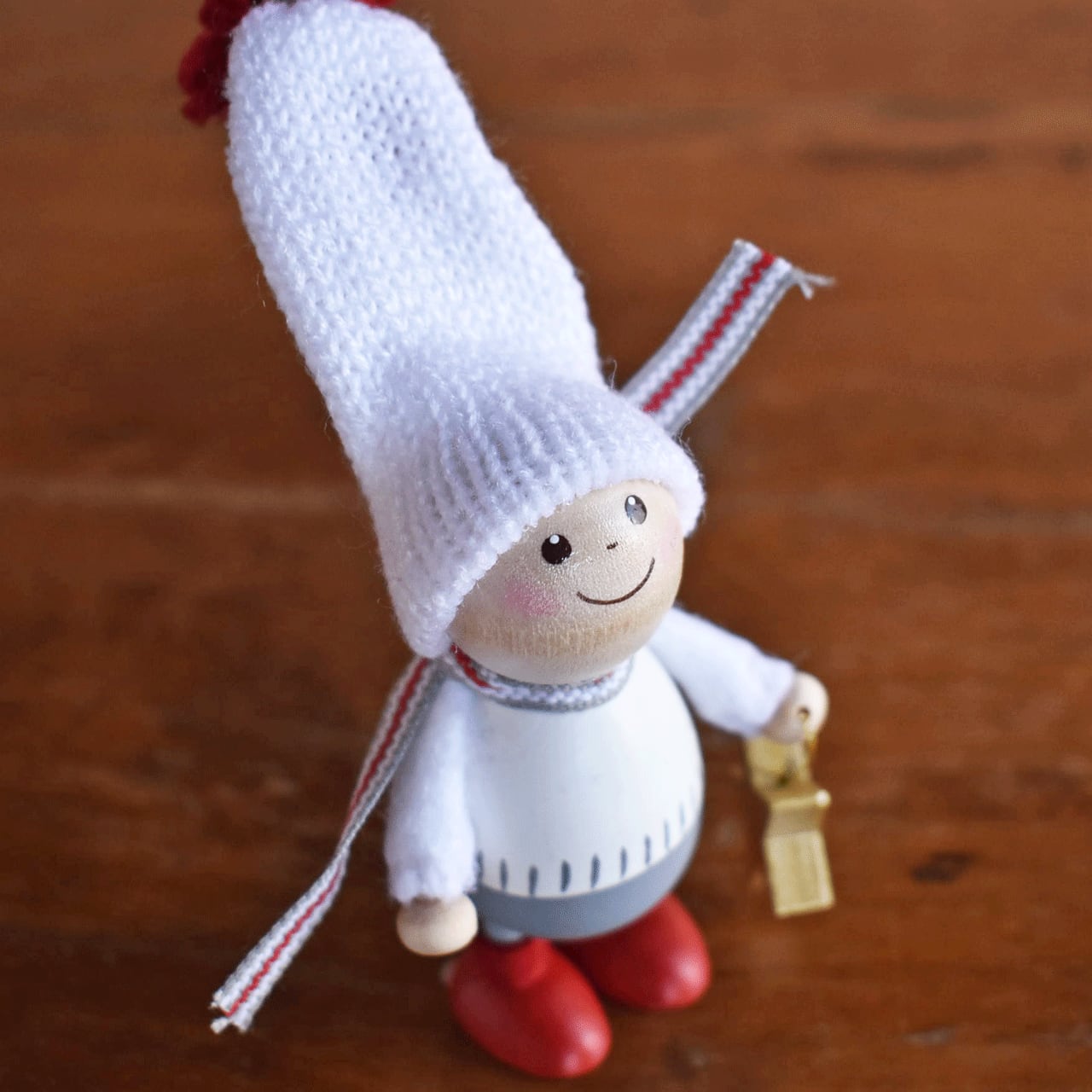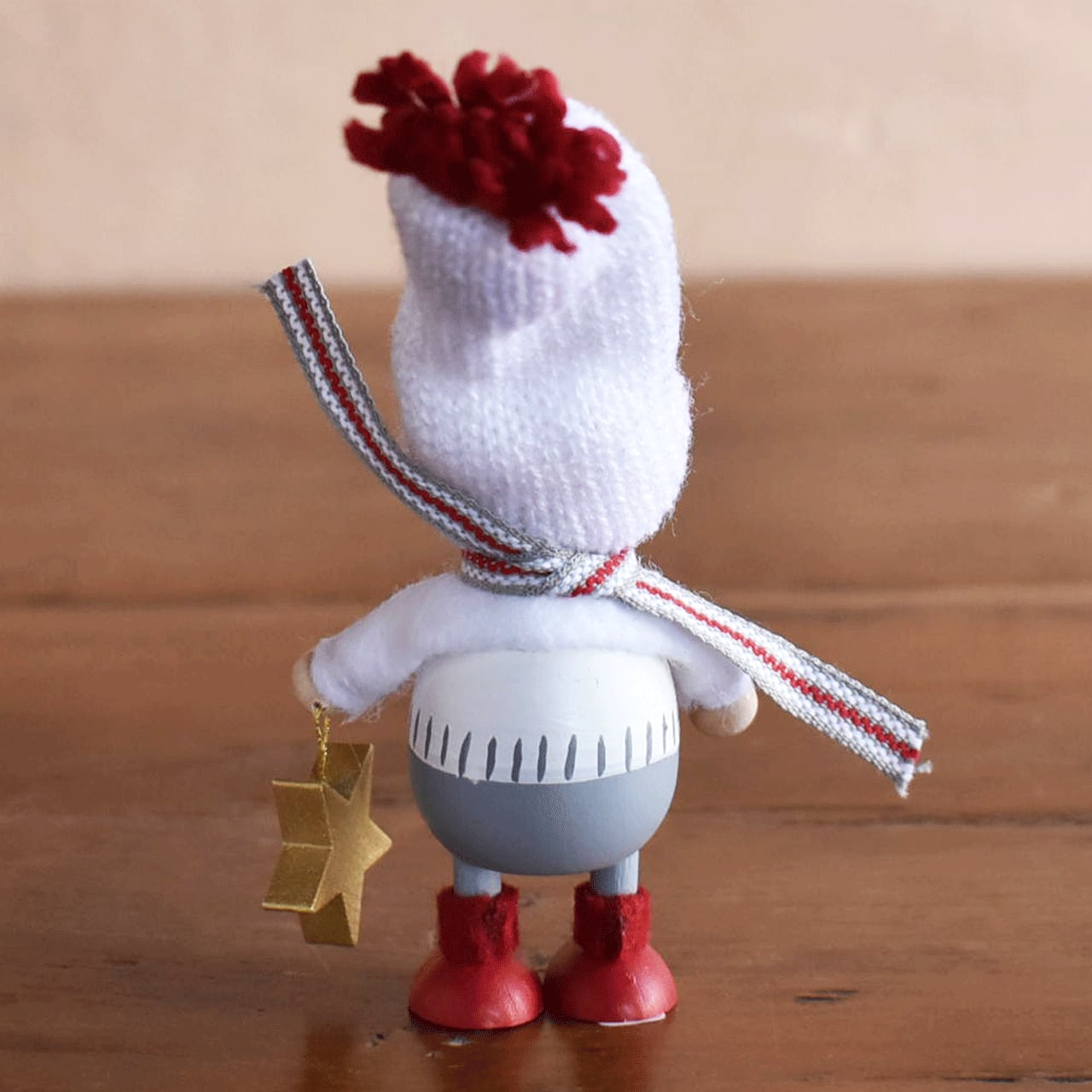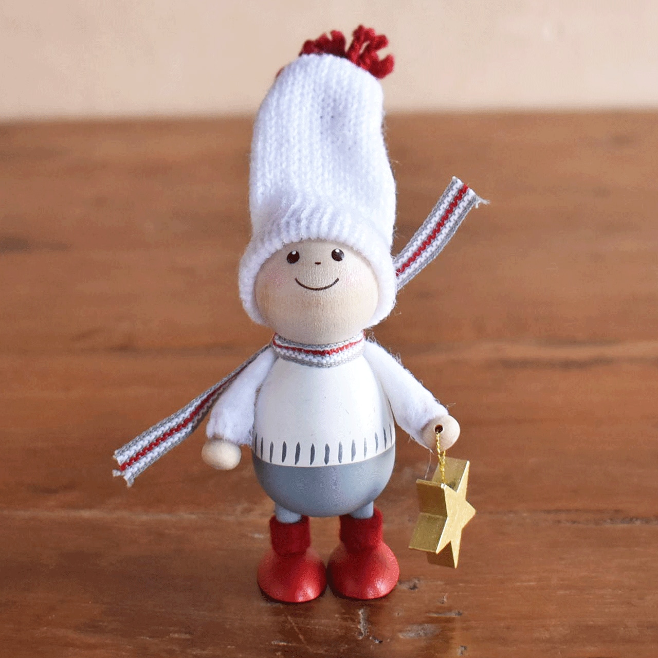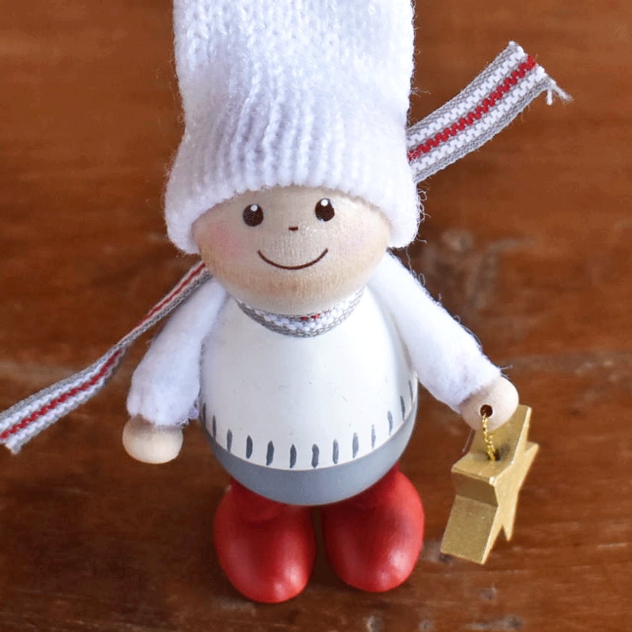 北欧で、古来より家や子供たちを守りクリスマスの時期にはサンタクロースのお手伝いをすると言い伝えられている「妖精ニッセ」。イタズラ好きで働き者のニッセが住む家には幸福が訪れると言われています。素朴でどこかあどけない木の人形は、1つ1つエストニアの職人たちの手によって作られたハンドメイド製。毛糸で編んだマフラーや両手で抱えているプレゼントのラッピング、リネンの生地の袋や素材感のある丸太など、人形だけでなく添えられた小物の細部に至るまで細かく丁寧に作られていて惚れ惚れします。