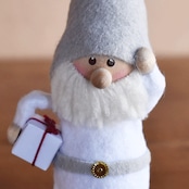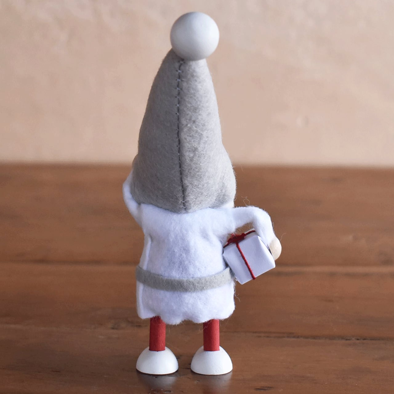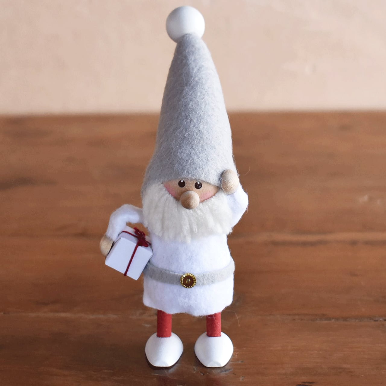 北欧で、古来より家や子供たちを守りクリスマスの時期にはサンタクロースのお手伝いをすると言い伝えられている「妖精ニッセ」。イタズラ好きで働き者のニッセが住む家には幸福が訪れると言われています。素朴でどこかあどけない木の人形は、1つ1つエストニアの職人たちの手によって作られたハンドメイド製。毛糸で編んだマフラーや両手で抱えているプレゼントのラッピング、リネンの生地の袋や素材感のある丸太など、人形だけでなく添えられた小物の細部に至るまで細かく丁寧に作られていて惚れ惚れします。