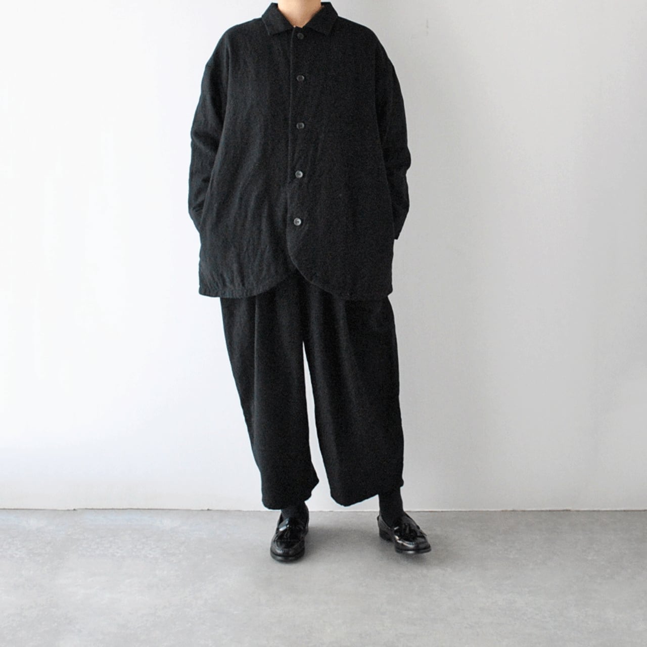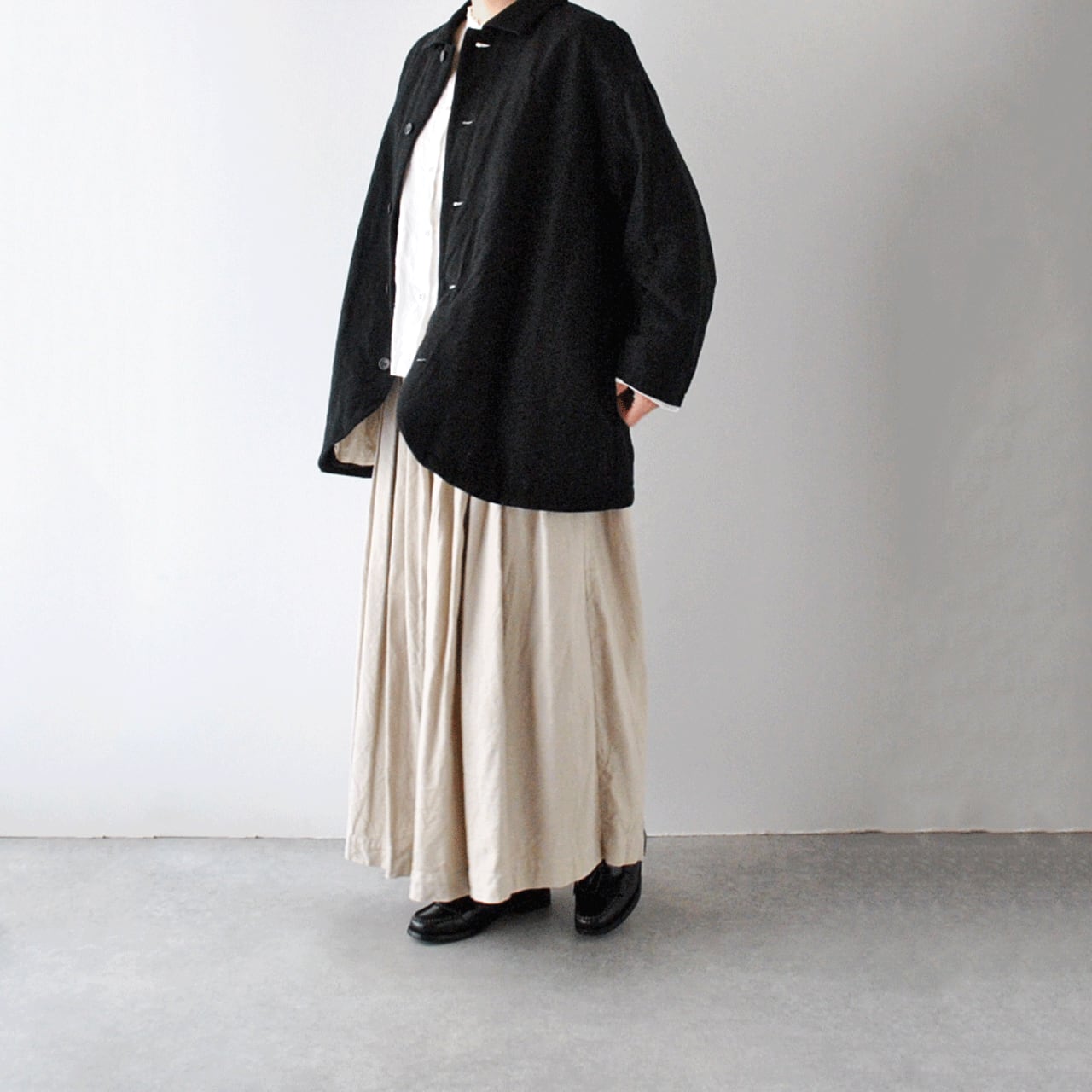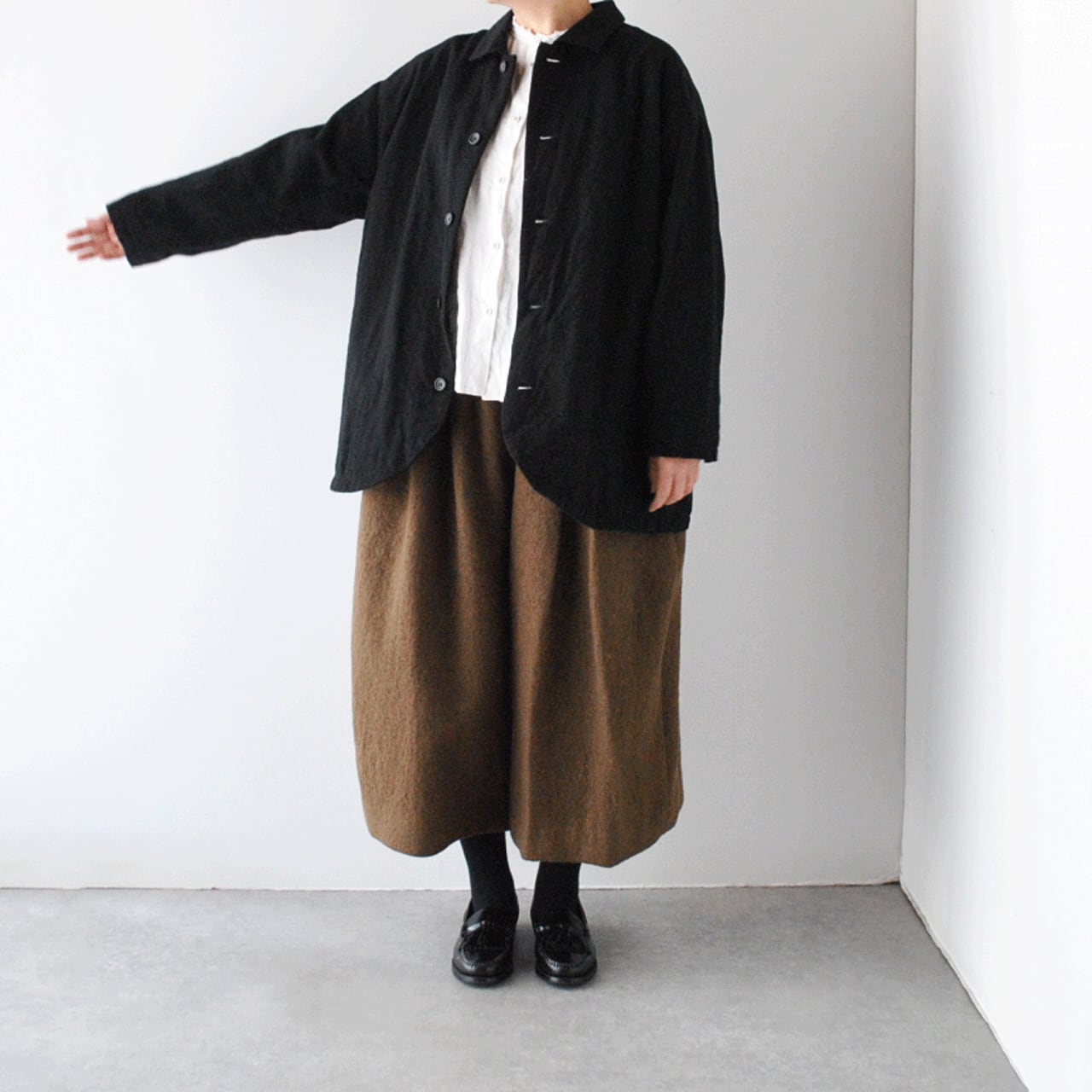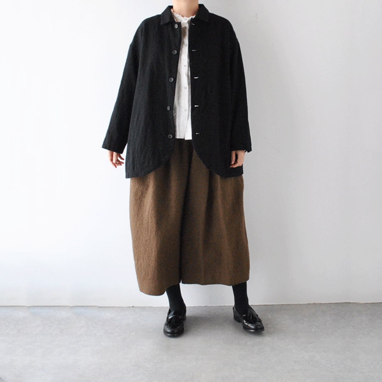 ROBE de PEAUから、ウール×コットン生地に洗いをかけたヴィンテージのような風合いが素敵なジャケットが届きました。少し長めの丈感のオーバーサイズが絶妙で、デニムからスカートまで様々なスタイルにサッと気軽に羽織るだけでとっても雰囲気よく楽しめるオススメの一枚です。ワンピースにもゆったりと羽織れて、とっても可愛いですよ。ふっくらとした生地感で、着心地も軽いです。コットンの裏地付きなので着脱もとってもスムーズ。程よく力の抜けた大人のリラックススタイルを楽しんでくださいね。