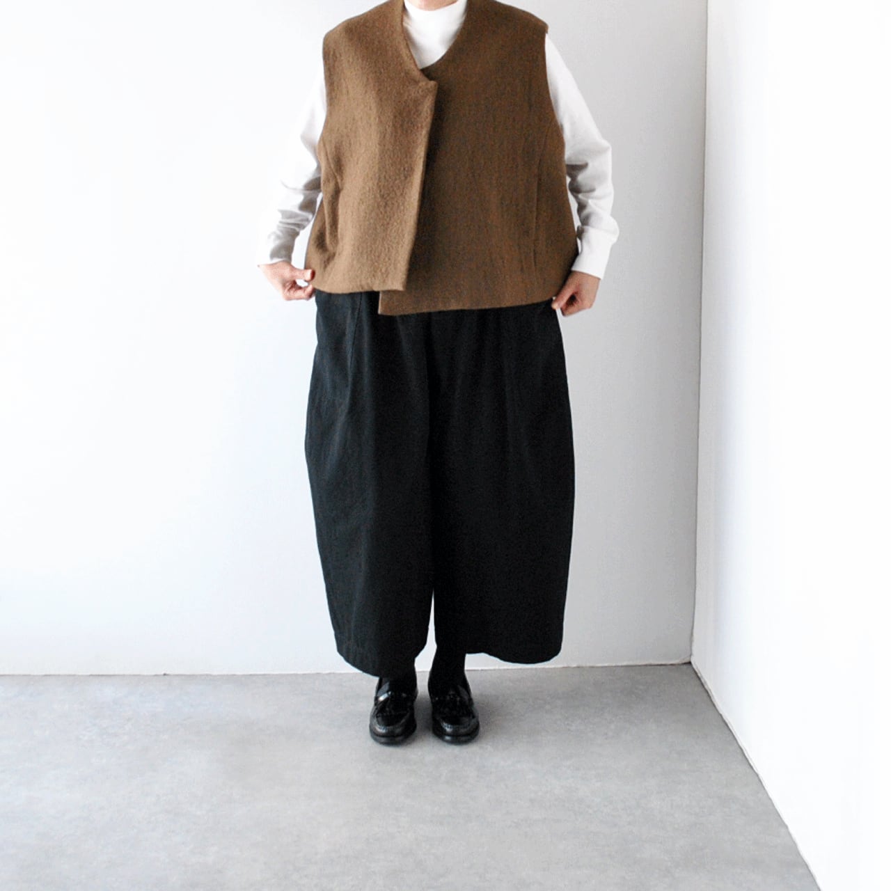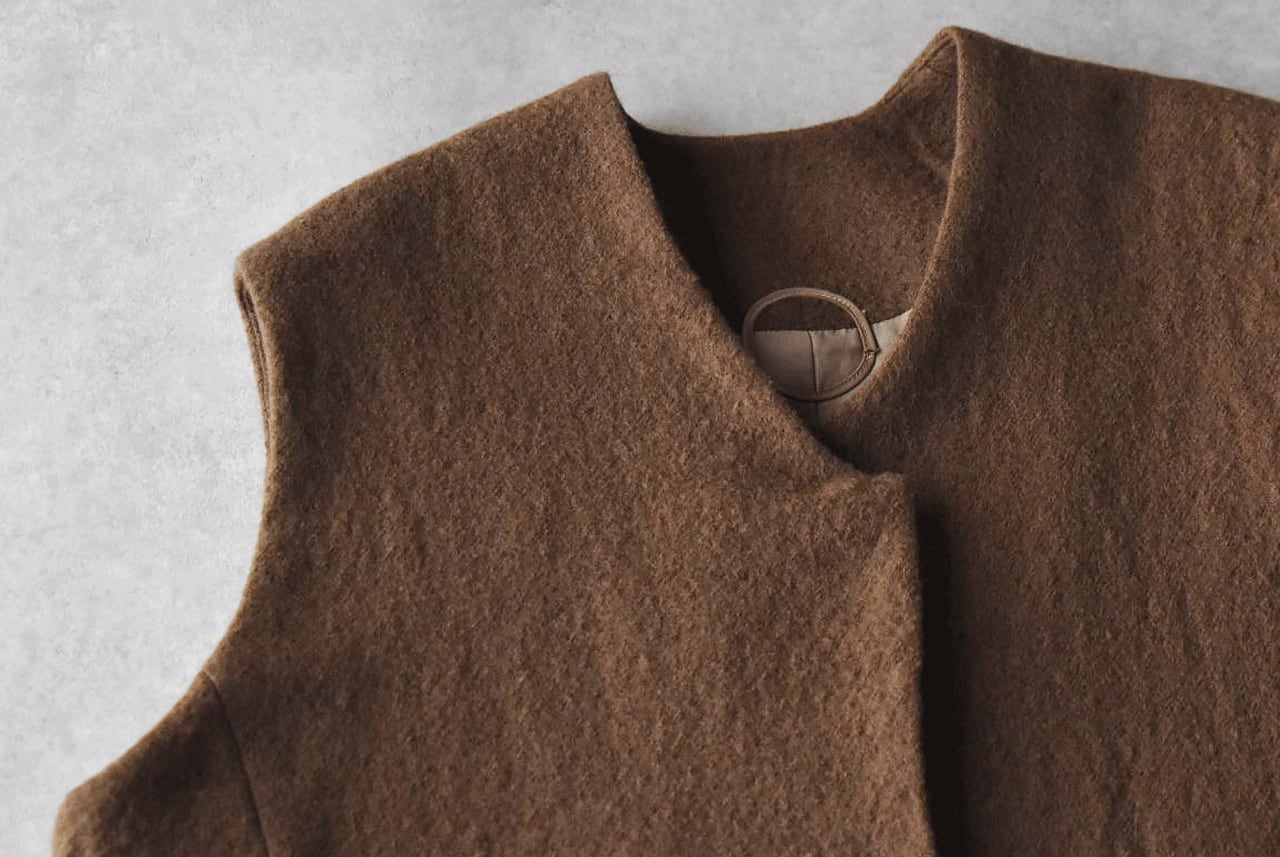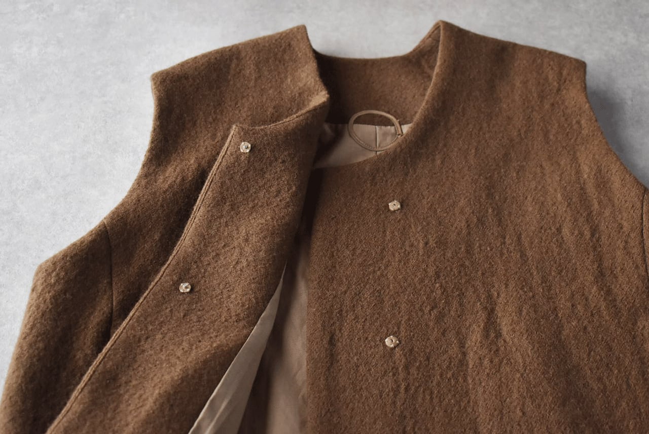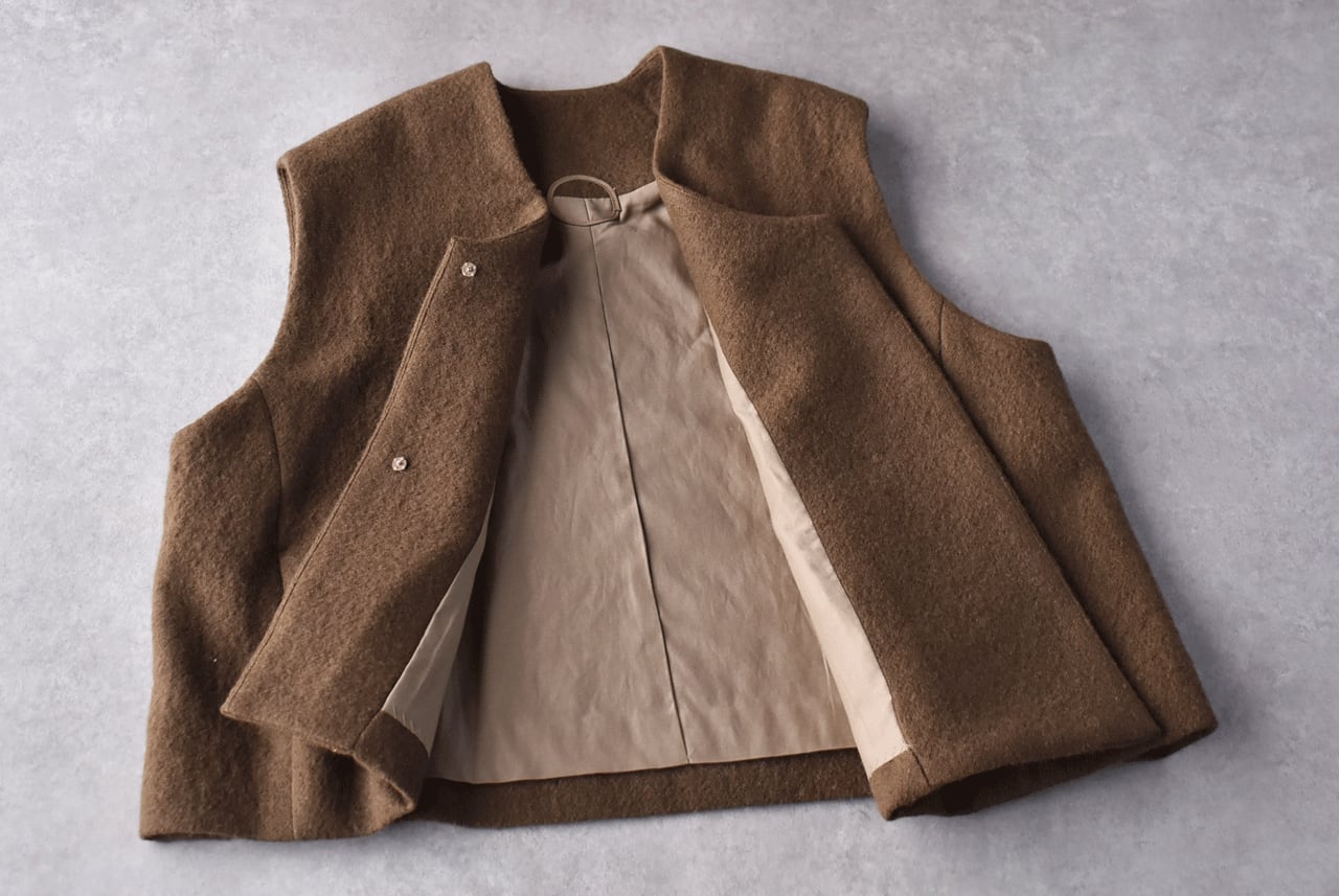 Atelier d'antanから、上質なイタリア製の縮絨ウールで仕立てた新作ベスト「グレコ」が届きました。しっかりとした厚みがあるのでとても温かく、左右の前丈に差を持たせたアシンメトリーデザインがダンタンらしい一枚です。様々なボトムと本当に相性がよく、全体のコーディネートを何とも言えない良い雰囲気に仕上げてくれますよ。ふっくらとした質感で着心地も軽く、スナップ式の前ボタン、滑りの良いキュプラの裏地付きで着脱もストレスフリー。アームホール、肩幅が広く、ニットの上からでもゆったりとゆったりと羽織って頂けます。同素材のワイドパンツとのセットアップもとても素敵ですよ。