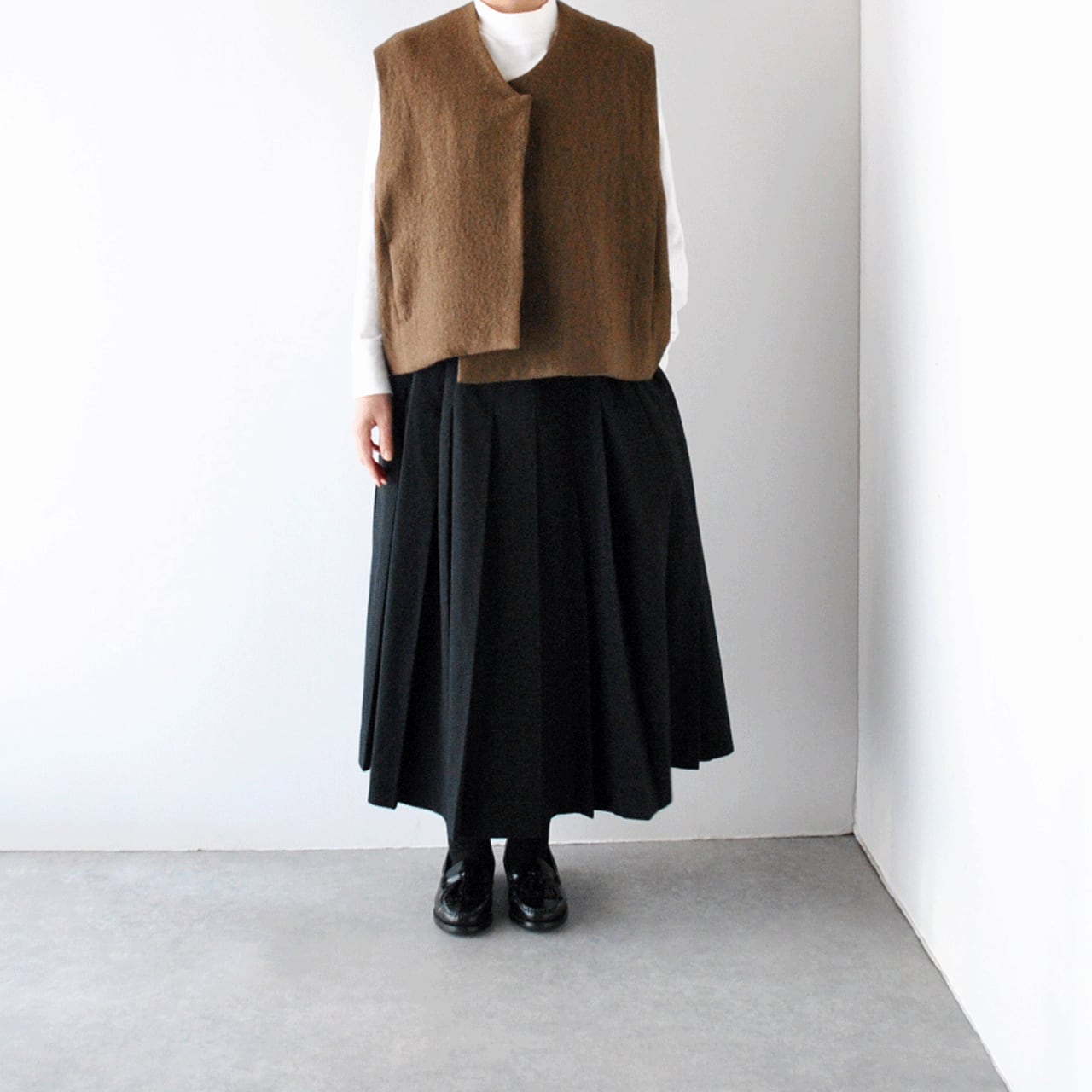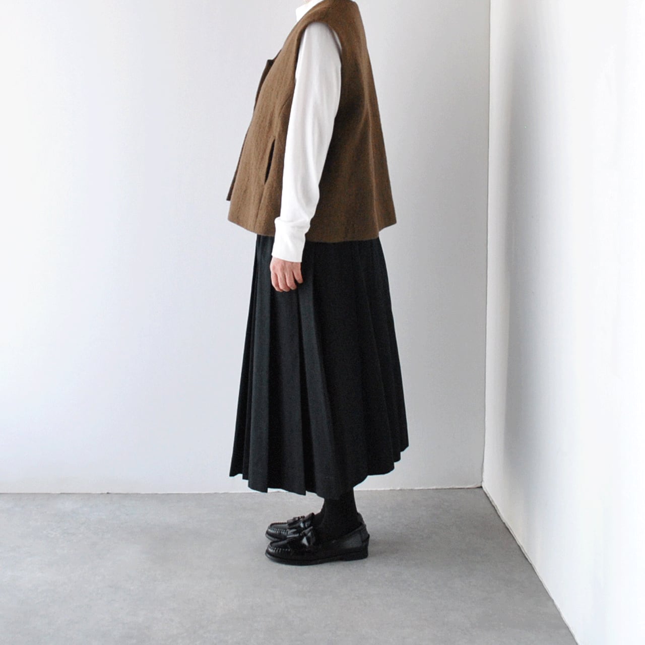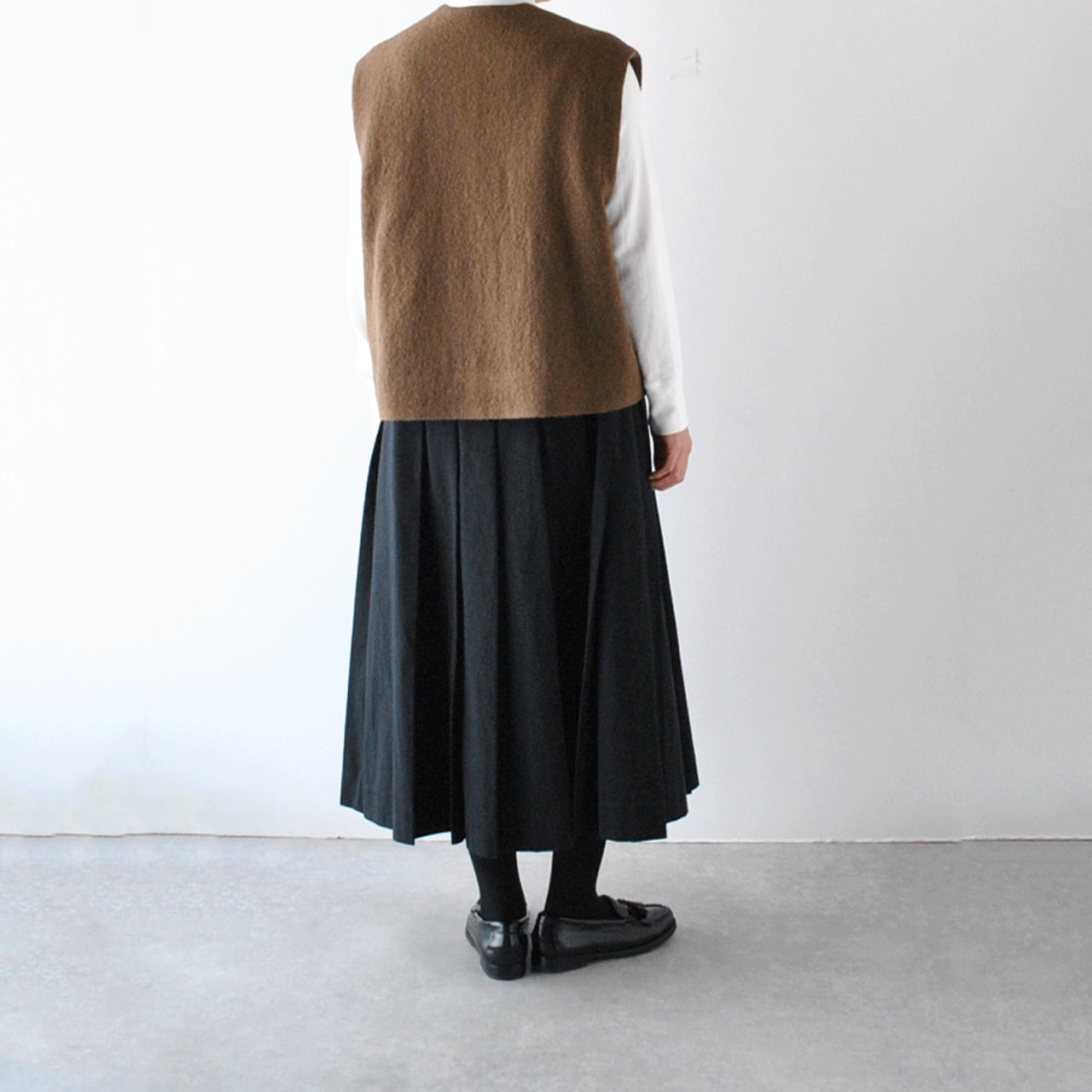 Atelier d'antanから、上質なイタリア製の縮絨ウールで仕立てた新作ベスト「グレコ」が届きました。しっかりとした厚みがあるのでとても温かく、左右の前丈に差を持たせたアシンメトリーデザインがダンタンらしい一枚です。様々なボトムと本当に相性がよく、全体のコーディネートを何とも言えない良い雰囲気に仕上げてくれますよ。ふっくらとした質感で着心地も軽く、スナップ式の前ボタン、滑りの良いキュプラの裏地付きで着脱もストレスフリー。アームホール、肩幅が広く、ニットの上からでもゆったりとゆったりと羽織って頂けます。同素材のワイドパンツとのセットアップもとても素敵ですよ。