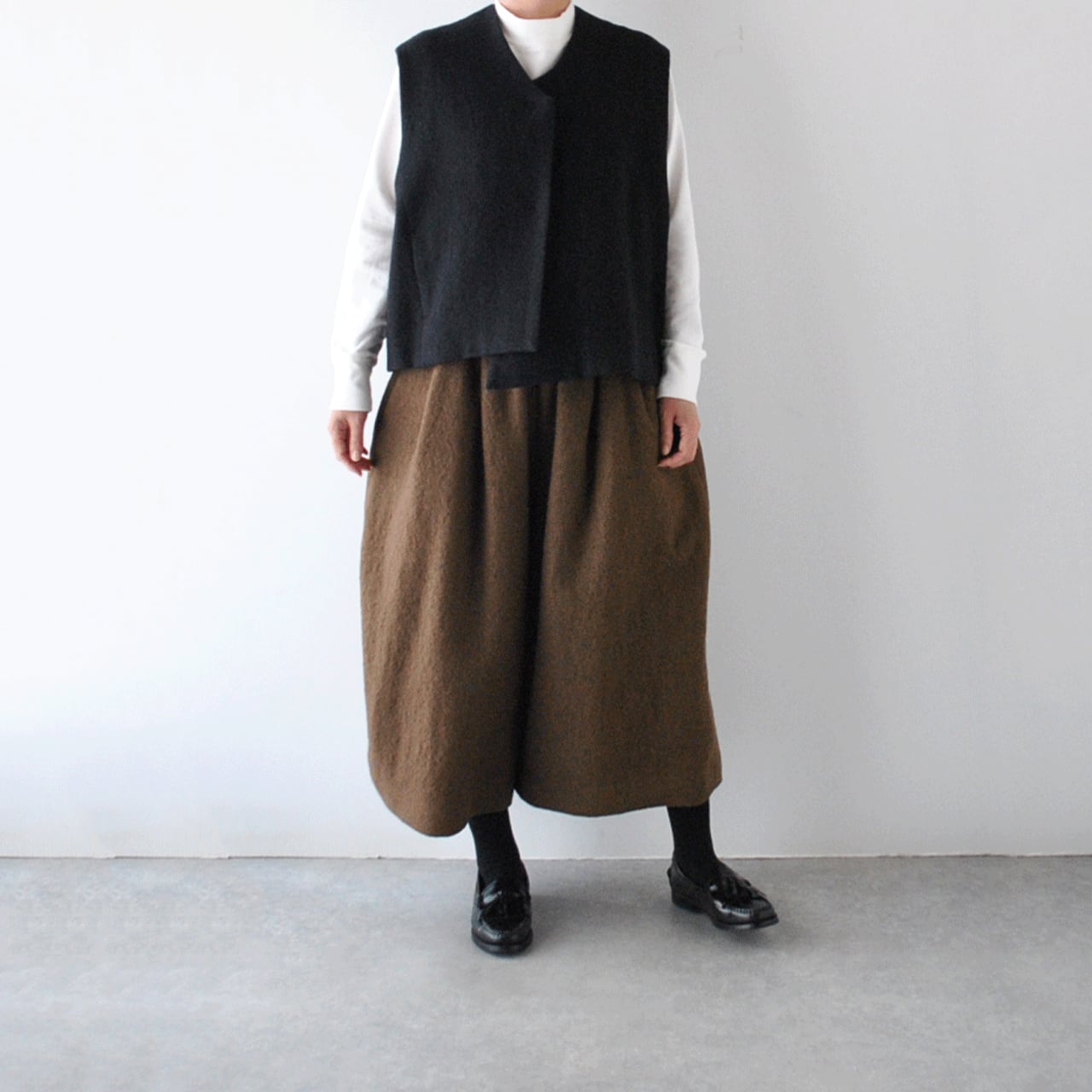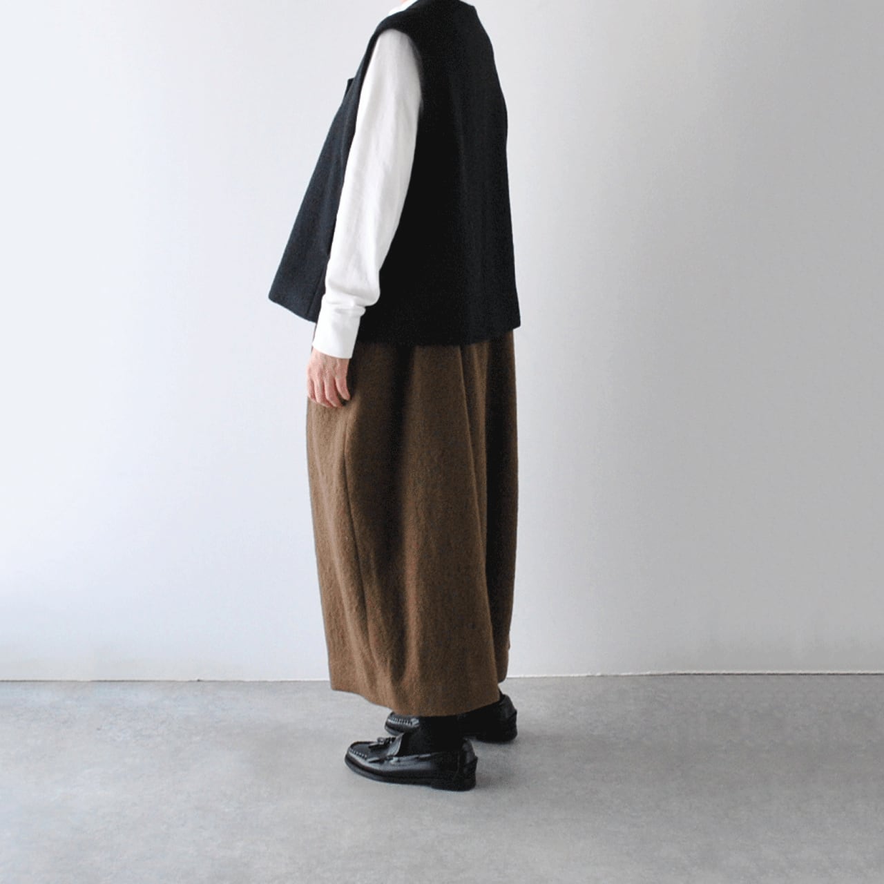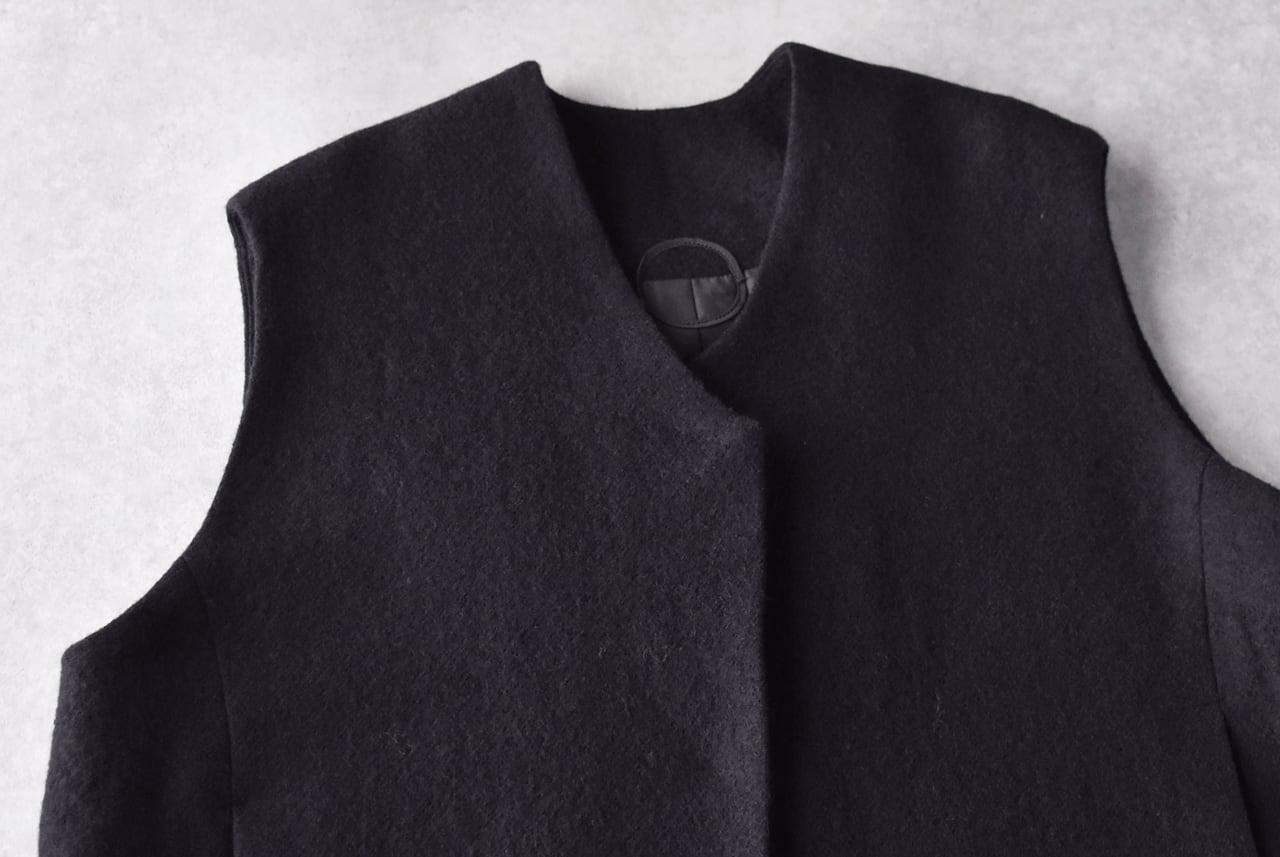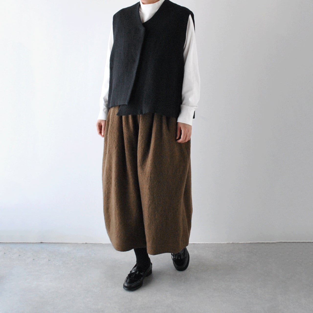 Atelier d'antanから、上質なイタリア製の縮絨ウールで仕立てた新作ベスト「グレコ」が届きました。しっかりとした厚みがあるのでとても温かく、左右の前丈に差を持たせたアシンメトリーデザインがダンタンらしい一枚です。様々なボトムと本当に相性がよく、全体のコーディネートを何とも言えない良い雰囲気に仕上げてくれますよ。ふっくらとした質感で着心地も軽く、スナップ式の前ボタン、滑りの良いキュプラの裏地付きで着脱もストレスフリー。アームホール、肩幅が広く、ニットの上からでもゆったりとゆったりと羽織って頂けます。同素材のワイドパンツとのセットアップもとても素敵ですよ。