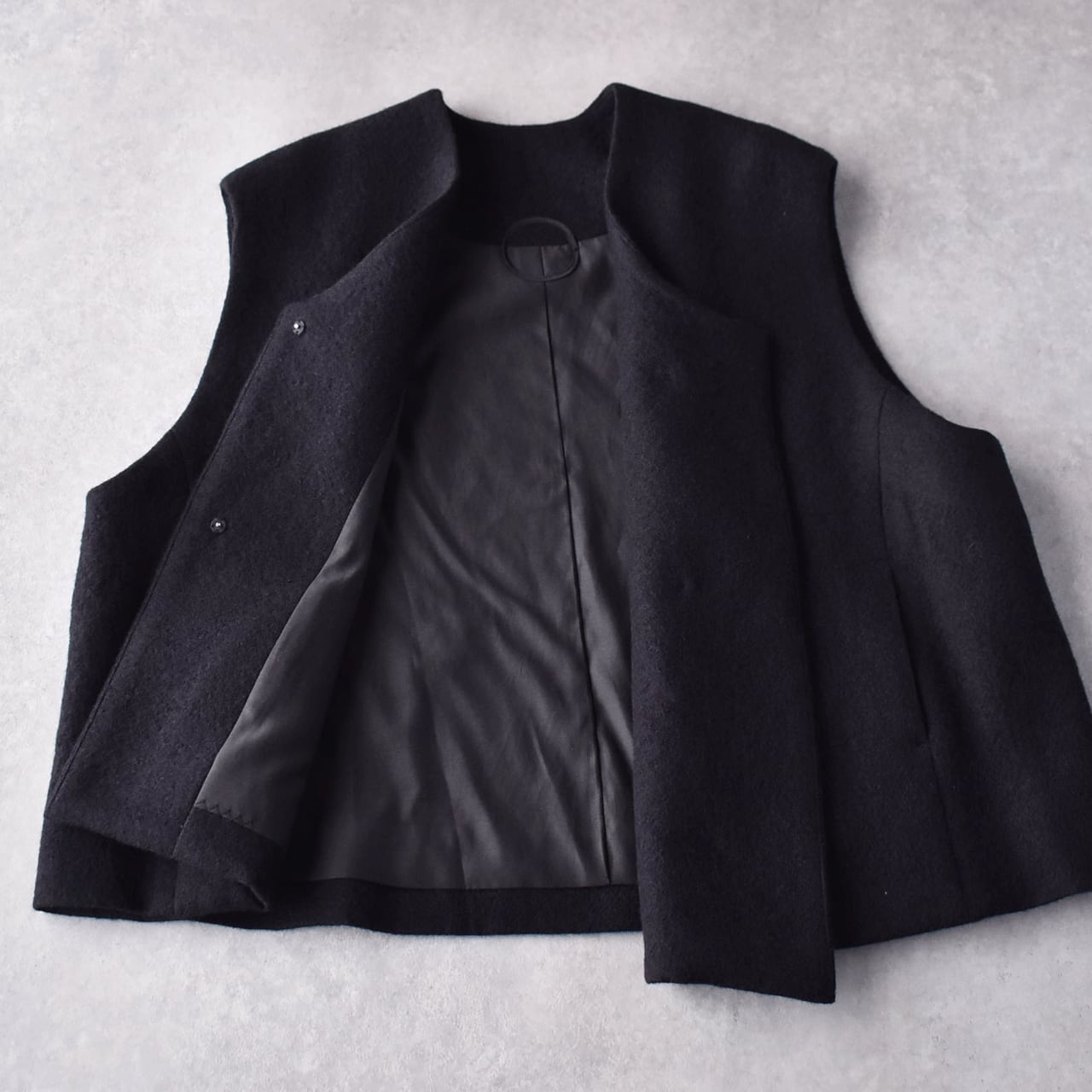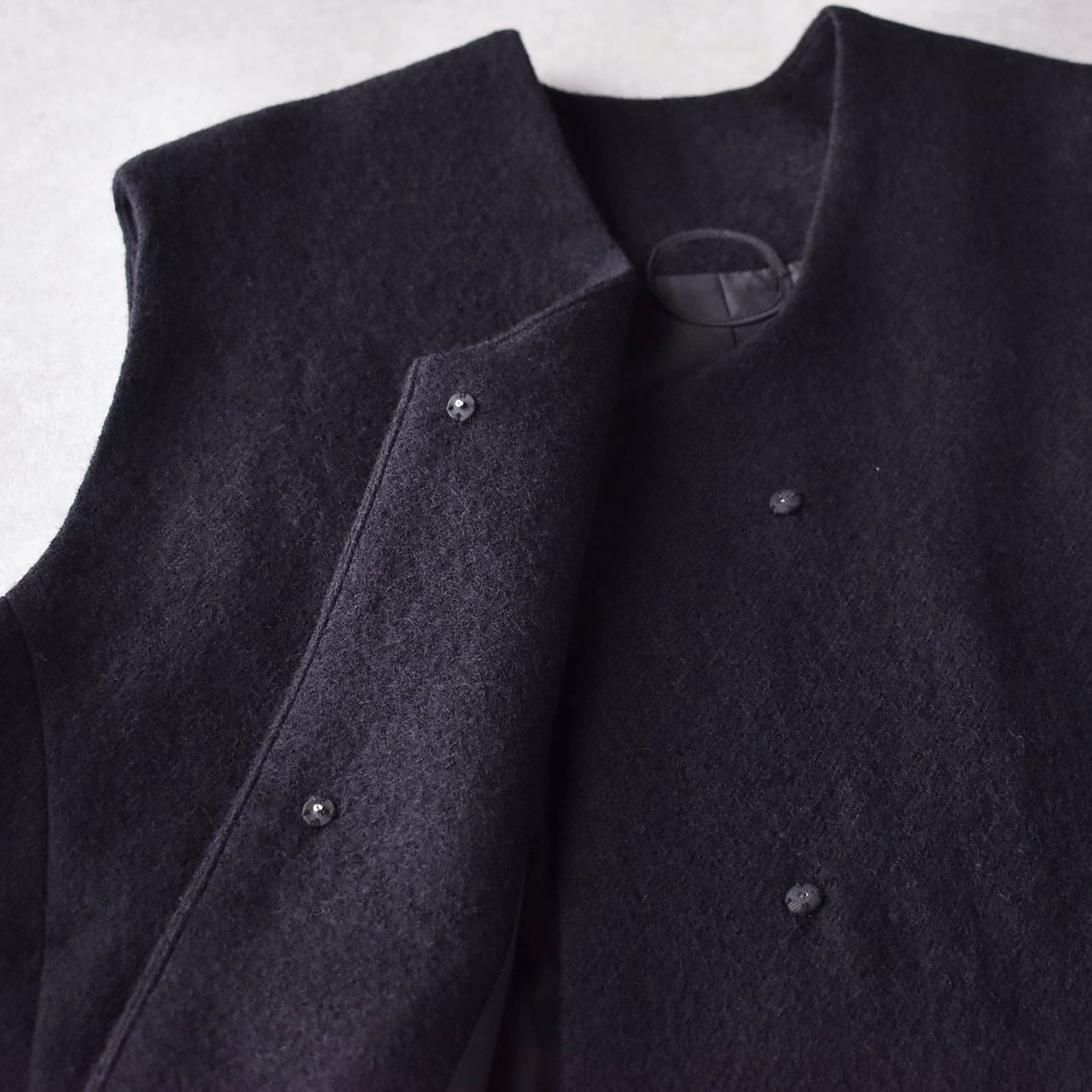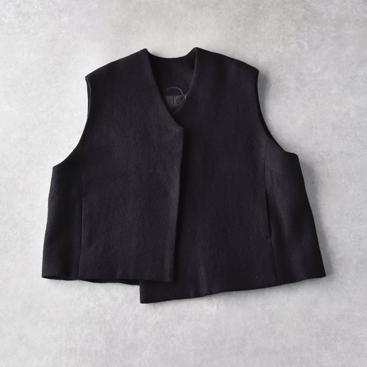 Atelier d'antanから、上質なイタリア製の縮絨ウールで仕立てた新作ベスト「グレコ」が届きました。しっかりとした厚みがあるのでとても温かく、左右の前丈に差を持たせたアシンメトリーデザインがダンタンらしい一枚です。様々なボトムと本当に相性がよく、全体のコーディネートを何とも言えない良い雰囲気に仕上げてくれますよ。ふっくらとした質感で着心地も軽く、スナップ式の前ボタン、滑りの良いキュプラの裏地付きで着脱もストレスフリー。アームホール、肩幅が広く、ニットの上からでもゆったりとゆったりと羽織って頂けます。同素材のワイドパンツとのセットアップもとても素敵ですよ。