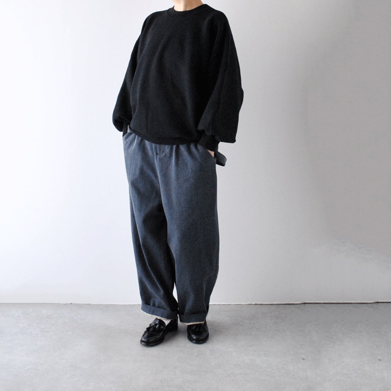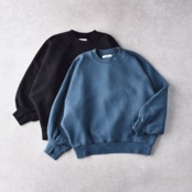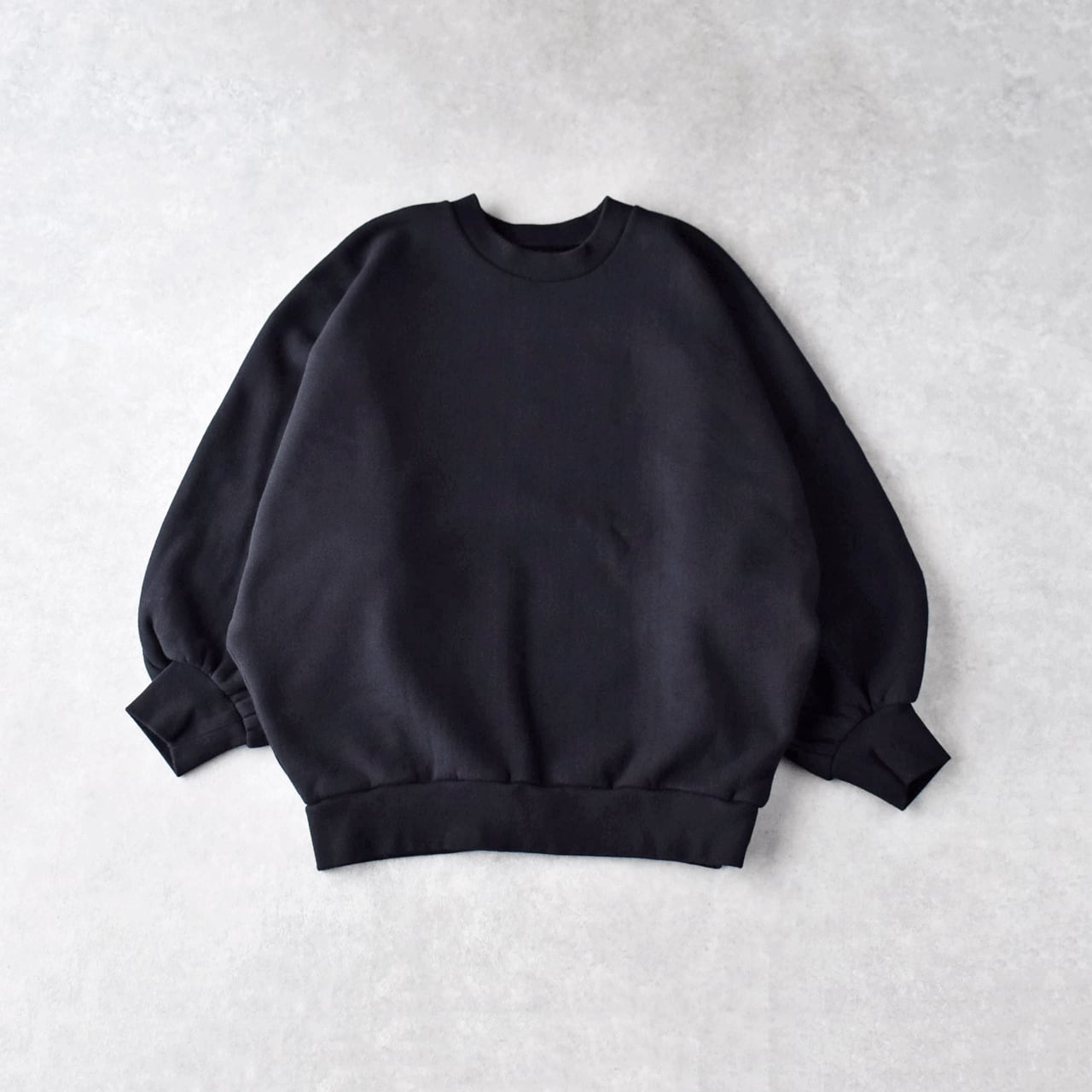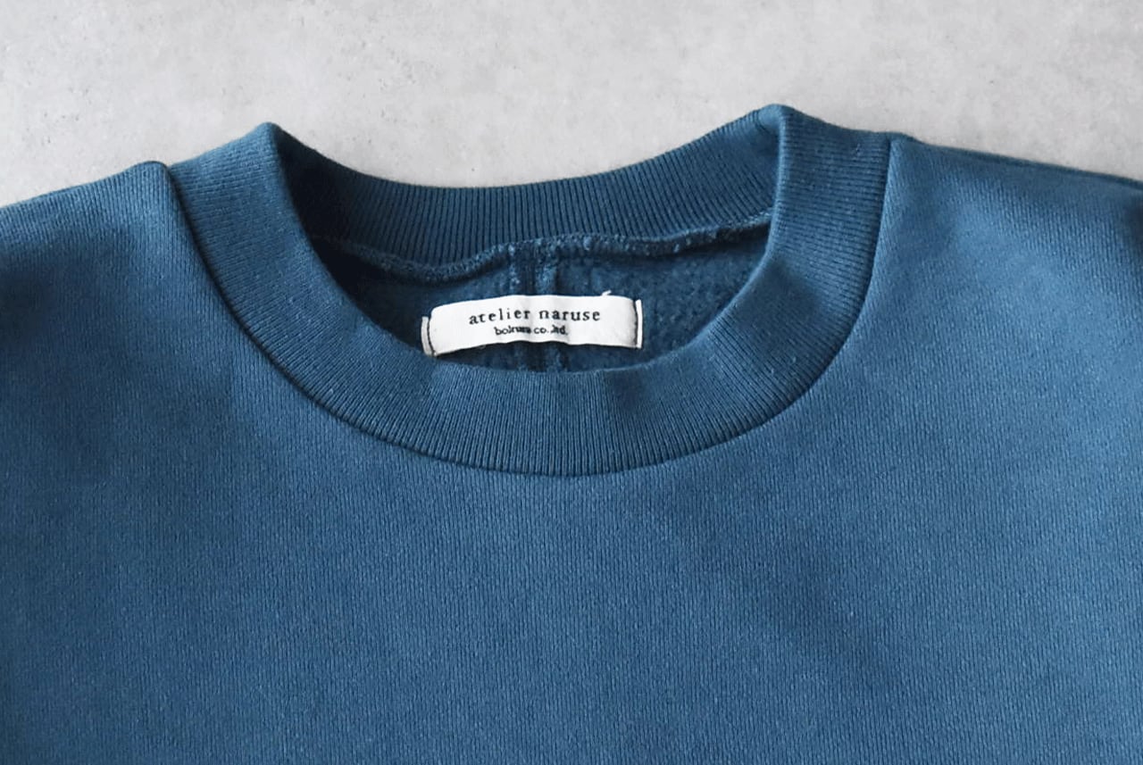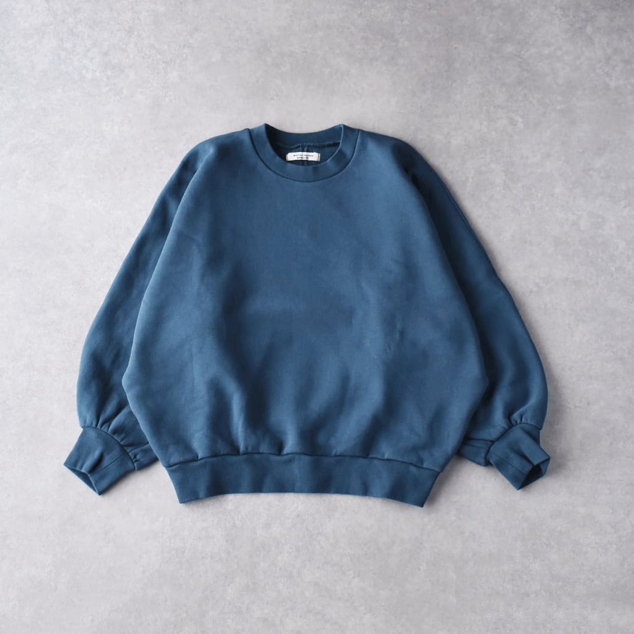 ボディと袖が一体になった個性的なデザインがatelier naruseらしいスウェットプルオーバー。身体がまるでバルーンの中にいるようなリラックス感たっぷりの一枚ですよ。ネックと袖口のリブは程よく詰まっているので、ふっくらとした愛らしいフォルムで楽しんで頂けます。カジュアルな中にもどこかモードな雰囲気があるのも素敵。旧式の編み機でゆっくりゆっくり編み上げた吊裏毛スウェットは、しっかりと目が詰まっていながらふっくら柔らかで、まるで毛布にくるまれているような温かさ。家の中でも外でも一日中着ていたくなると思いますよ。