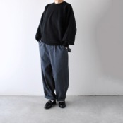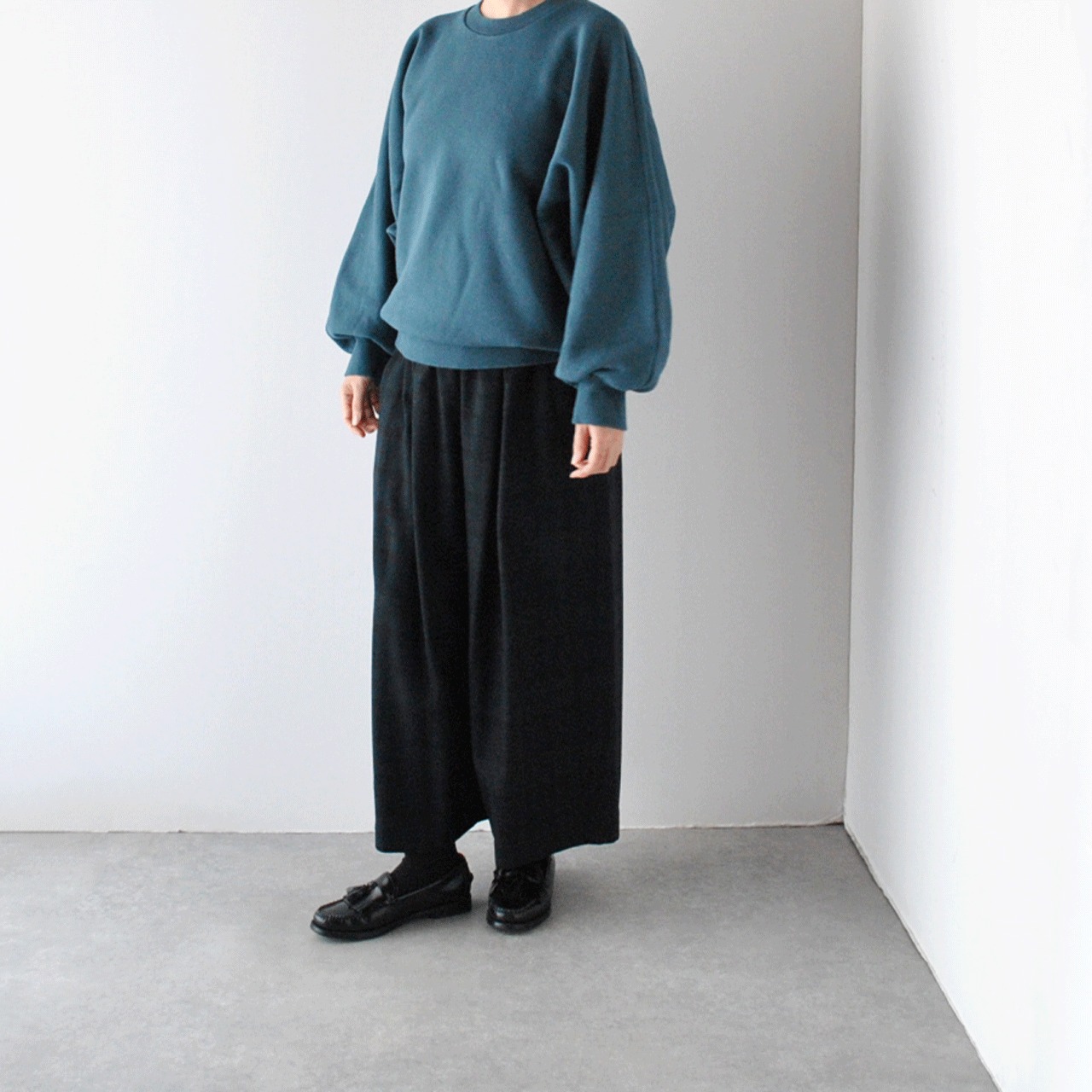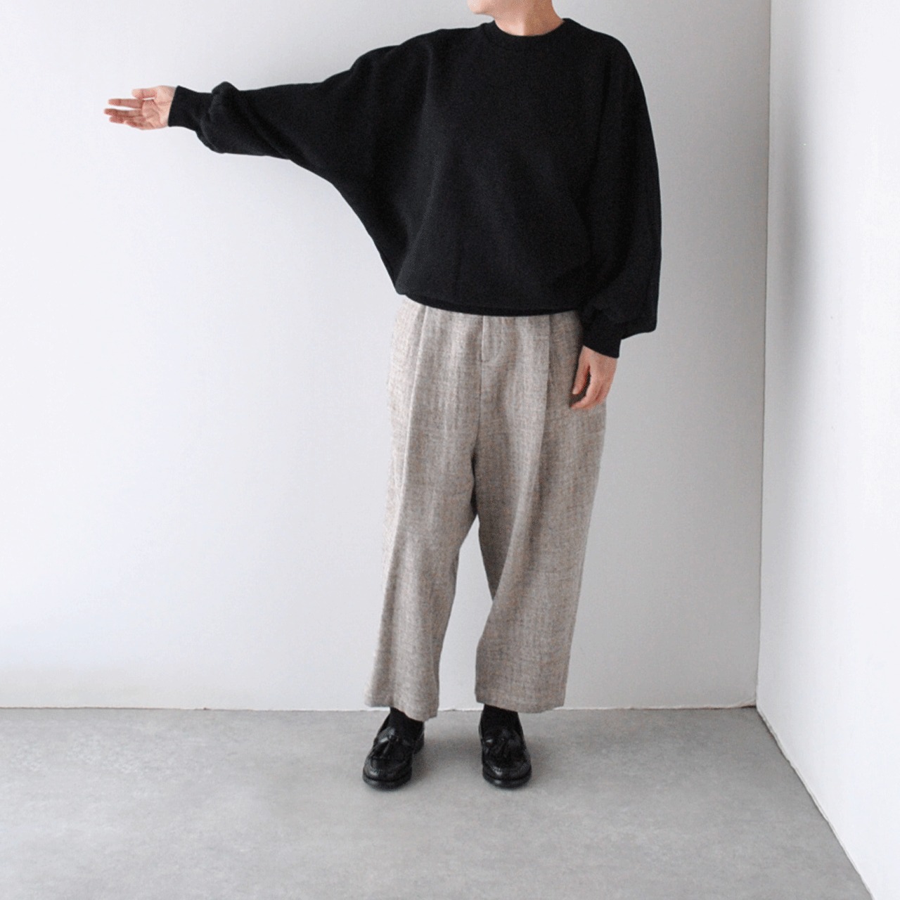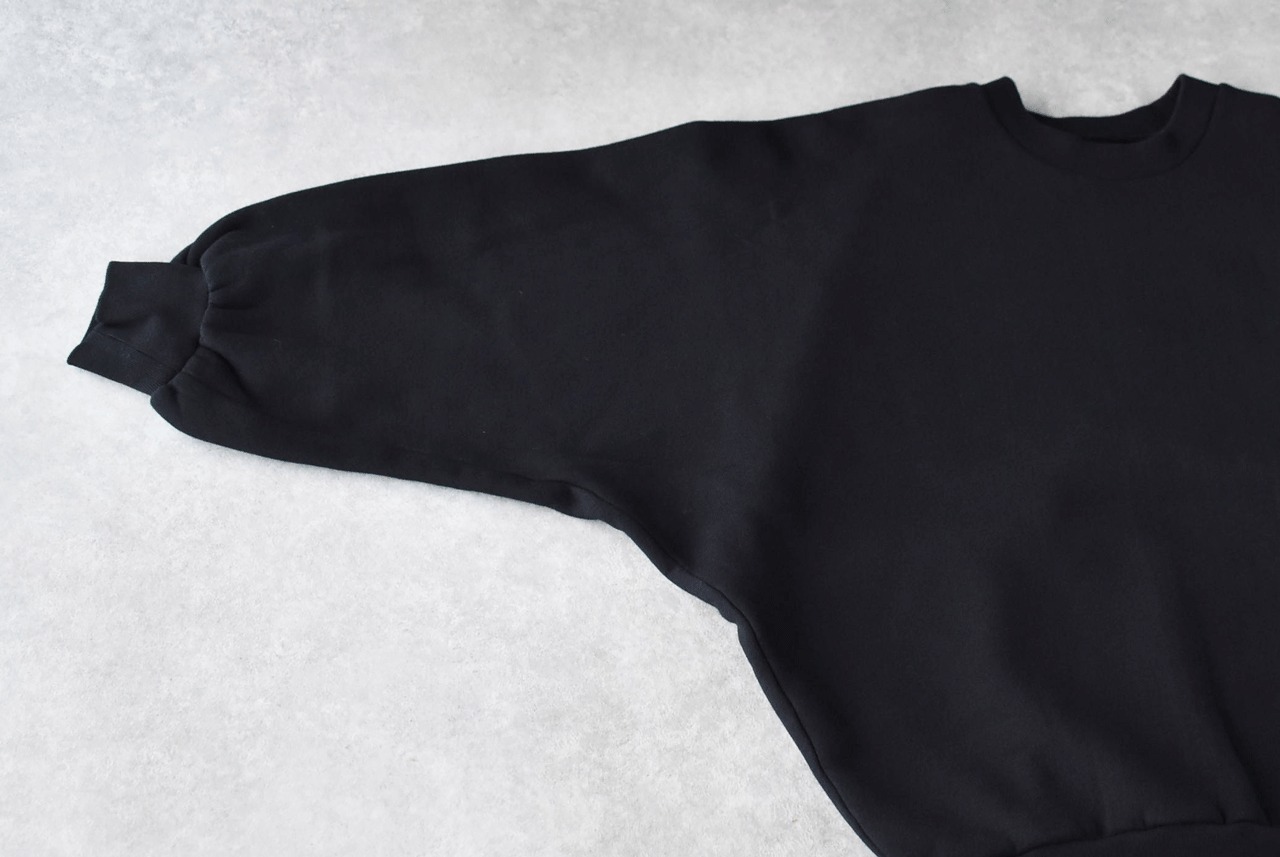 ボディと袖が一体になった個性的なデザインがatelier naruseらしいスウェットプルオーバー。身体がまるでバルーンの中にいるようなリラックス感たっぷりの一枚ですよ。ネックと袖口のリブは程よく詰まっているので、ふっくらとした愛らしいフォルムで楽しんで頂けます。カジュアルな中にもどこかモードな雰囲気があるのも素敵。旧式の編み機でゆっくりゆっくり編み上げた吊裏毛スウェットは、しっかりと目が詰まっていながらふっくら柔らかで、まるで毛布にくるまれているような温かさ。家の中でも外でも一日中着ていたくなると思いますよ。
