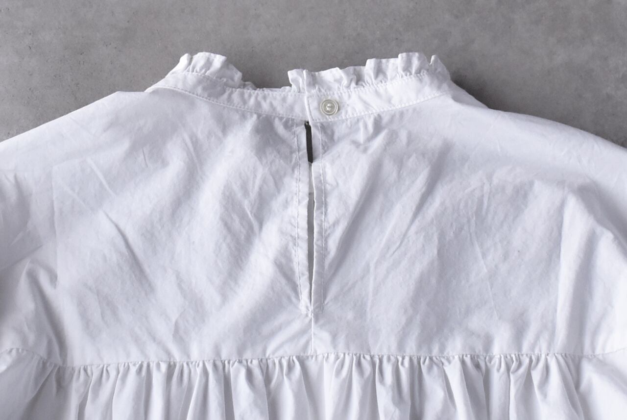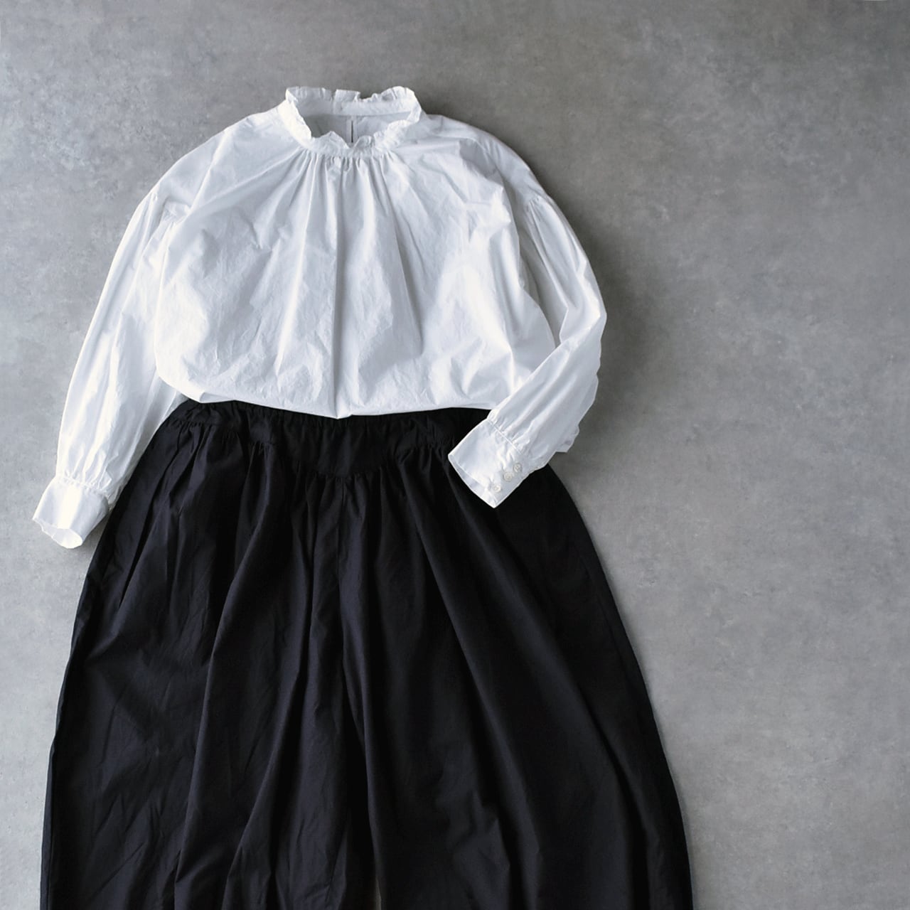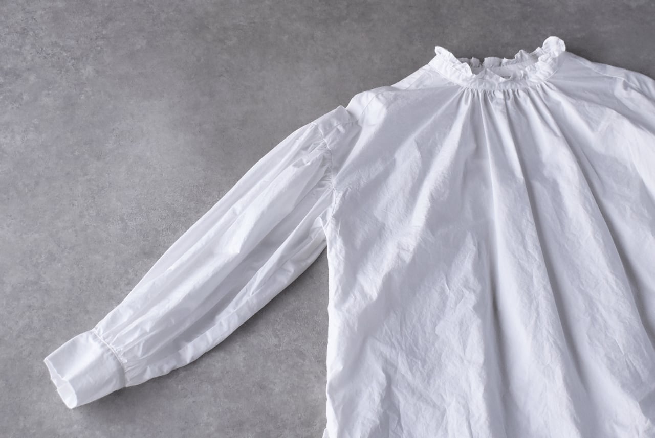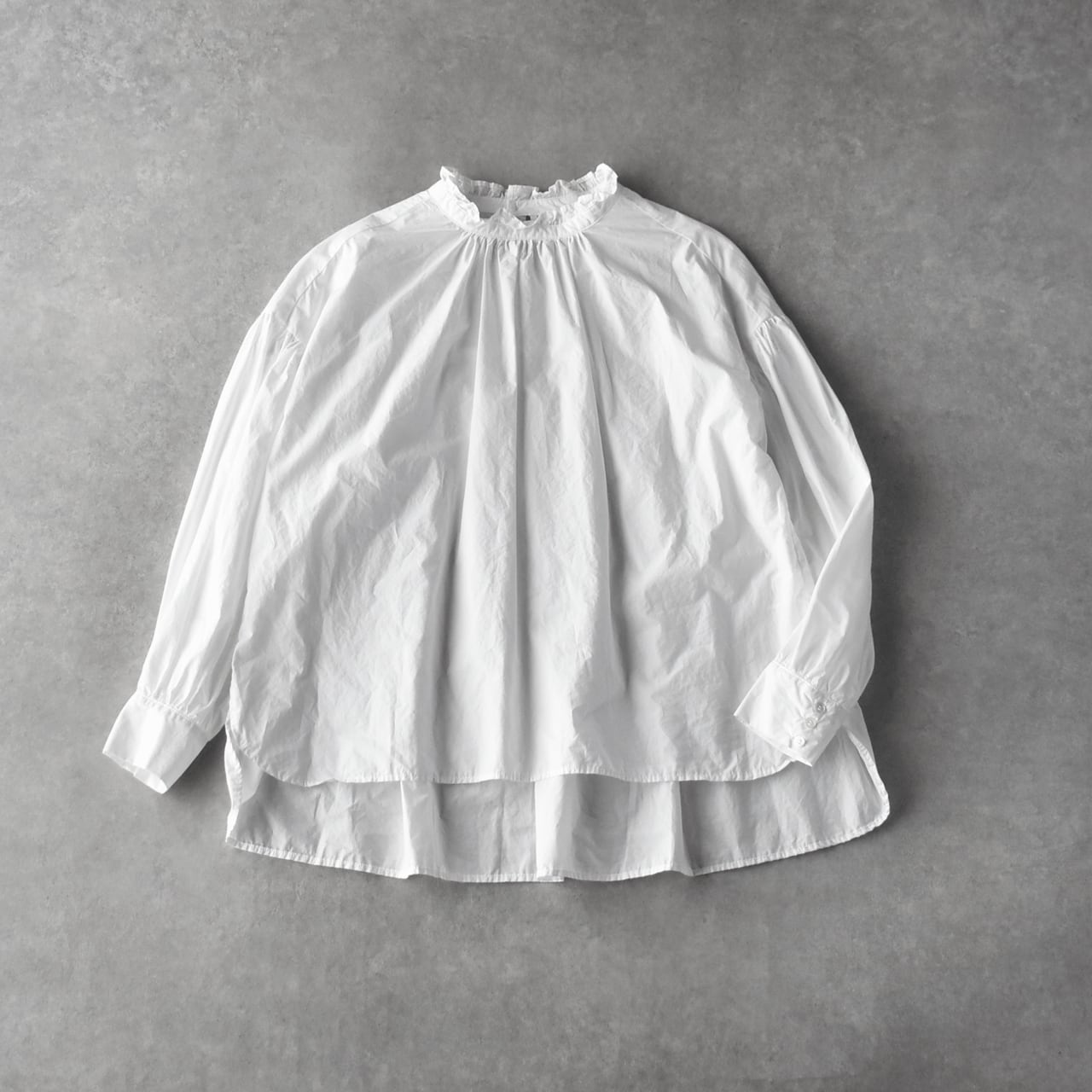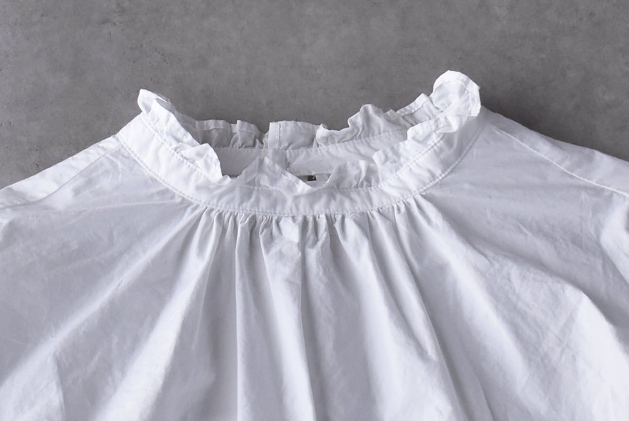 Gauze# から、シンプルながら凛とした存在感を放つプルオーバーブラウスが届きました。襟のフリルが印象的で、普段使いからちょっとかしこまったシーンまで、幅広く使って頂ける一枚です。空気を含ませる様に織り上げたタイプライターコットンもふっくらとしてとても上質な生地感。サロペットのインナーとしてフリルを活かしたコーディネートで楽しむのもオススメ。