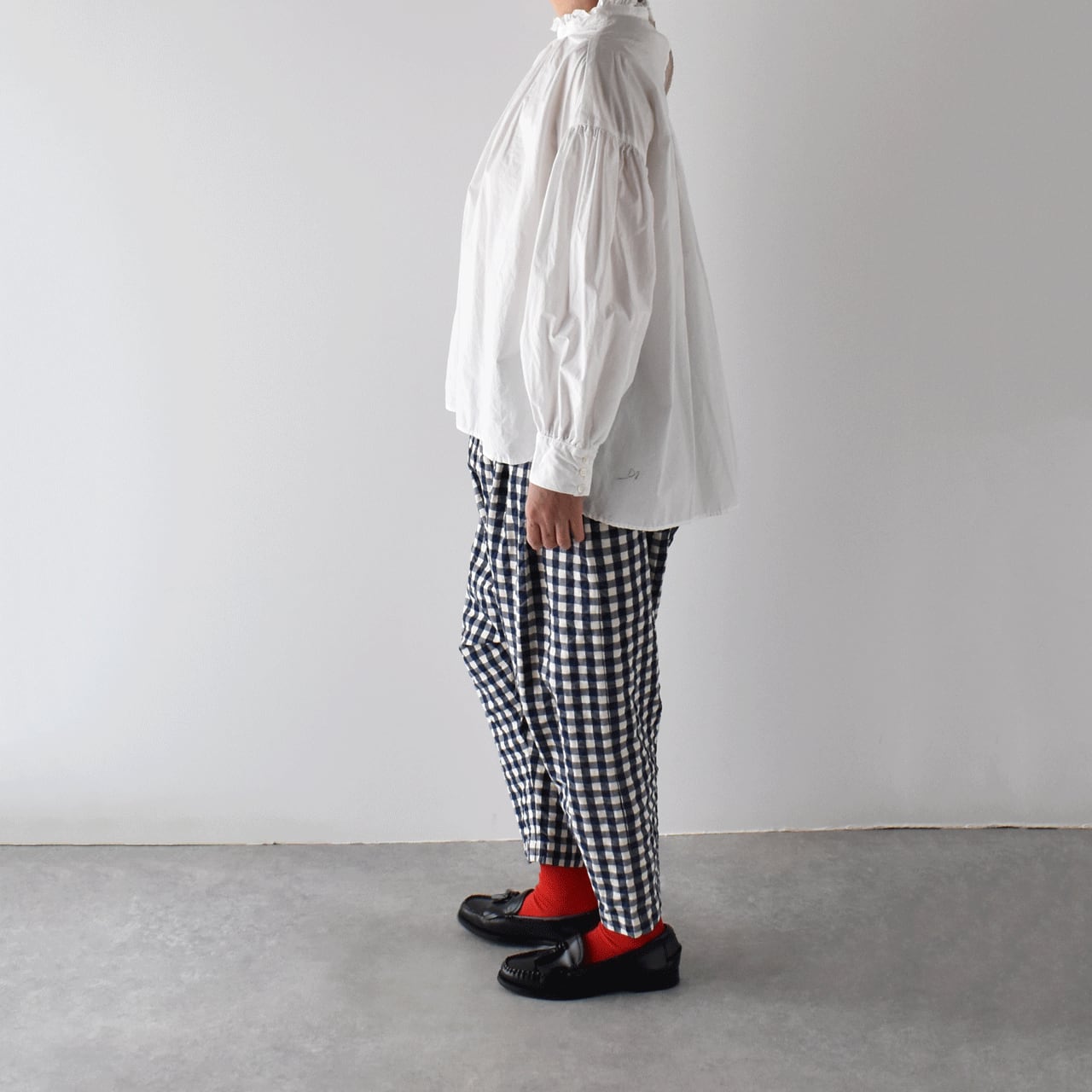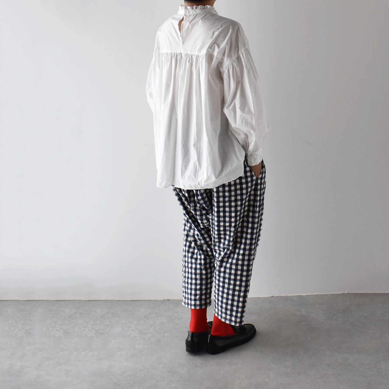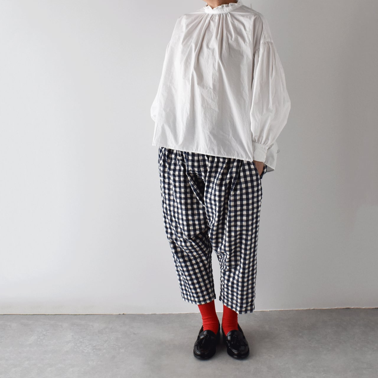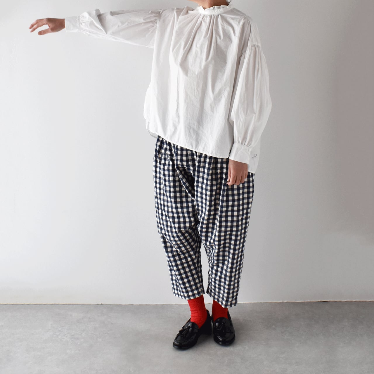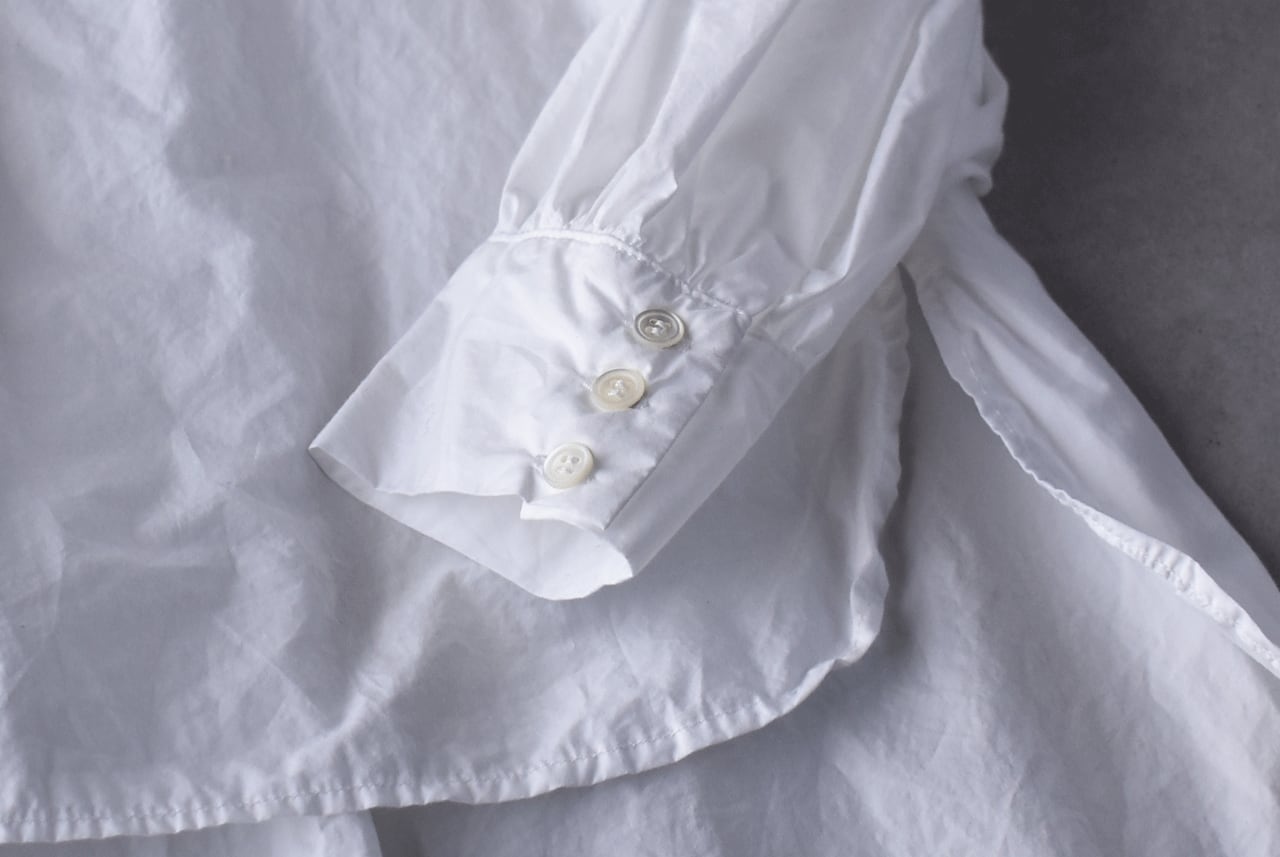 Gauze# から、シンプルながら凛とした存在感を放つプルオーバーブラウスが届きました。襟のフリルが印象的で、普段使いからちょっとかしこまったシーンまで、幅広く使って頂ける一枚です。空気を含ませる様に織り上げたタイプライターコットンもふっくらとしてとても上質な生地感。サロペットのインナーとしてフリルを活かしたコーディネートで楽しむのもオススメ。