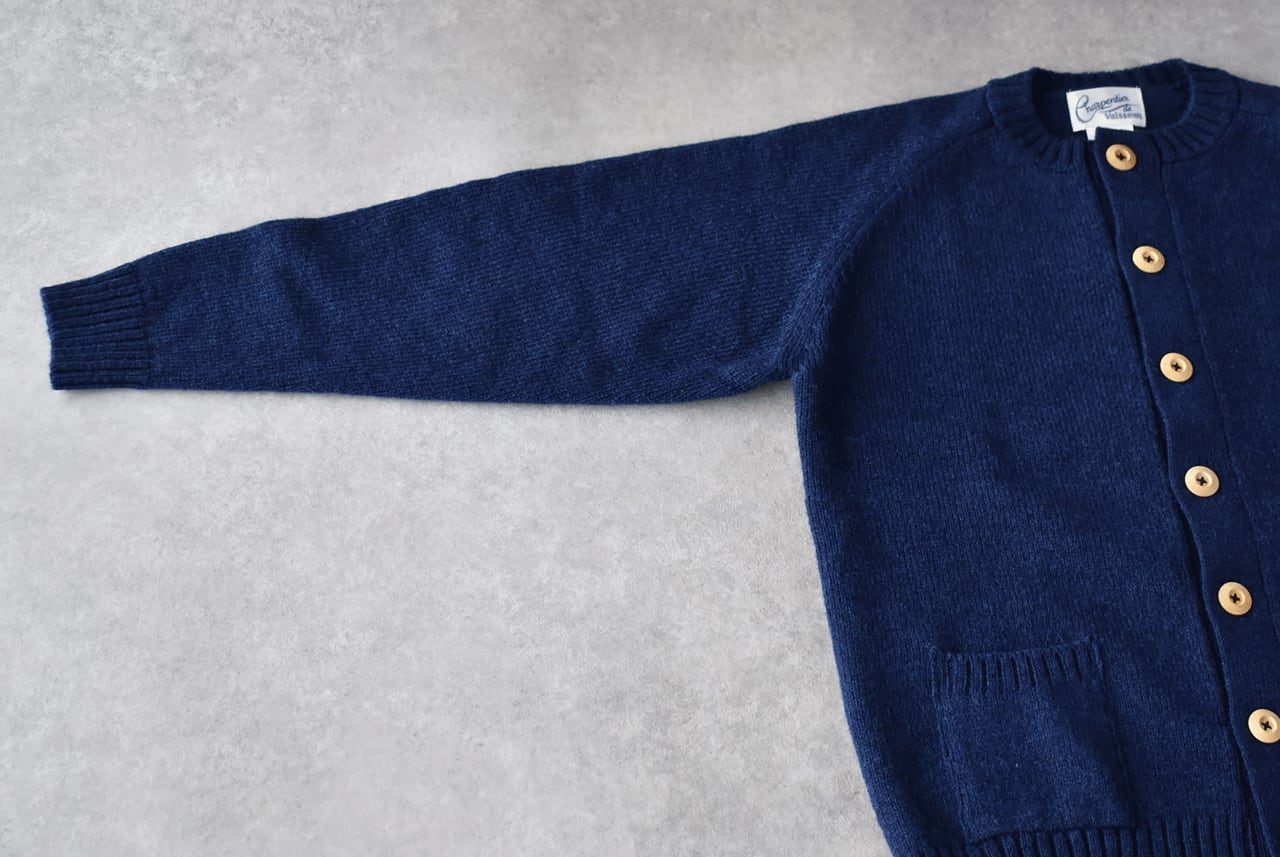 Charpentier de Vaisseauから、ふっくらと軽いシェットランドウールにしなやかなメリノウールをブレンドしたニットカーディガン「katie」が届きました。ざっくりと編まれた優しい表情が毎シーズン人気の一枚です。ゆったりとしたサイズ感で着ていただけるようにメンズサイズをセレクトしました。小さなポケットと木のボタンがついたデザインが可愛く、秋や春先には軽いアウターとして、冬はコートの下に着てももたつかないので、長く楽しんでいただけますよ。厳しい寒さと湿度の高い気候のシェットランド諸島に生息する羊から採れるウールは柔らかく、保湿性が高く、数種類の色をブレンドして編み上げた色合いもとても美しいです。