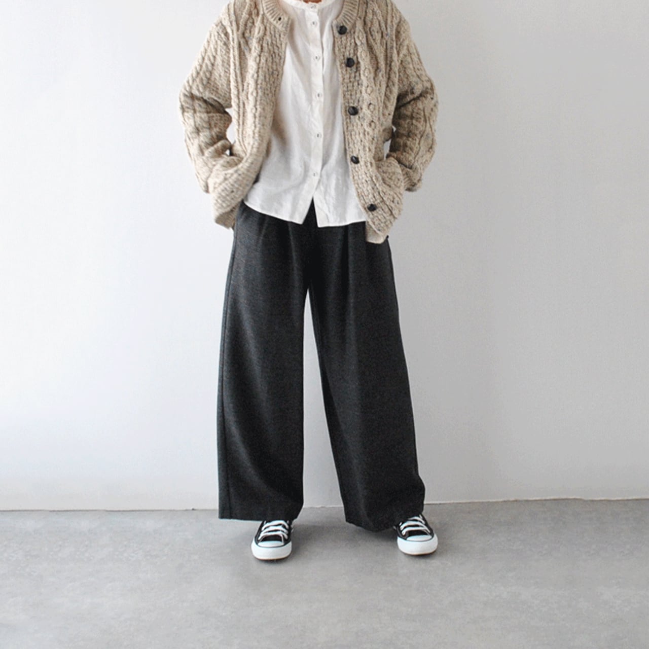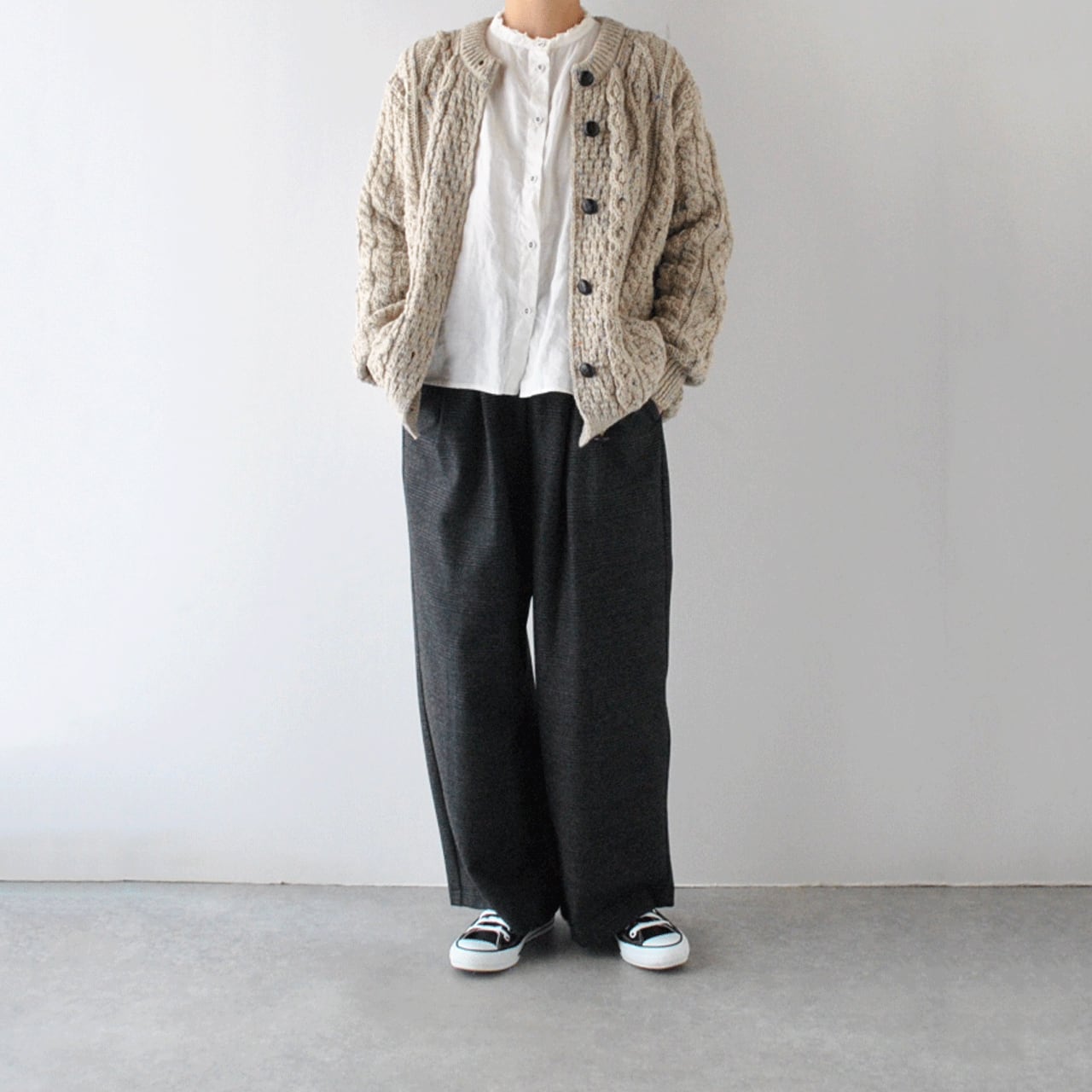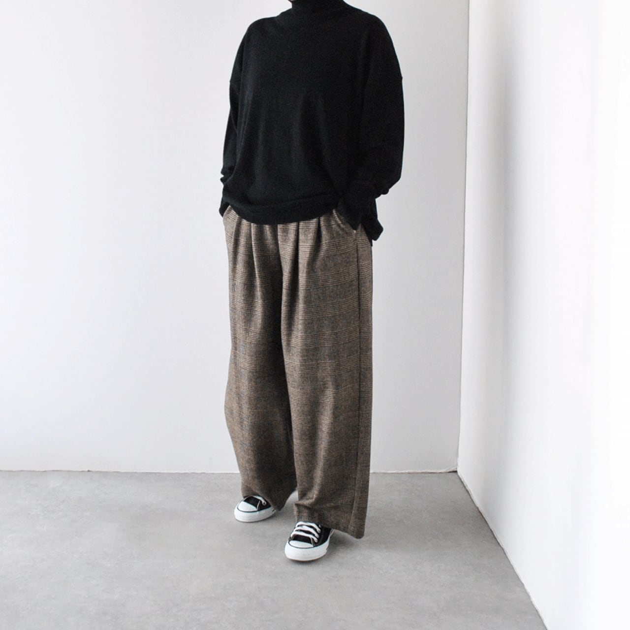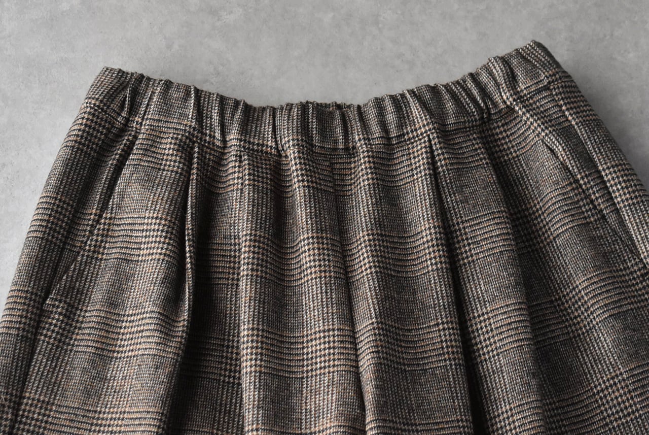 Vent d'ouestから、グレンチェック柄に織り上げたウール混ツィードが雰囲気の良いワイドパンツが届きました。レトロでおじさんチックなデザインは、オーバーサイズのニットなどと合わせるととても可愛く履いて頂けますよ。ふっくらとした生地感で、とても温かく、深い股上、ヒモで調節出来るゴムウエスト、裏地付きでストレスフリーな一枚。色んな色がMIXされたツィード特有の深みのある色味も◎。スニーカーで少し外したスタイルもオススメ。