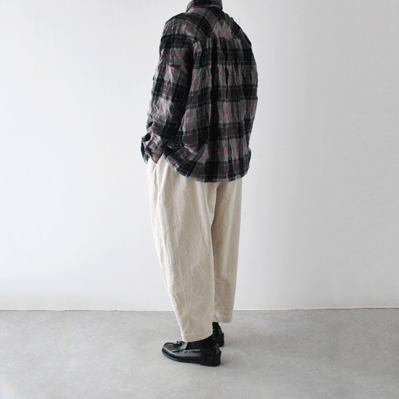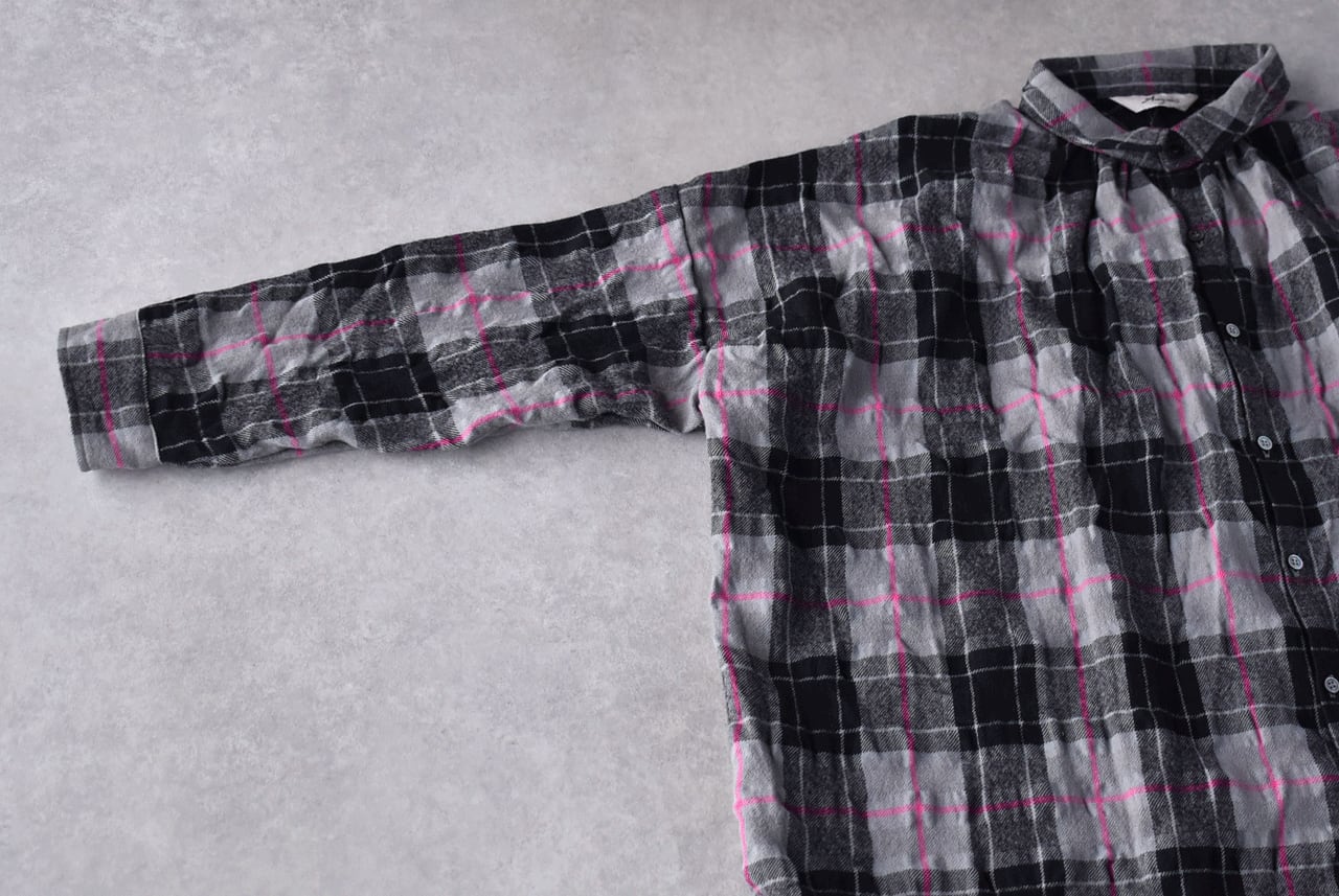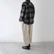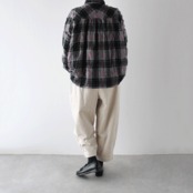 ichi Antiquitésから、ウール×コットン起毛の温かみのあるタータンチェックが印象的なシャツが届きました。ワイドシルエットのゆったりとしたサイズ感で、シンプルにシャツとしてはもちろん、前を開けてジャケット感覚で羽織っても雰囲気よく楽しめる便利な一枚。ワンピースにサッと羽織るのも可愛いですよ。ウールとコットンの収縮差で生まれるウネのあるポコポコした生地感も優しい表情。同素材のワイドパンツとのセットアップもオススメです。