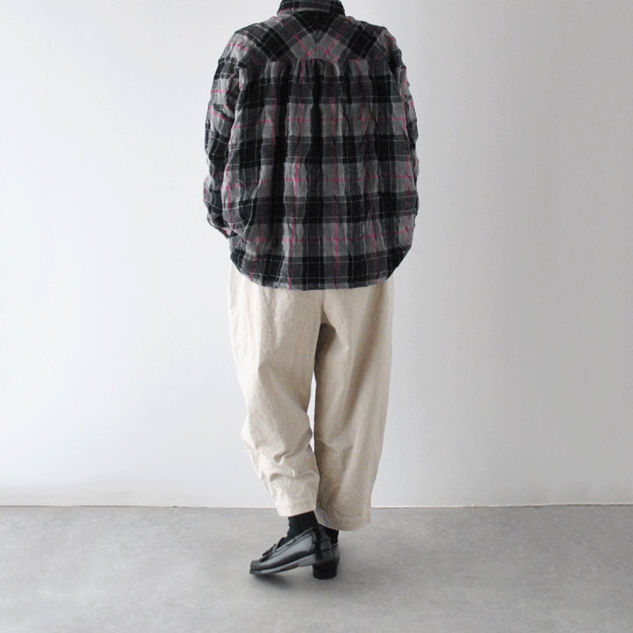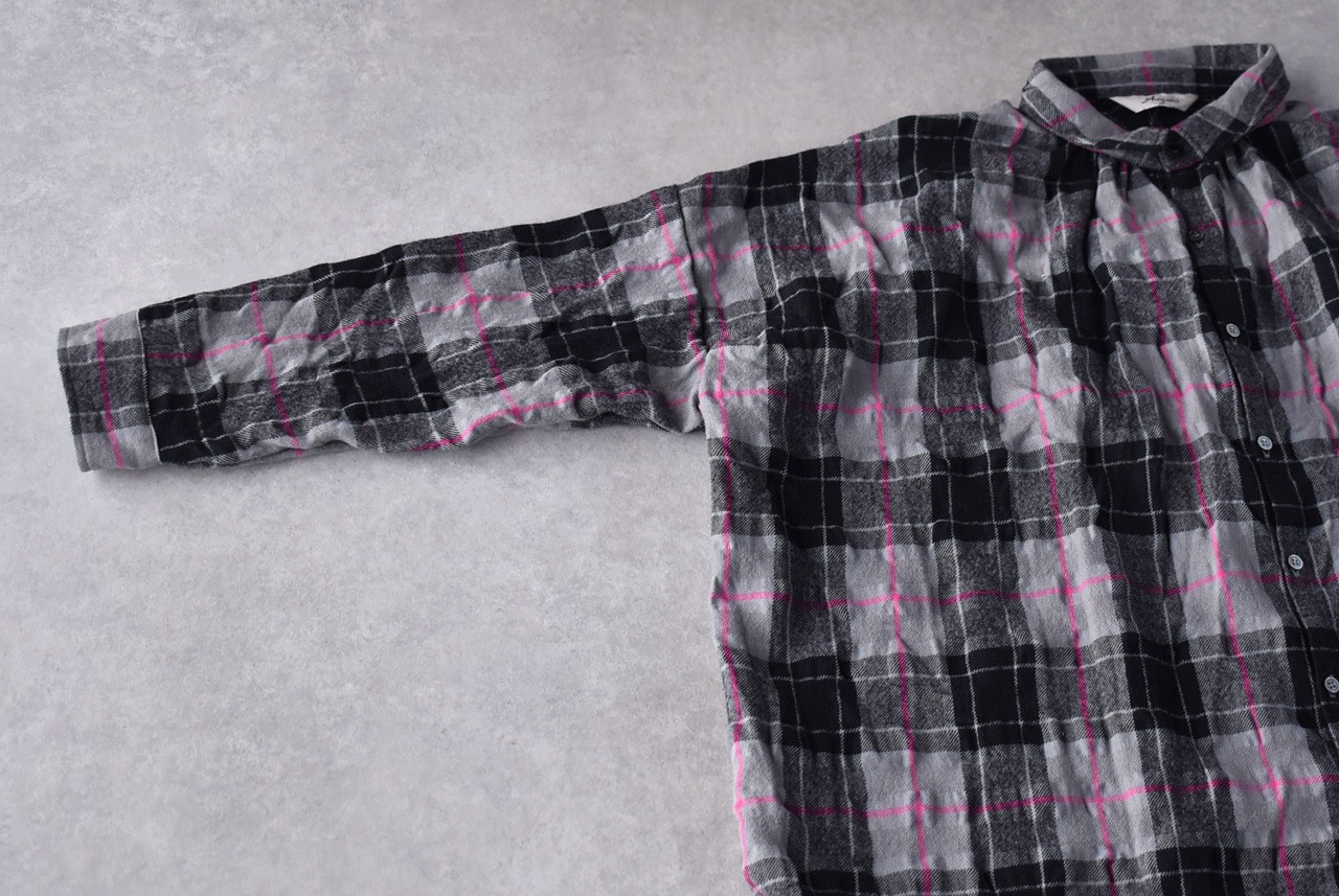 ichi Antiquités ウールコットン起毛 タータンチェックワイドシャツ (グレー) 1100604