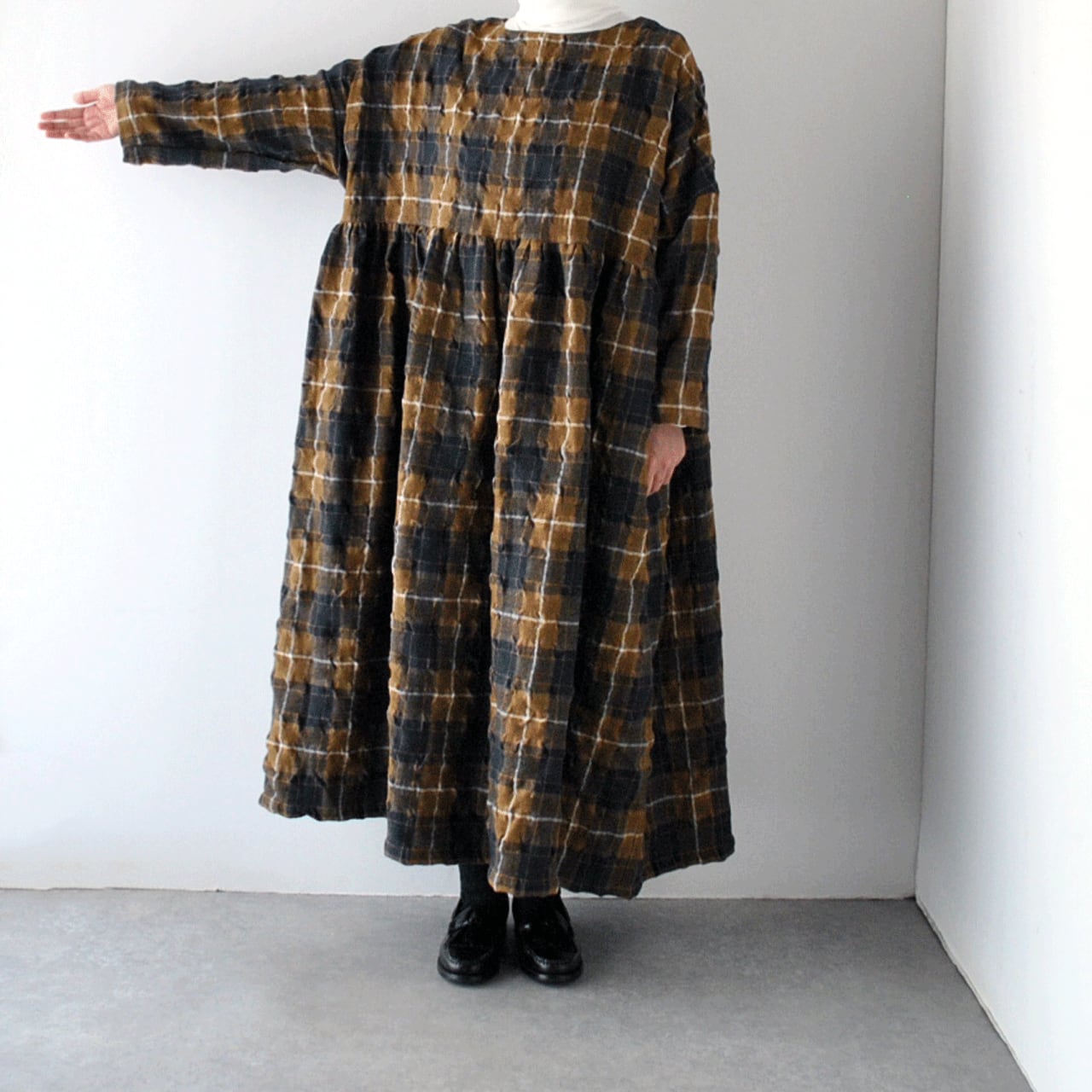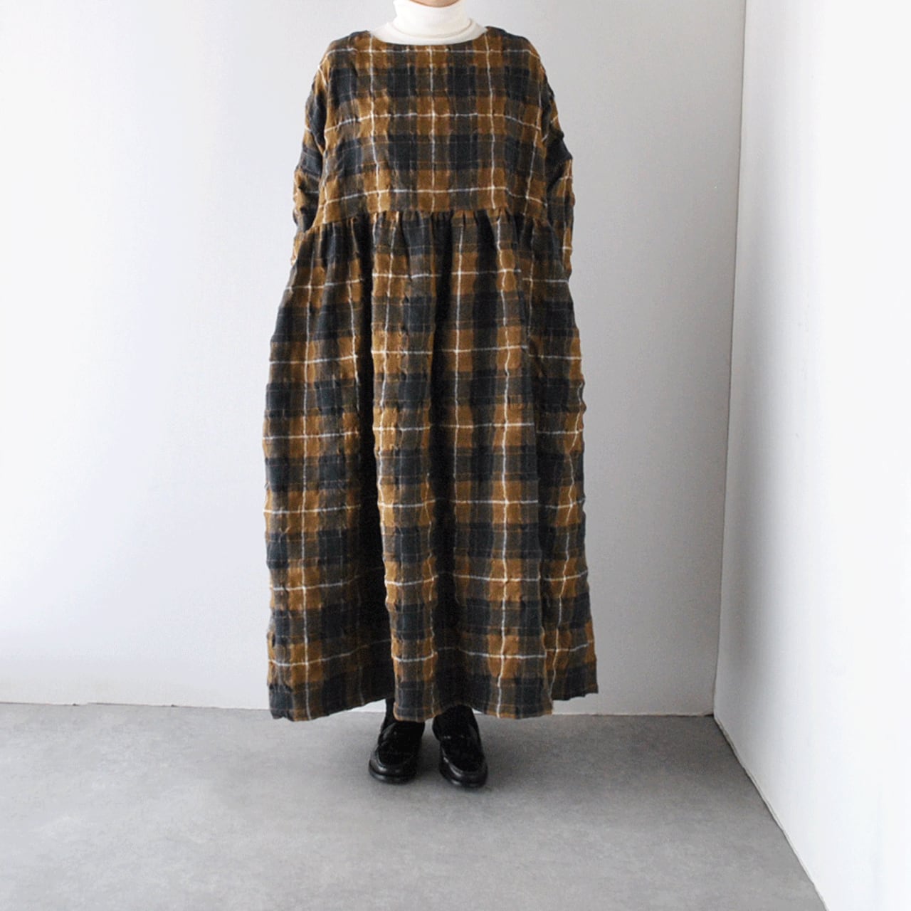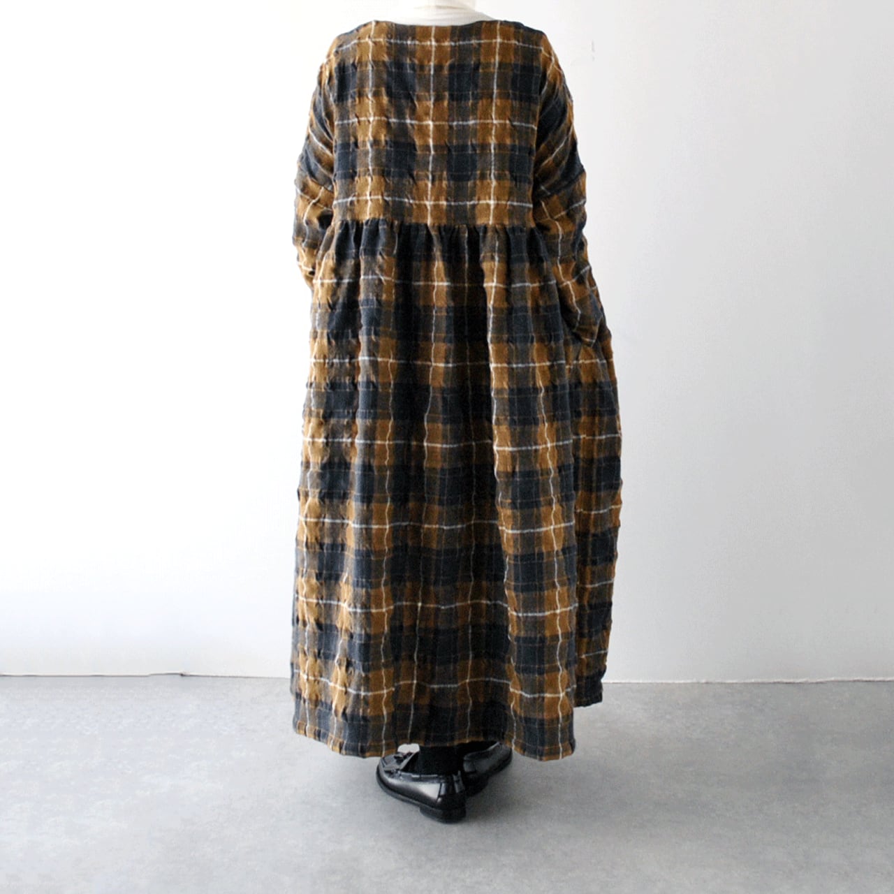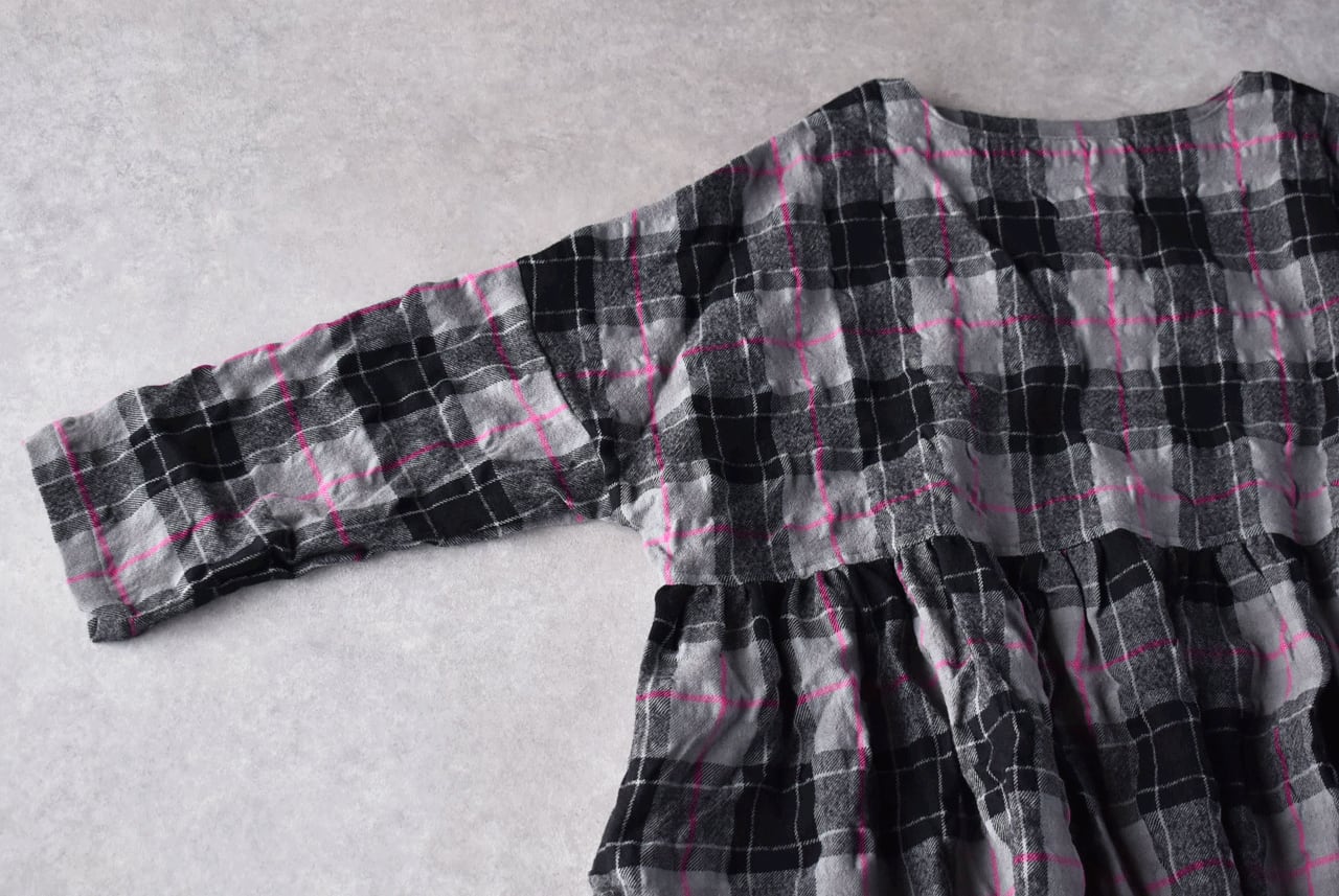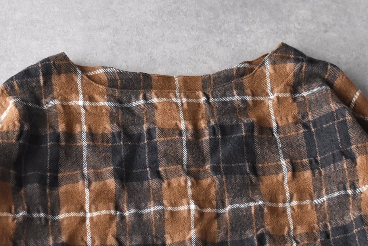 ichi Antiquitésから、ウール×コットン起毛の温かみのあるタータンチェックが印象的なワンピースが届きました。ウエストの切替にギャザーを寄せたふんわりと広がるシルエットが本当に素敵で、一枚で主役として楽しんで頂けます。ジャケットやコートを寄せた姿も絵になりますよ。肩幅、身幅を広く取ったゆったりとした着心地も嬉しいですね。ウールとコットンの収縮差で生まれるウネのあるポコポコとした生地感も優しい表情。インナーにタートルネックを合わせたコーディネートもオススメです。