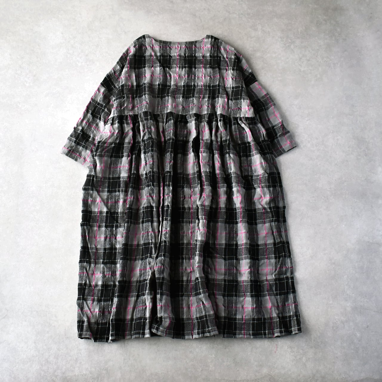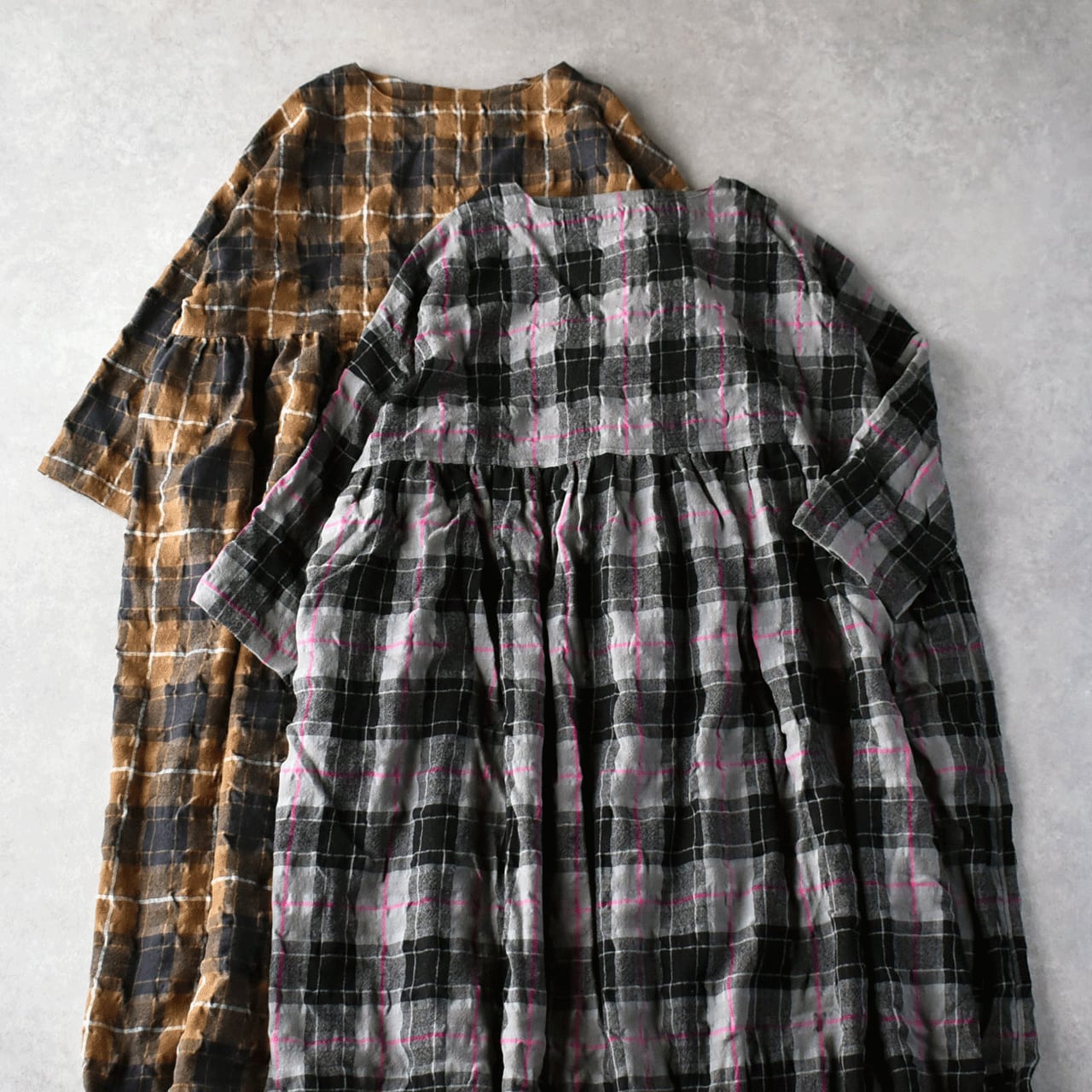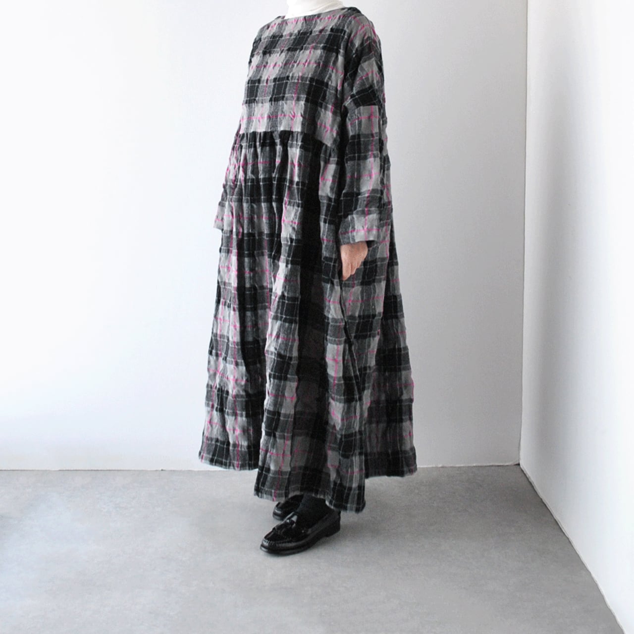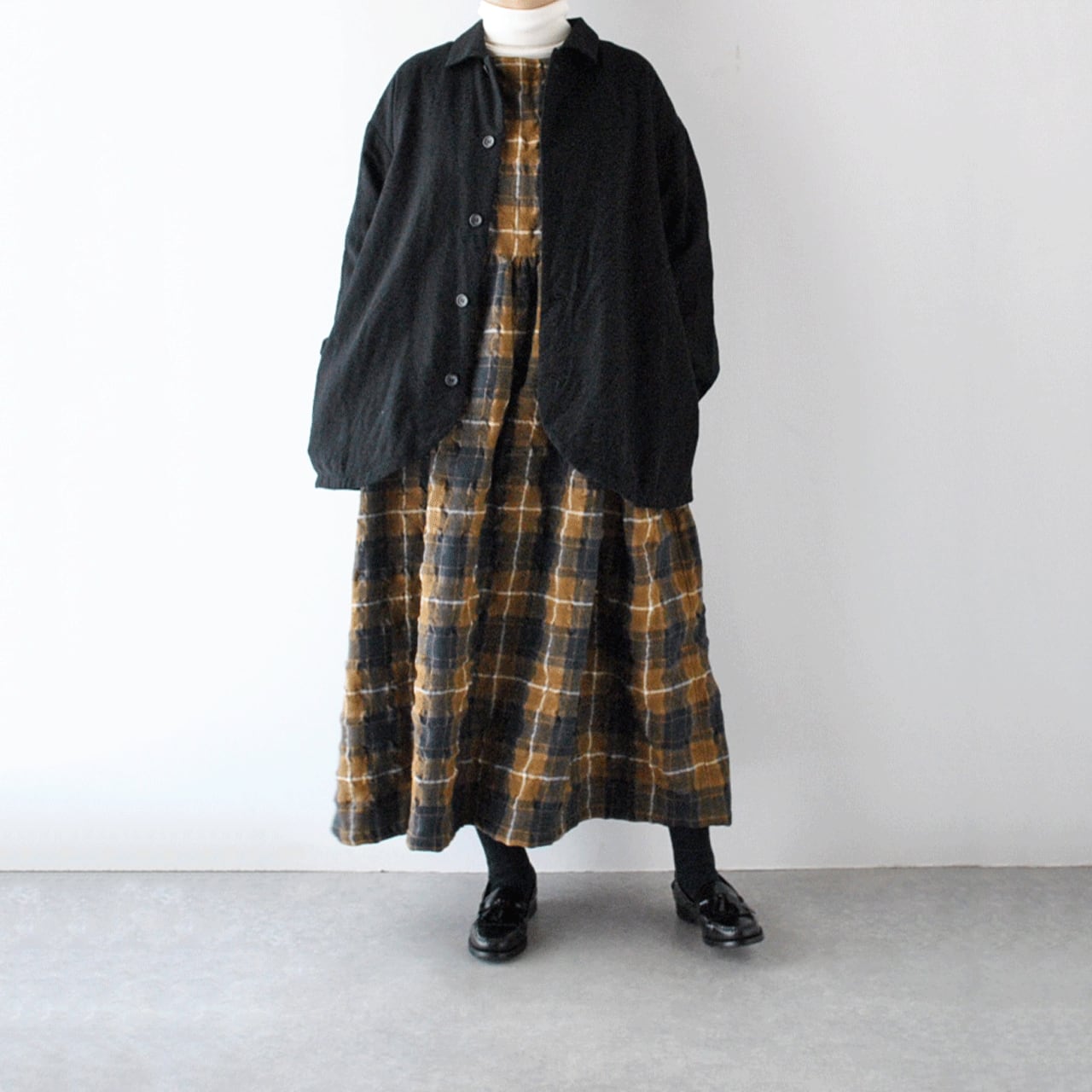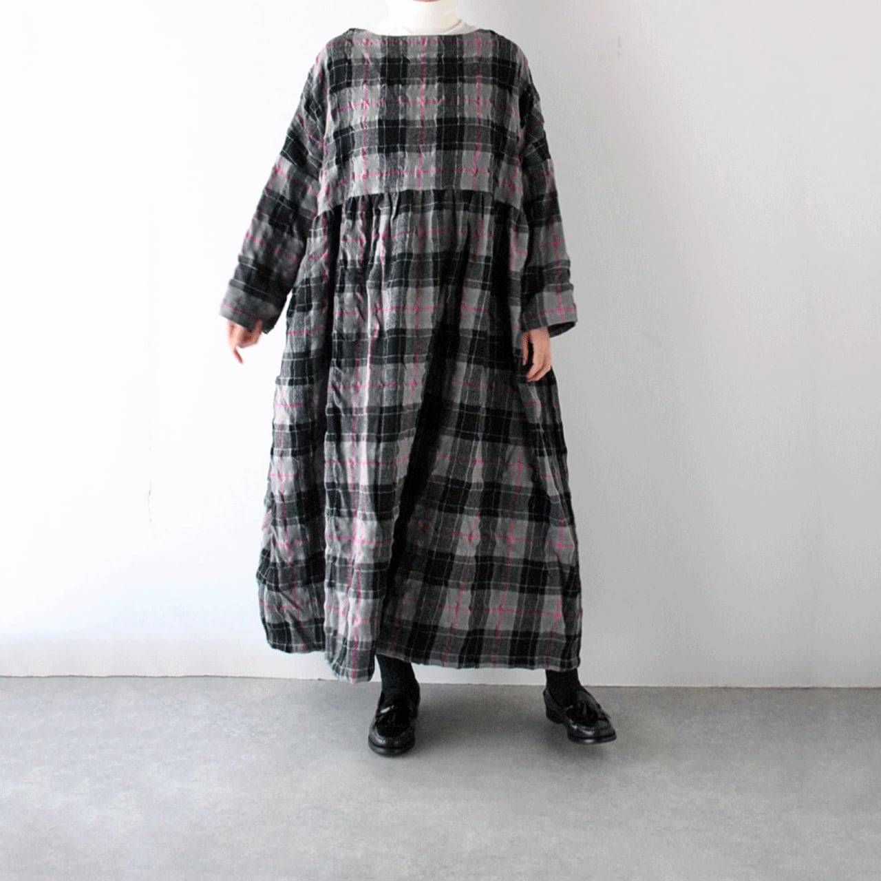 ichi Antiquitésから、ウール×コットン起毛の温かみのあるタータンチェックが印象的なワンピースが届きました。ウエストの切替にギャザーを寄せたふんわりと広がるシルエットが本当に素敵で、一枚で主役として楽しんで頂けます。ジャケットやコートを寄せた姿も絵になりますよ。肩幅、身幅を広く取ったゆったりとした着心地も嬉しいですね。ウールとコットンの収縮差で生まれるウネのあるポコポコとした生地感も優しい表情。インナーにタートルネックを合わせたコーディネートもオススメです。