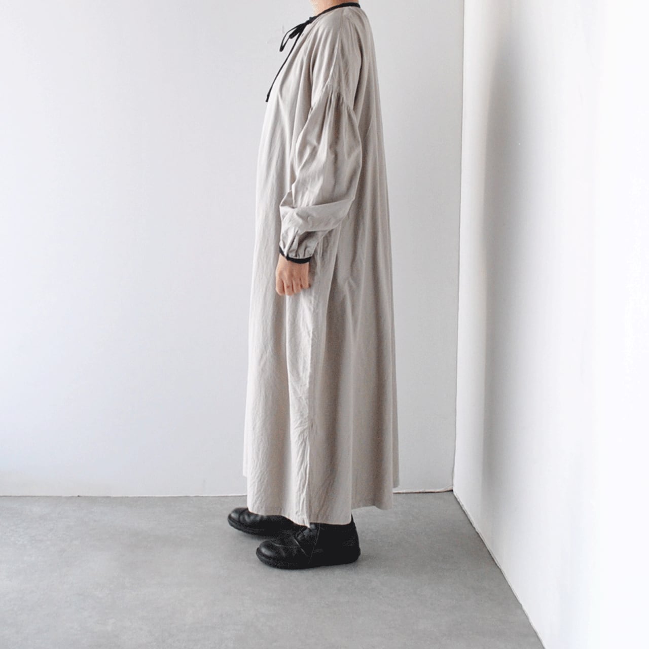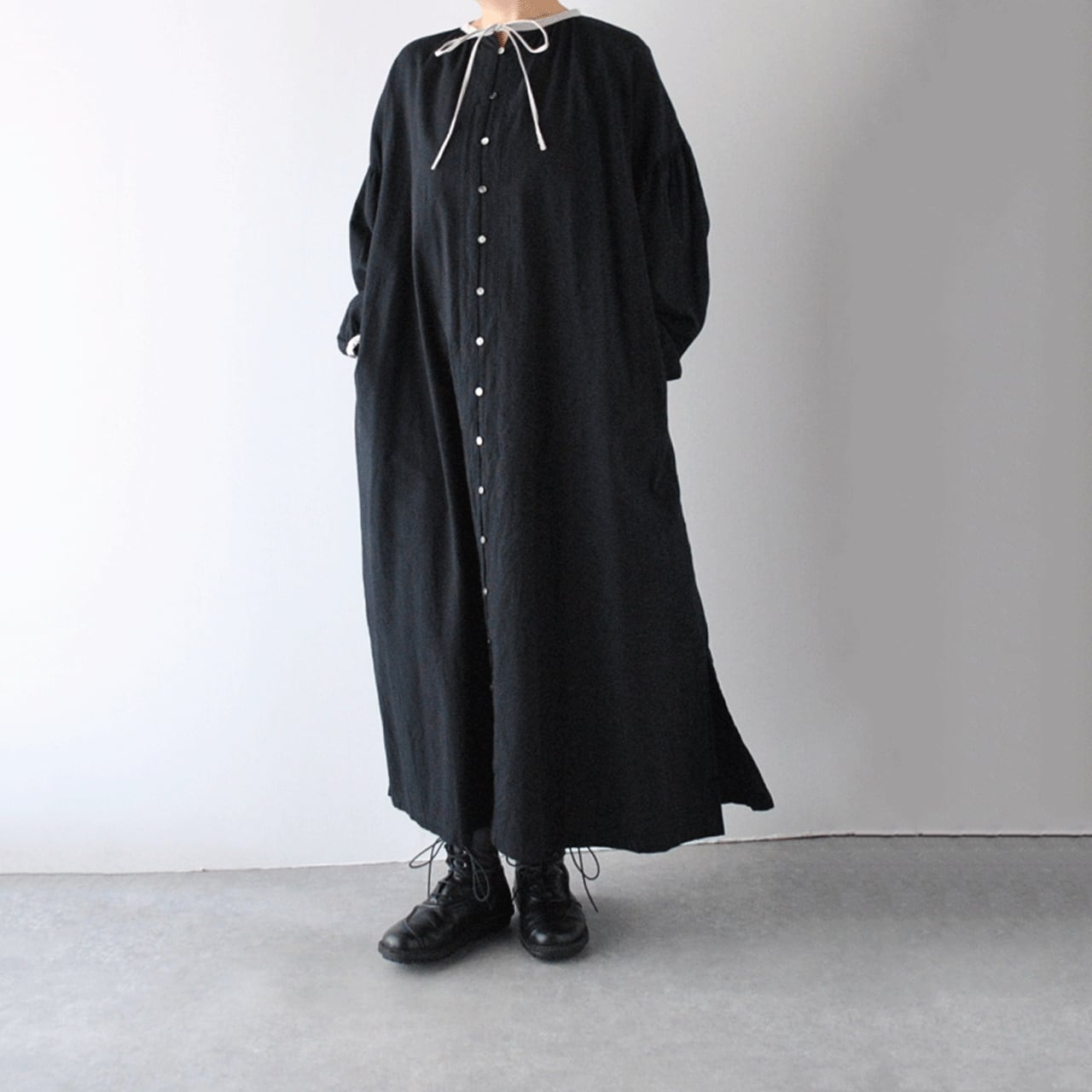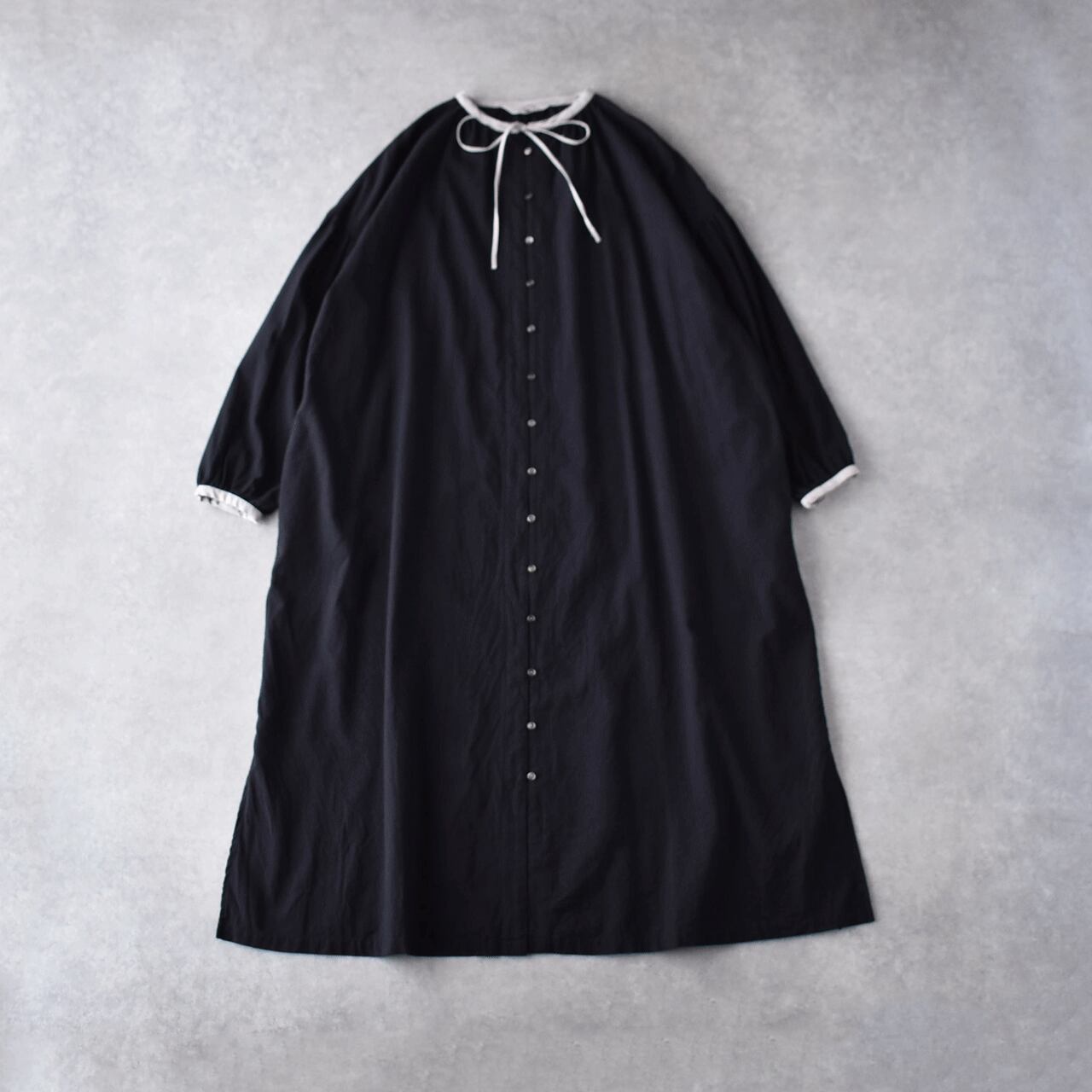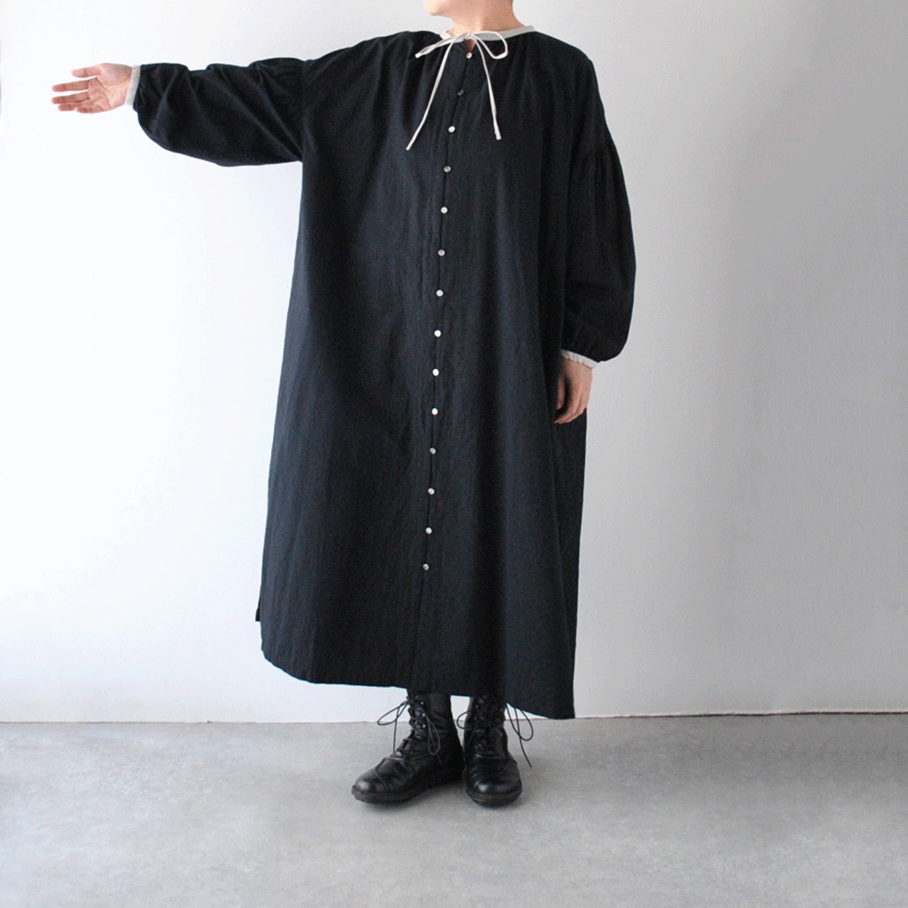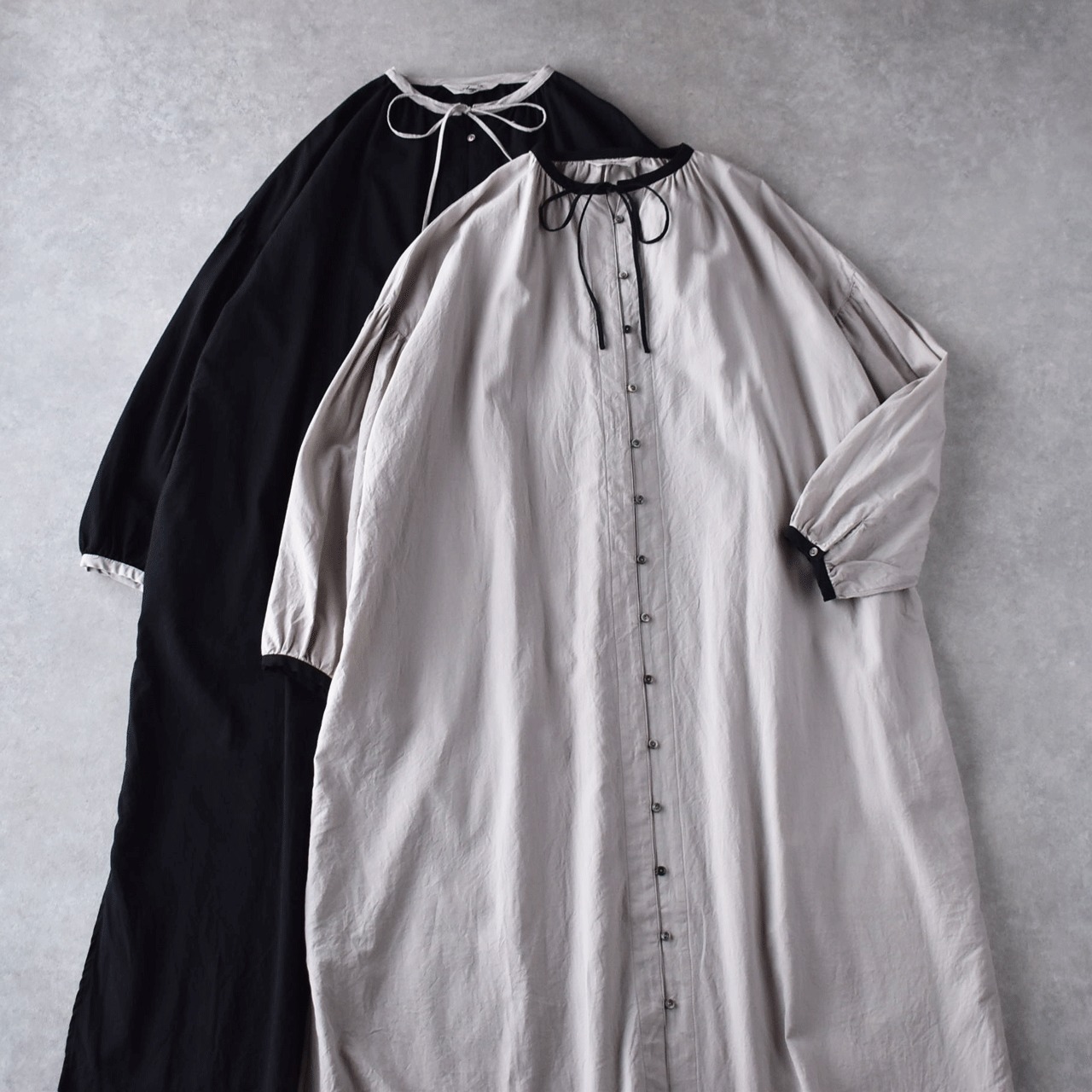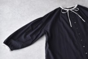 ichi Antiquitésから、コットンにカシミヤをブレンドした上質な肌触りが嬉しいワンピースが届きました。配色になったネックと袖口がポイントで、襟元のリボンは結ばずにラフに垂らしても素敵。ゆったりとした肩幅、身幅なので、リラックス感のある着心地で楽しんで頂けますよ。ボタンはゴムループ仕様。今の季節はブーツと合わせたスタイルが可愛いですよ。