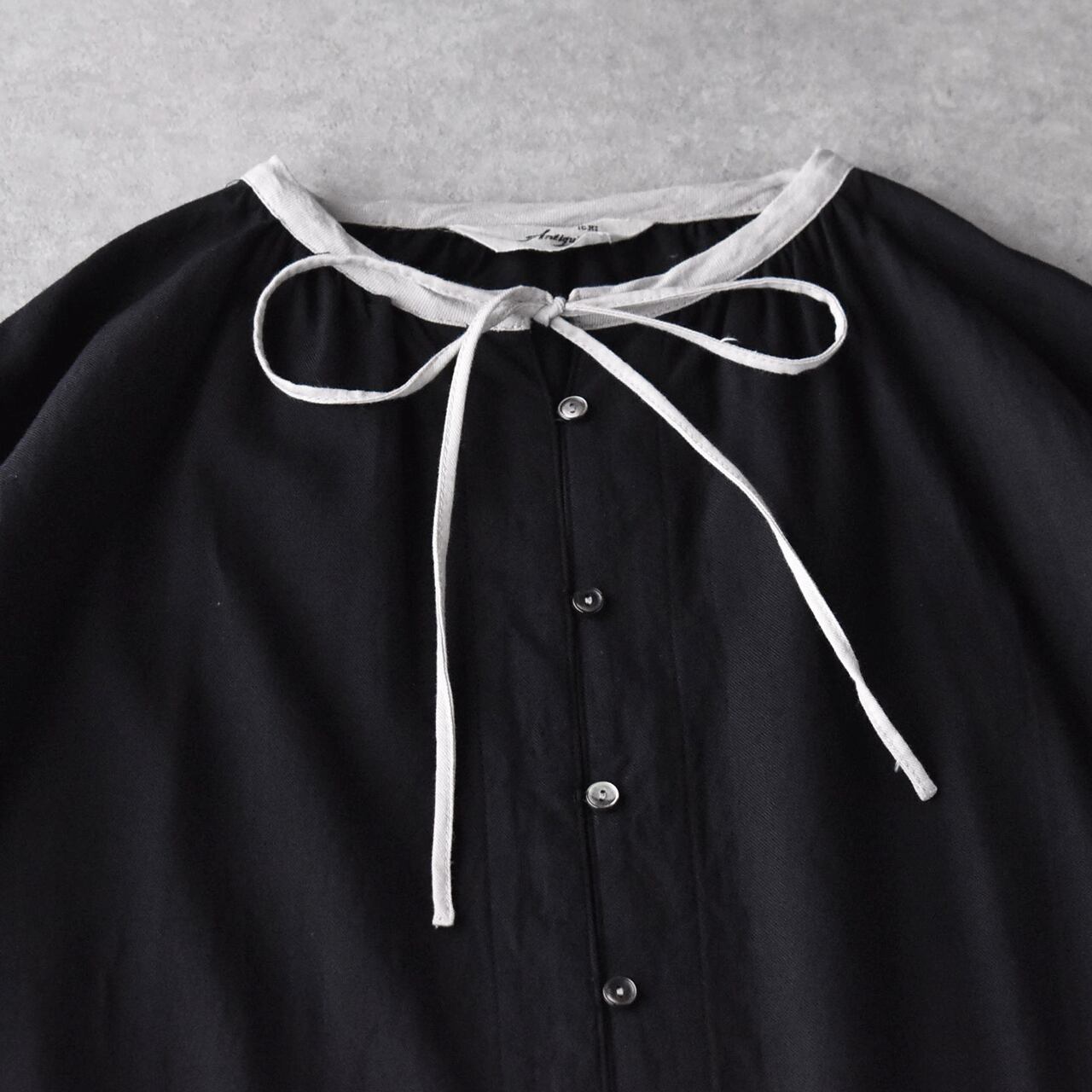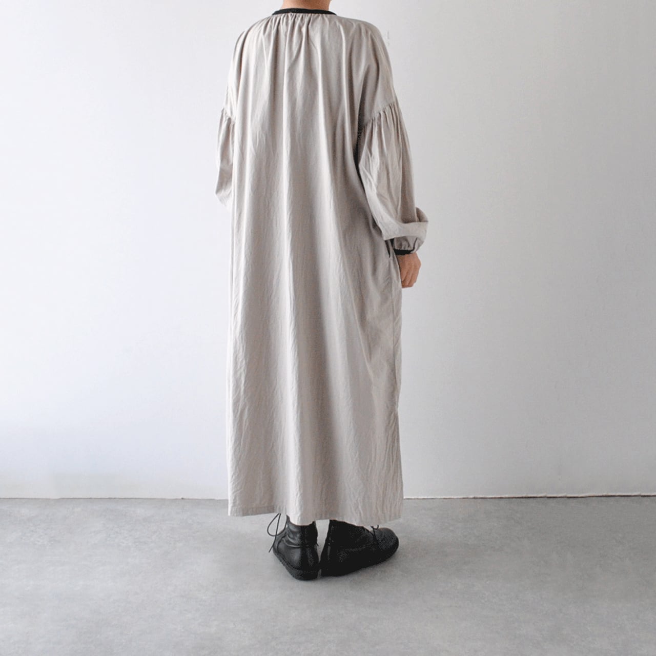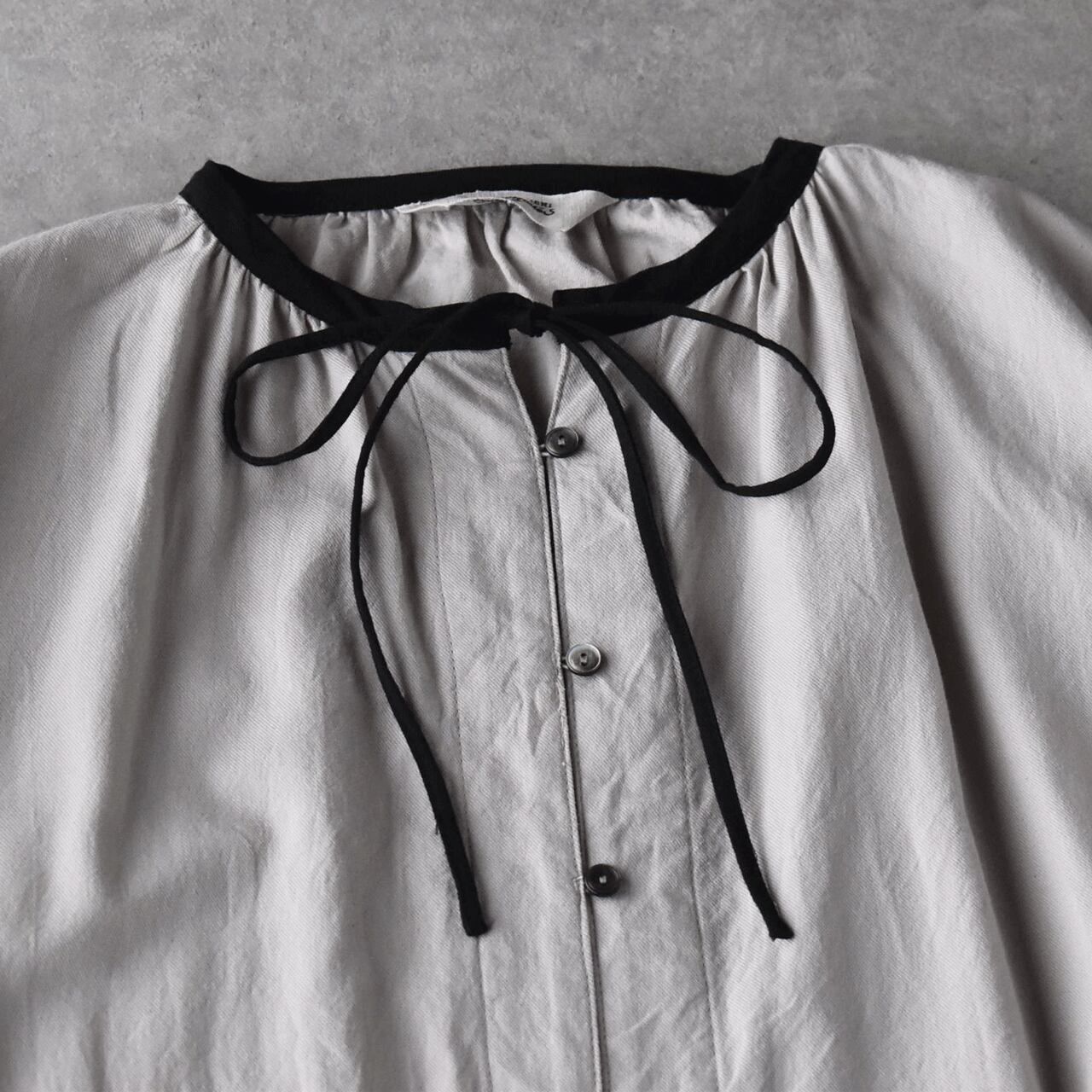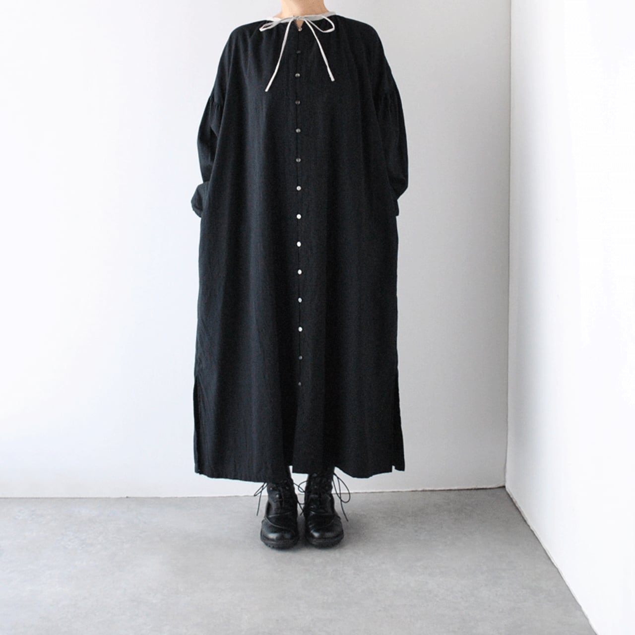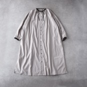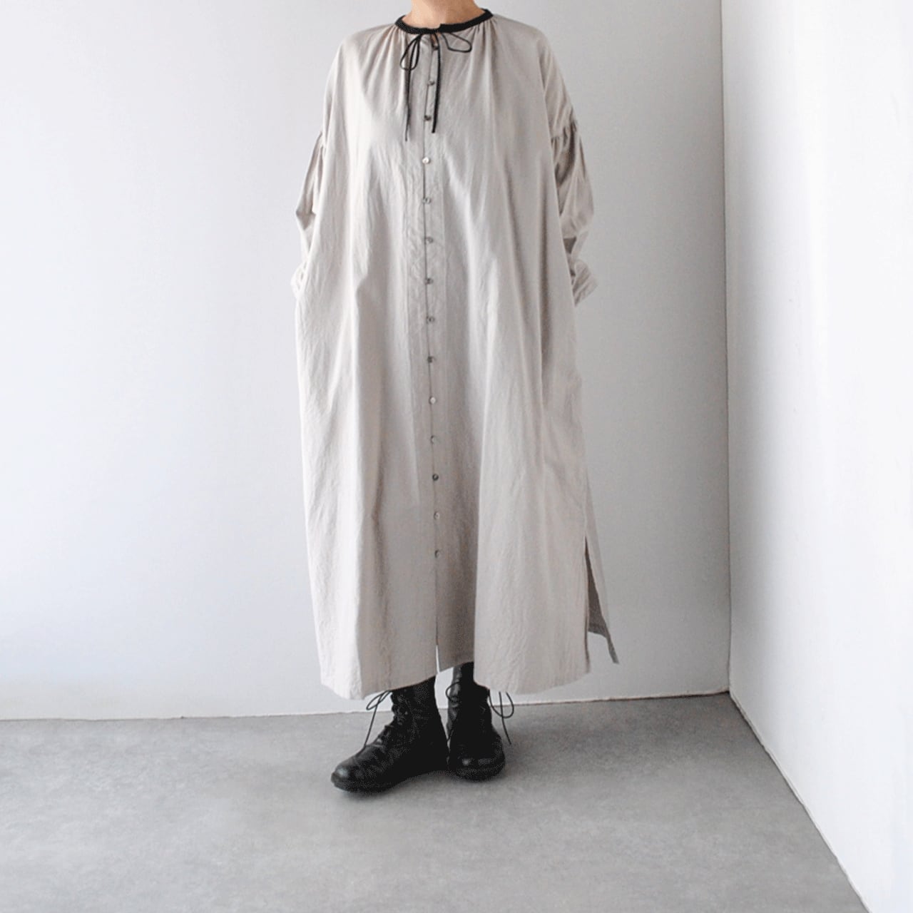 ichi Antiquitésから、コットンにカシミヤをブレンドした上質な肌触りが嬉しいワンピースが届きました。配色になったネックと袖口がポイントで、襟元のリボンは結ばずにラフに垂らしても素敵。ゆったりとした肩幅、身幅なので、リラックス感のある着心地で楽しんで頂けますよ。ボタンはゴムループ仕様。今の季節はブーツと合わせたスタイルが可愛いですよ。