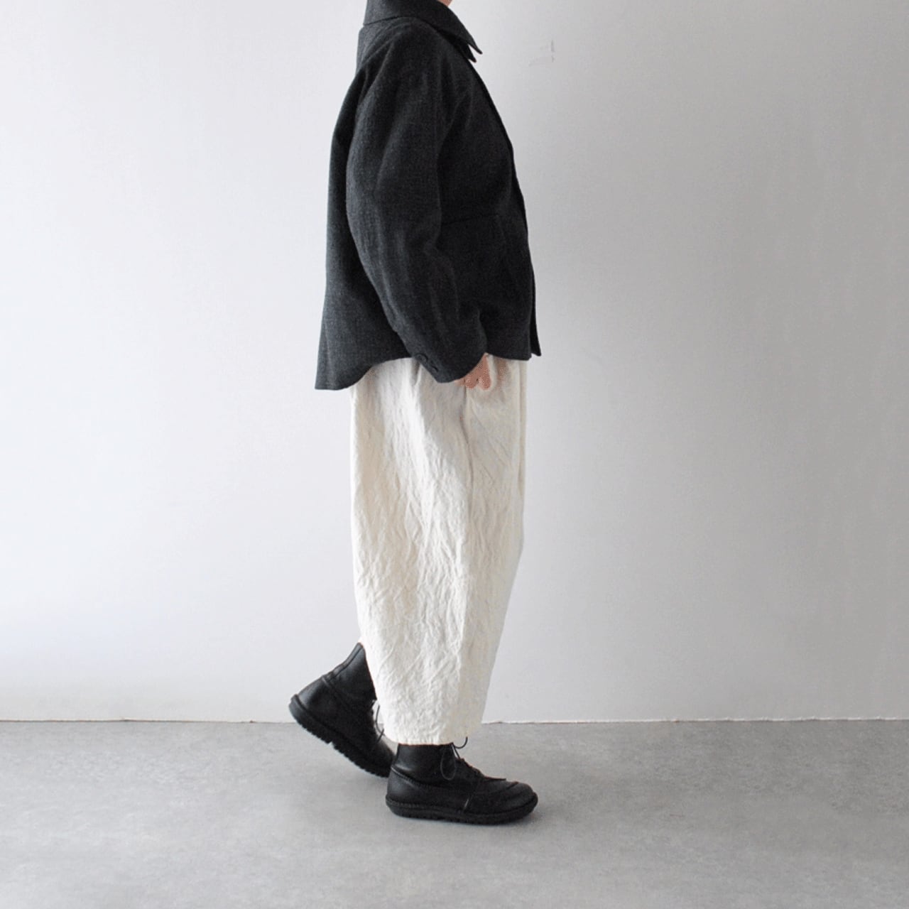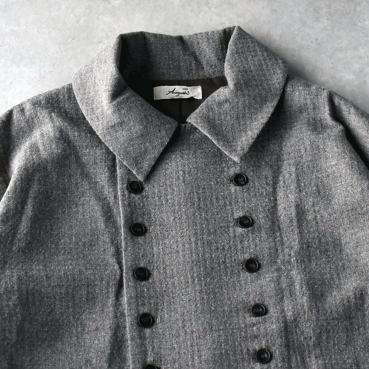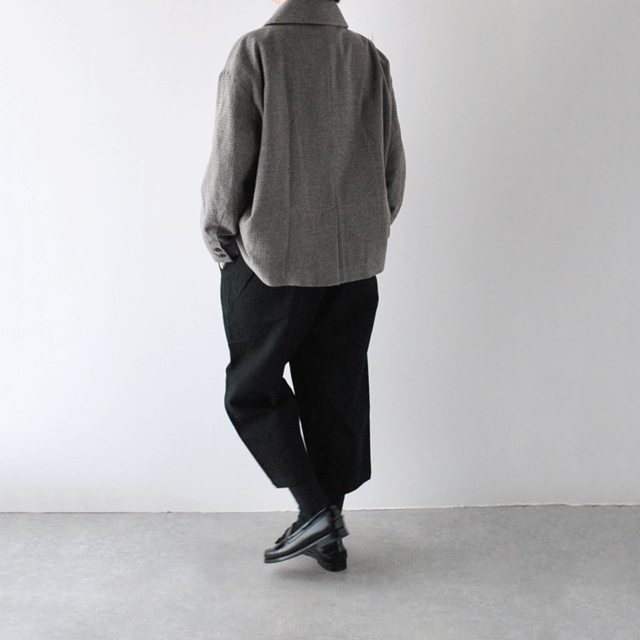 ichi Antiquitésから、大きめの襟とズラリと並んだダブルボタンが印象的なウール×コットン素材のジャケットが届きました。パンツスタイルはもちろん、女性らしいスカートやワンピースにも気軽に羽織って雰囲気よく楽しめる一枚です。両サイドの大きめのパッチポケットも可愛いですよ。ゆったりとした軽い着心地で、細かなチェック柄に織り上げたガーゼのような風合いのウールコットン生地も優しい表情。同素材のパンツとセットアップで楽しむのもオススメです。