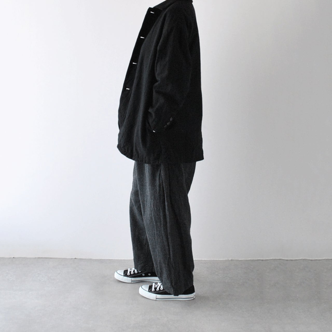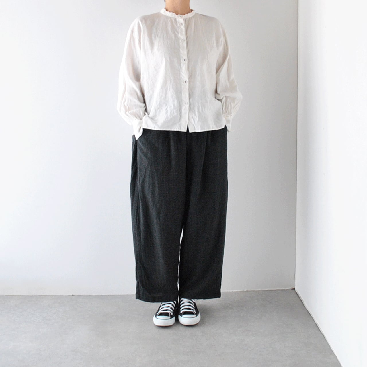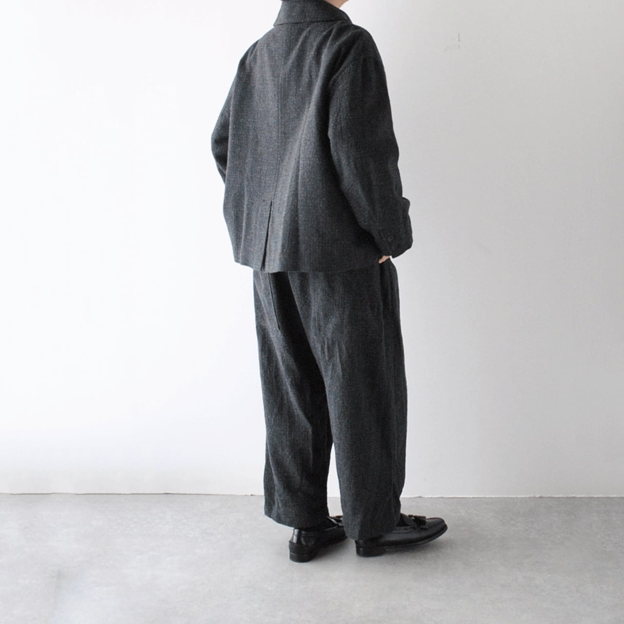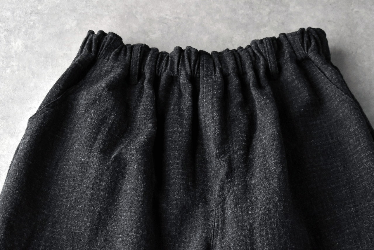 ichi Antiquitésから、細かなチェック柄に織り上げたウール×コットンが雰囲気のあるバギーパンツが届きました。シンプルなニットやジャケットと合わせてシックなモノトーンコーデで楽しみたい一枚。ゆったりとしたシルエットで、リラックス感たっぷりの履き心地ですよ。ガーゼのような風合いの生地感も優しい表情。裏地付きなのも安心ですね。同素材のダブルボタンジャケットとセットアップで楽しむのもオススメです。ヒモ調節可能なゴムウエスト。ベルトループ有り。