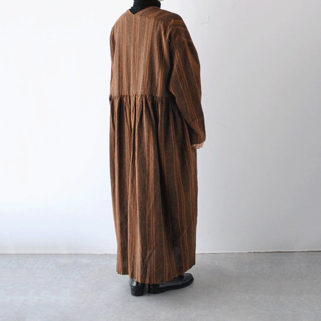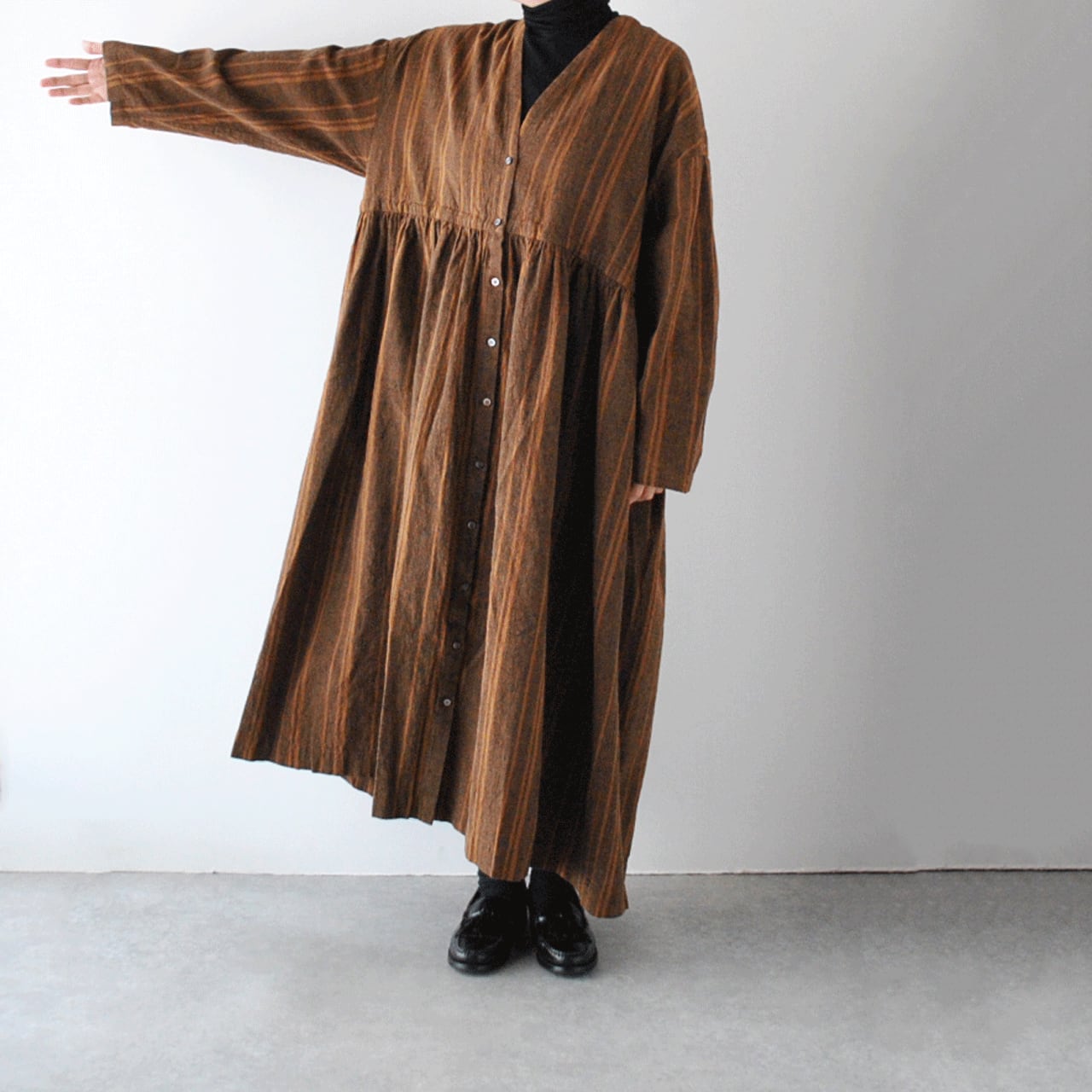 ichi Antiquités コットンリネンストライプ Vネックギャザーワンピース (ブラウン) 1100616