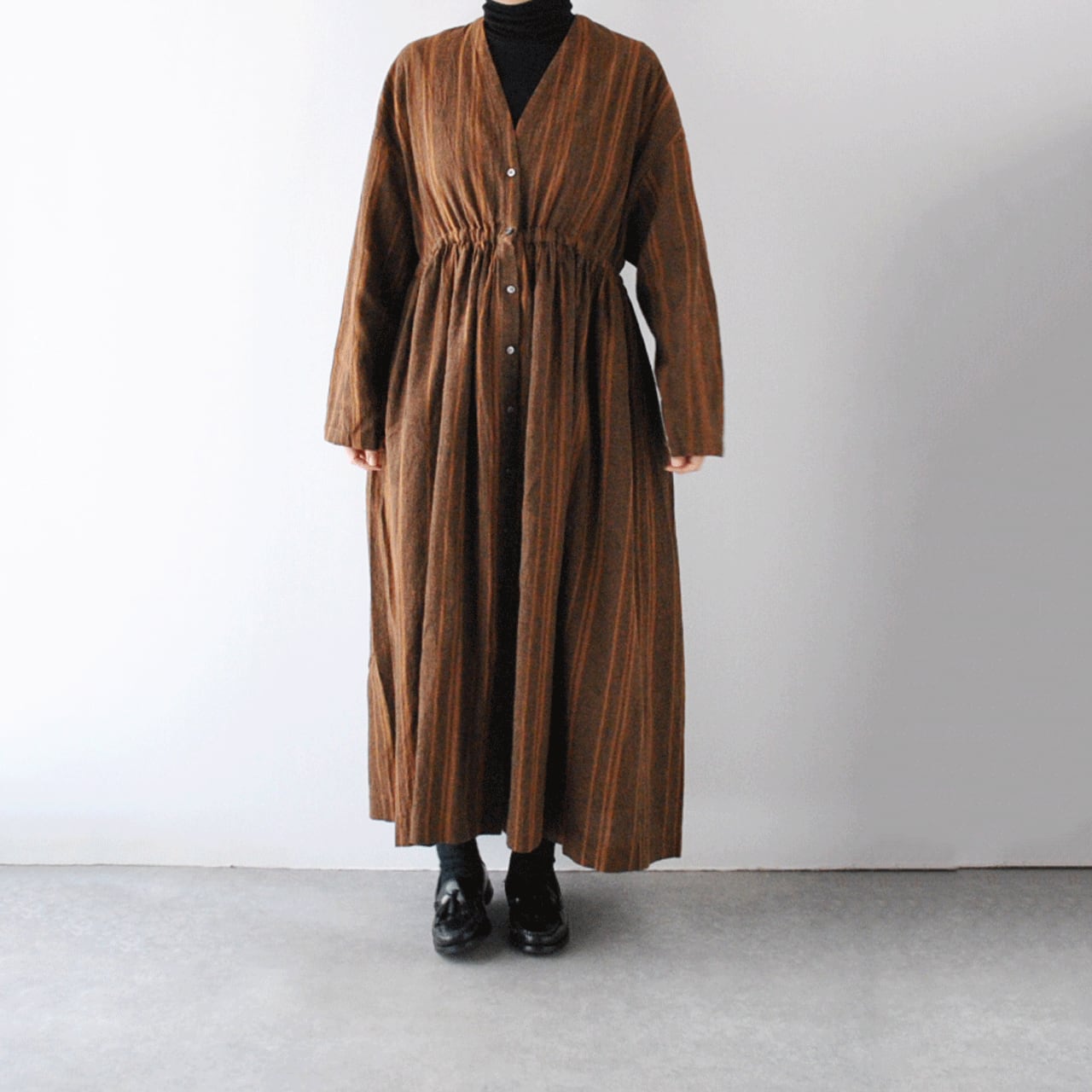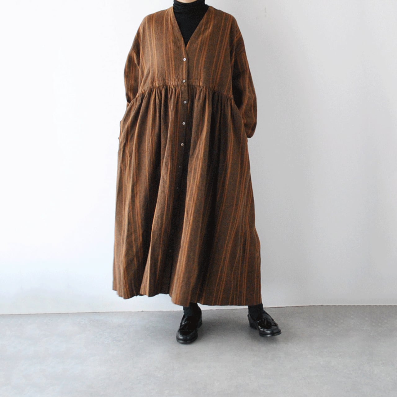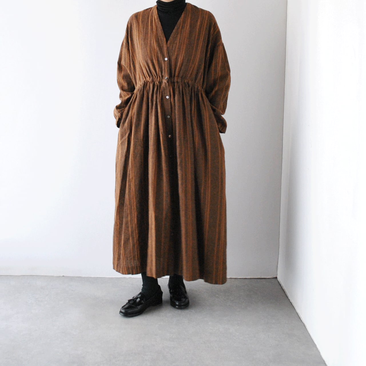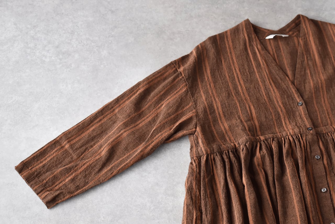 ichi Antiquitésから、シックなブラウンストライプが大人っぽく、落ち着いた印象で楽しめるワンピースが届きました。スッキリとしたV開きのデザインが、首周りをとても綺麗に見せてくれますよ。肌寒い今の時期はタートルネックに重ねたコーディネートがオススメ。暖かくなればTシャツ×デニムに前を開けてサッと羽織って頂くのもカッコいいですよ。ウエストはリボンが通っているので、キュッと絞ってお好みのシルエットに調節して頂けます。程よい厚みの綿×麻素材なので、季節を問わず一年を通した大活躍間違いなしの一枚です。