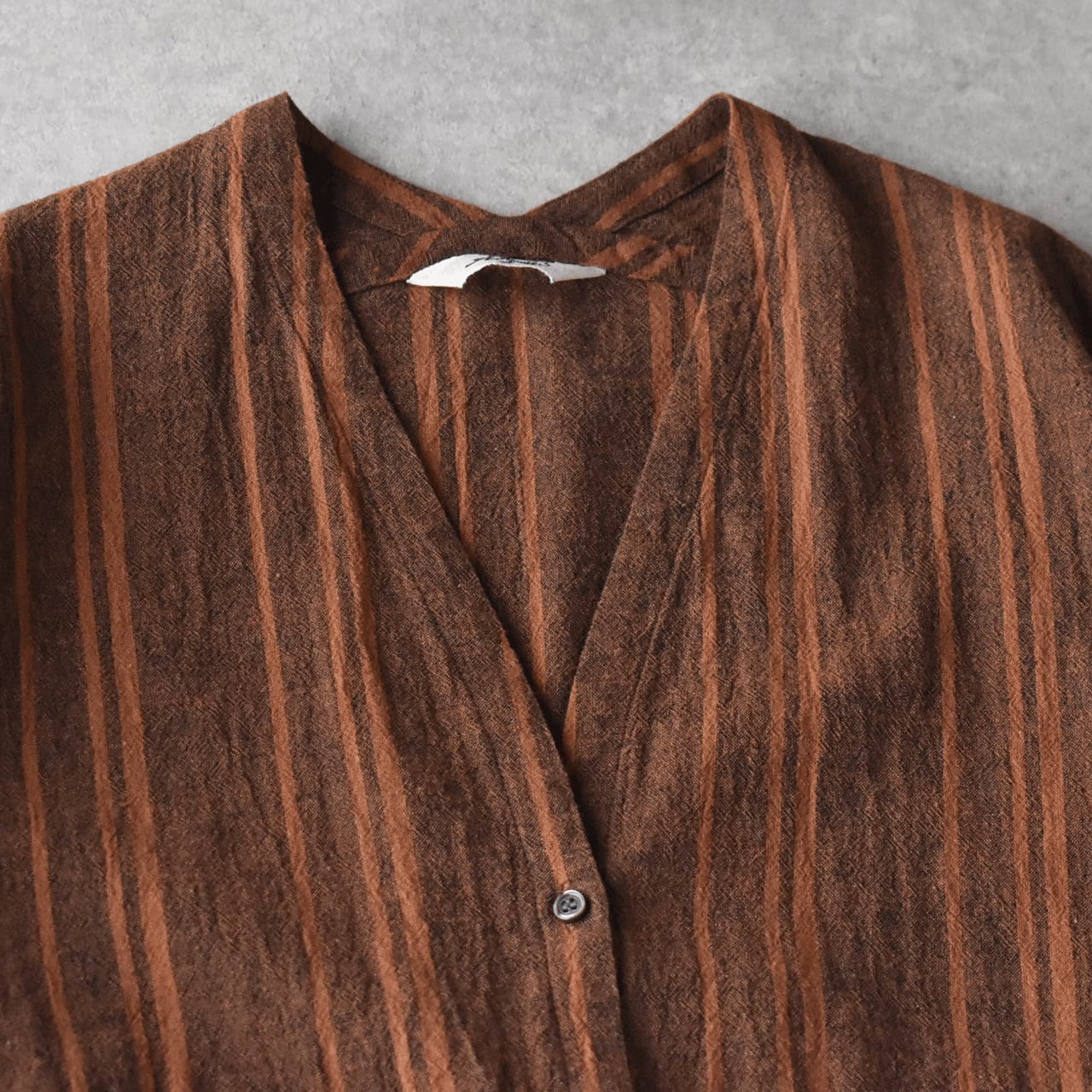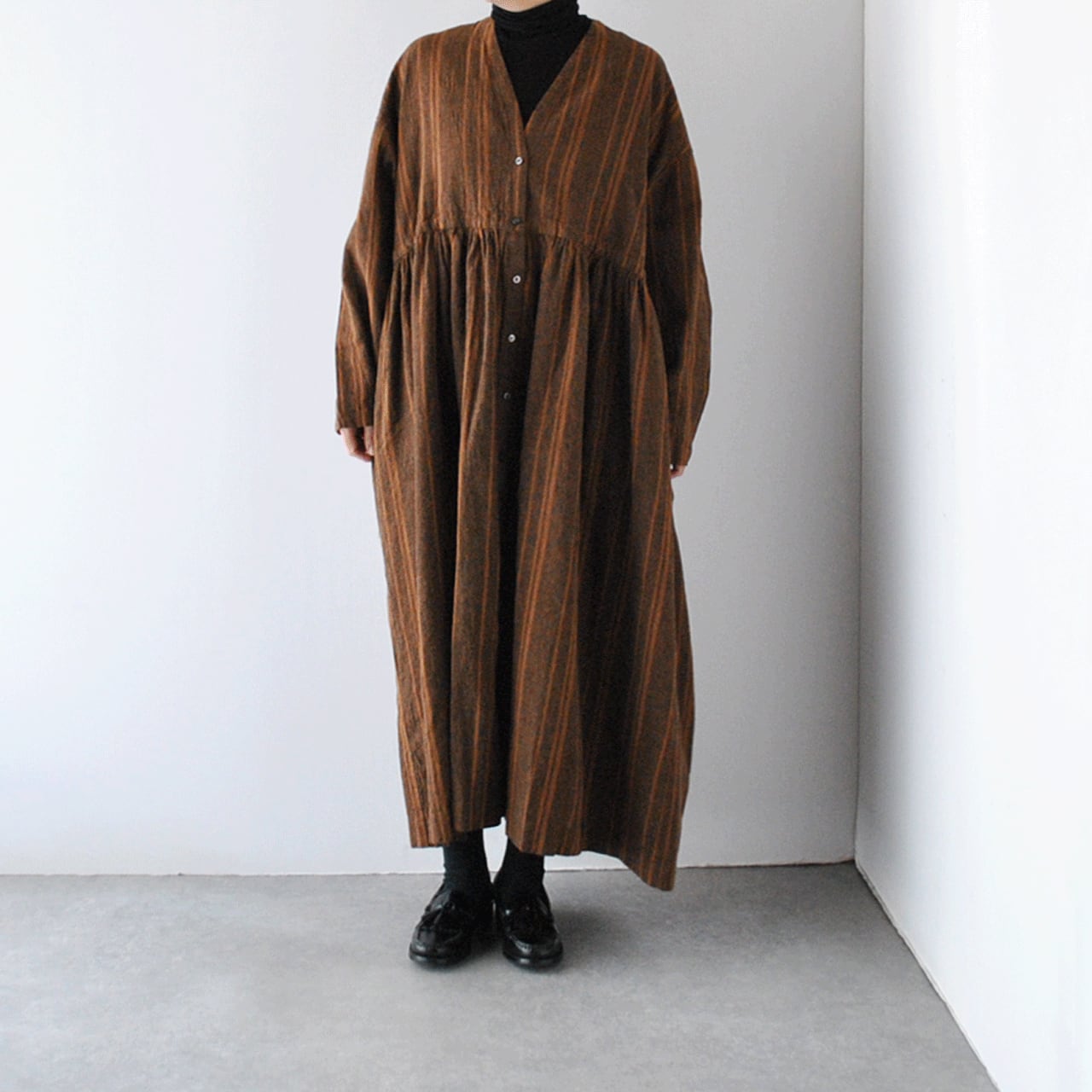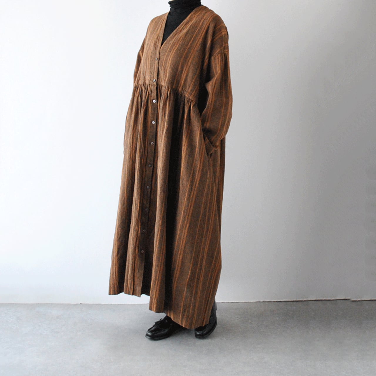ichi Antiquitésから、シックなブラウンストライプが大人っぽく、落ち着いた印象で楽しめるワンピースが届きました。スッキリとしたV開きのデザインが、首周りをとても綺麗に見せてくれますよ。肌寒い今の時期はタートルネックに重ねたコーディネートがオススメ。暖かくなればTシャツ×デニムに前を開けてサッと羽織って頂くのもカッコいいですよ。ウエストはリボンが通っているので、キュッと絞ってお好みのシルエットに調節して頂けます。程よい厚みの綿×麻素材なので、季節を問わず一年を通した大活躍間違いなしの一枚です。