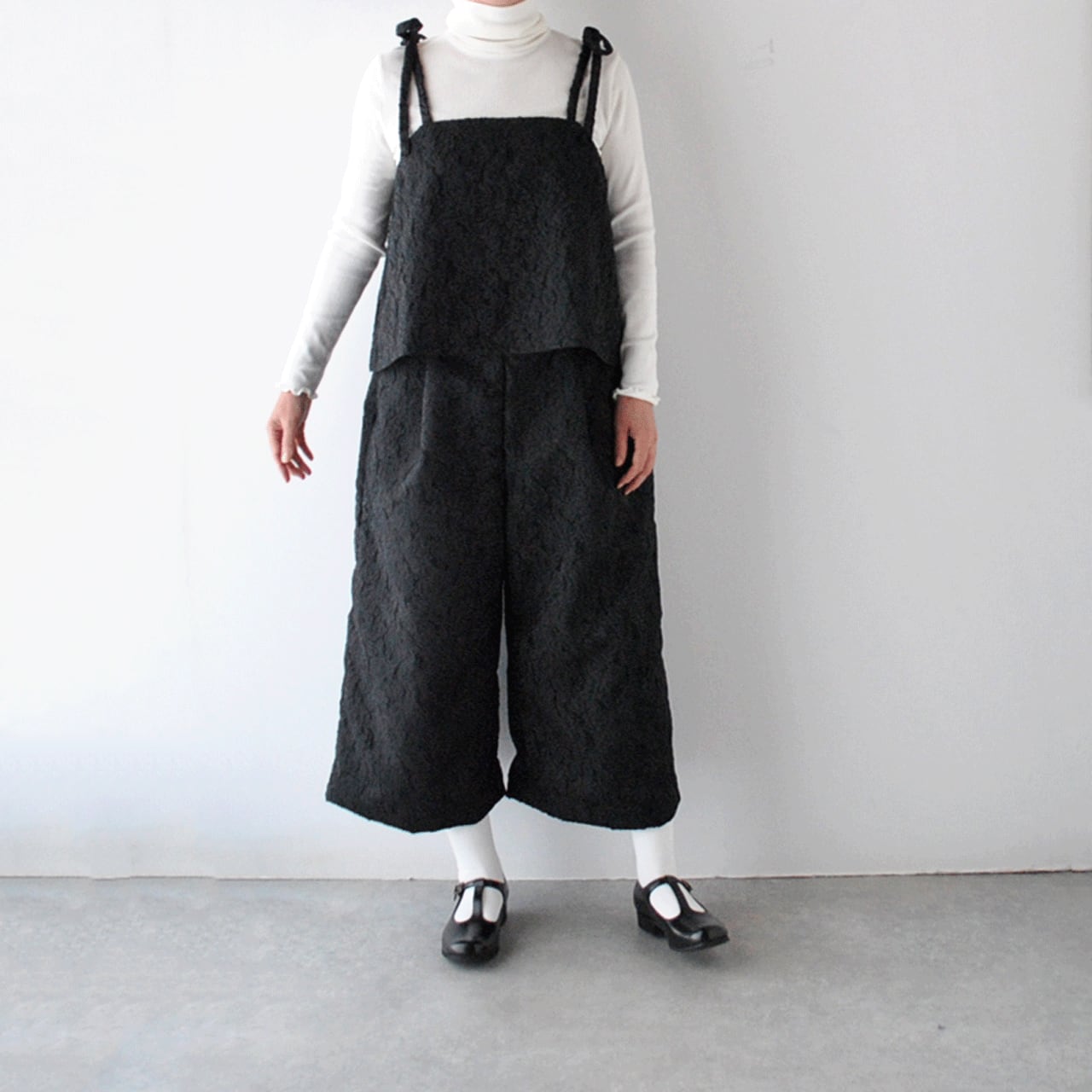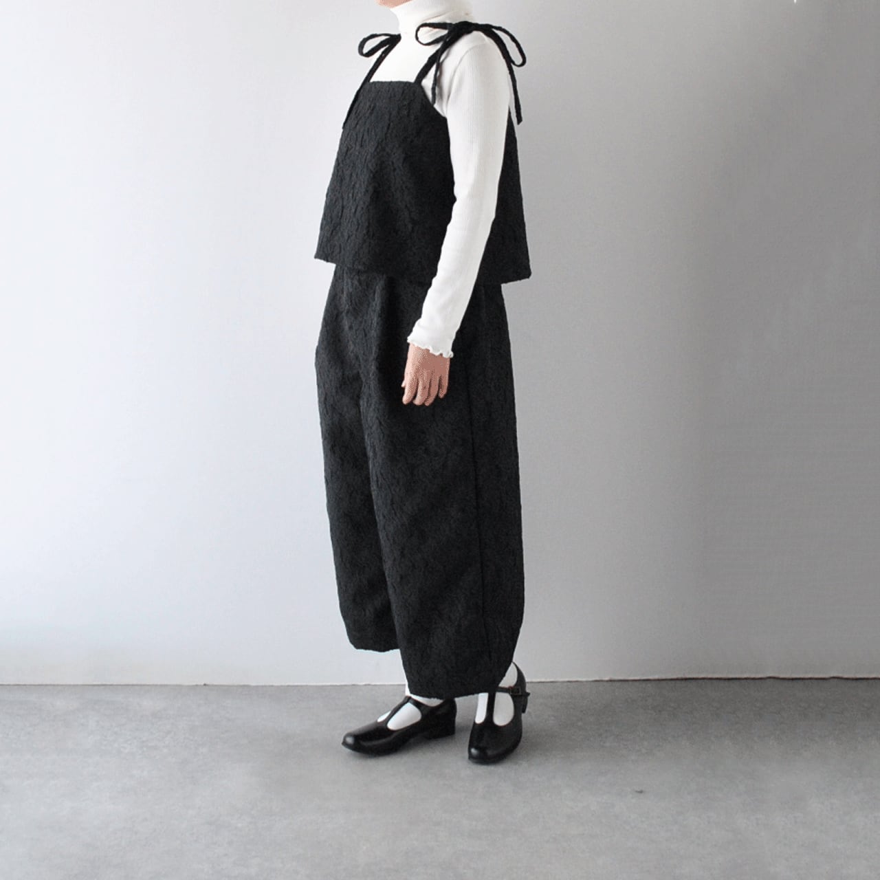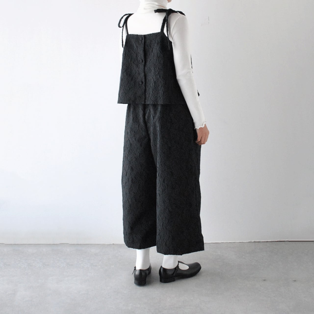 ROBE de PEAUから、立体感のある柄が美しいジャガード生地で仕立てたキャミソール型のトップスが届きました。これ、とっても可愛いですよ~。冬はタートルニット、夏はTシャツなどにサッと重ねるだけで雰囲気のあるスタイリングが完成するんです。肩ヒモは結ぶだけなので、お好みの位置で楽しんでくださいね。ふっくら軽い生地感で、シワになりにくいのも嬉しいポイント。同素材のパンツとのセットアップも素敵ですよ。
