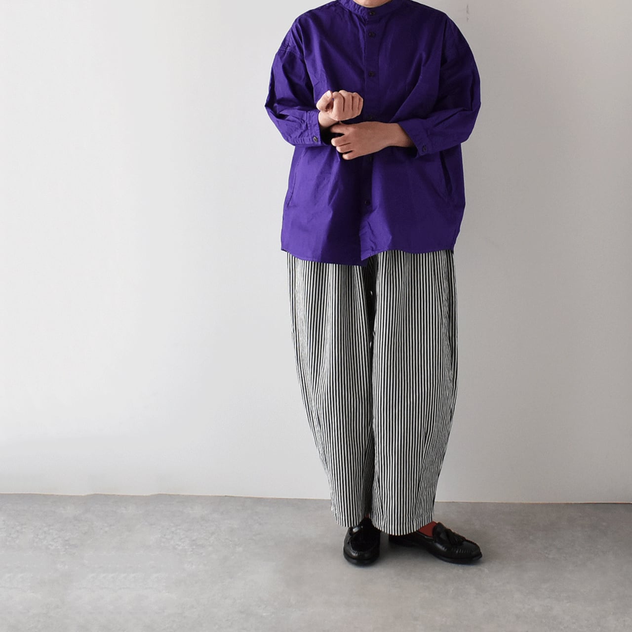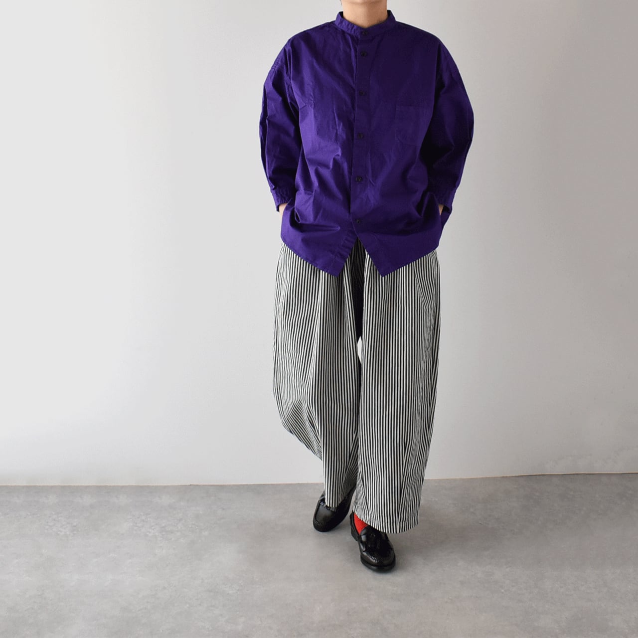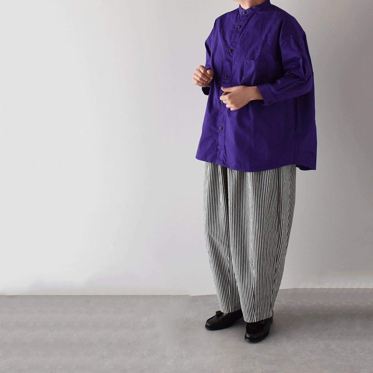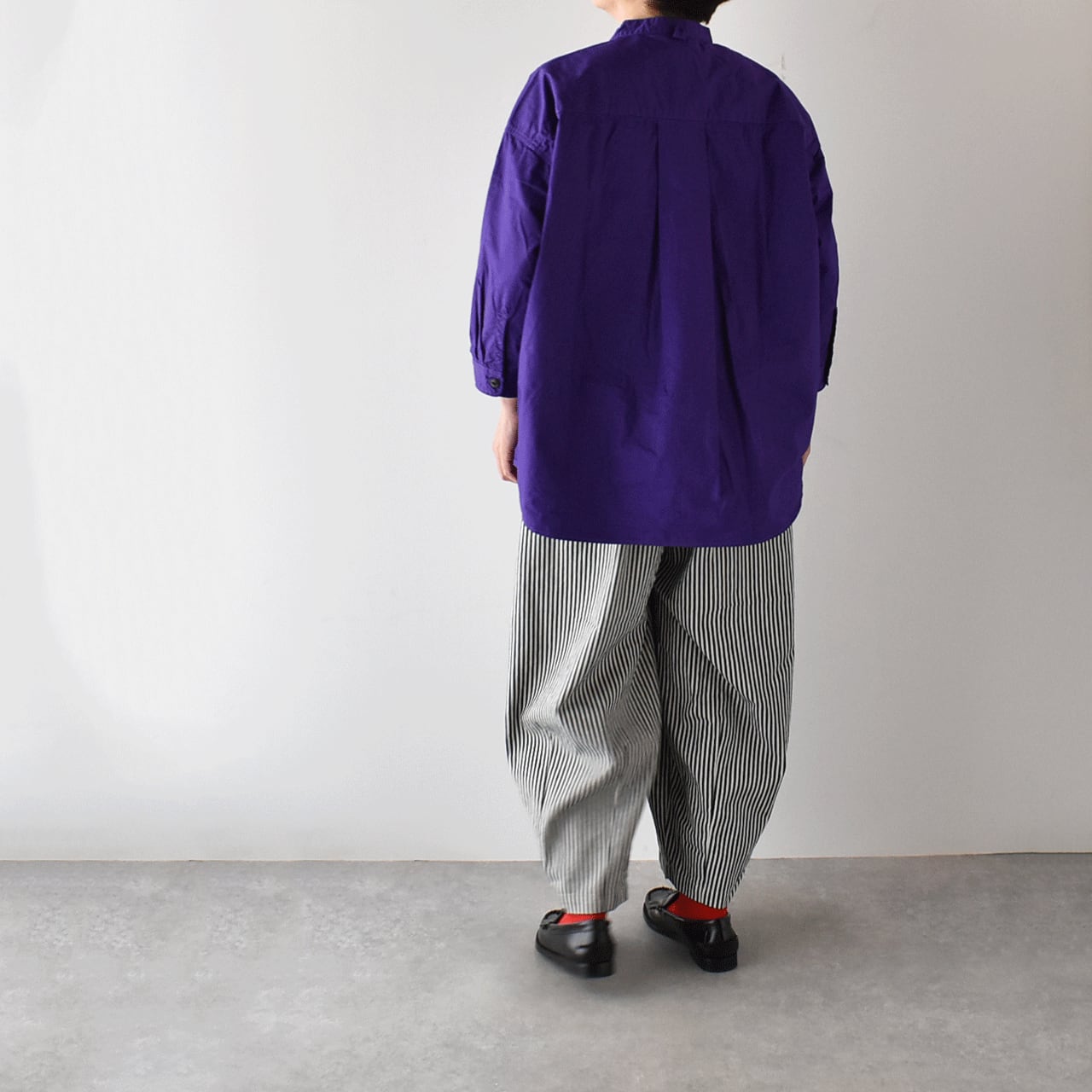 pritからワーク感のあるヒッコリーストライプデニムを使用したゆったりシルエットのイージーパンツが届きました。ぽってりと丸みを帯びたたっぷりのフォルムは、シンプルなトップスと合わせるだけで、簡単に愛らしく存在感のある着こなしを楽しめる一枚です。程よい厚みのライトデニムは堅さがなく、とってもしなやかで、履き心地もとってもラクチン。シーズンを問わず一年を通して沢山楽しめるのも嬉しいですね。一度履くときっと手放せなくなると思いますよ。ヒモ調節可能なゴムウエスト。