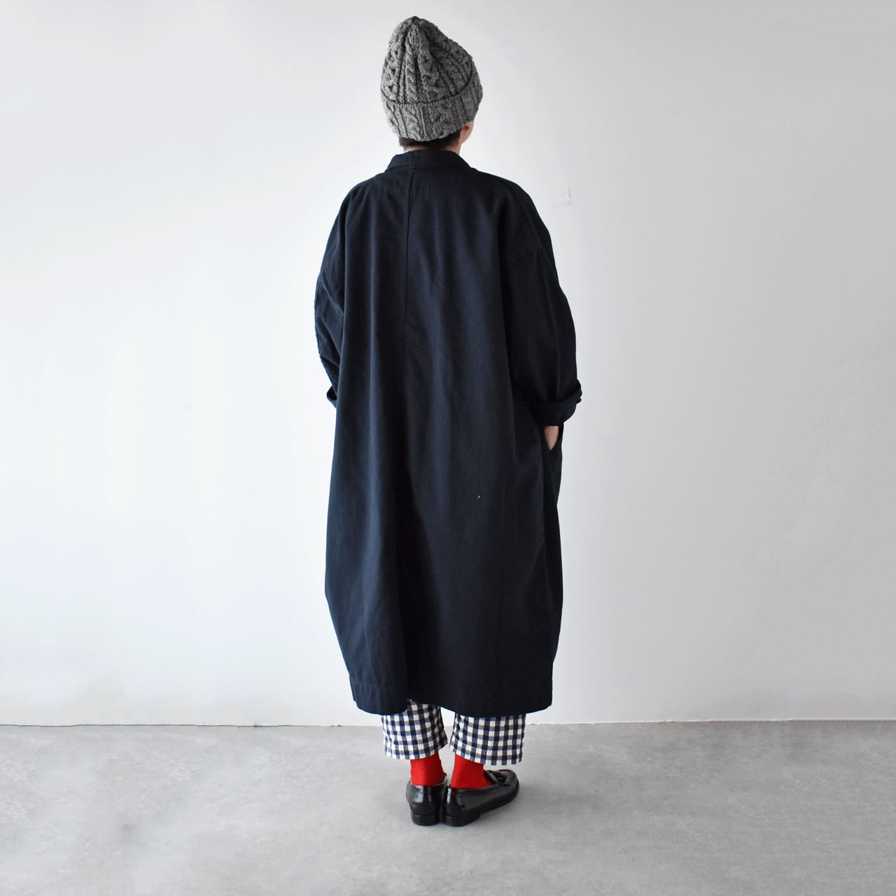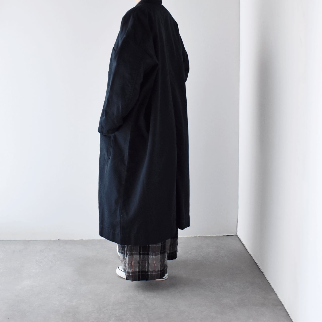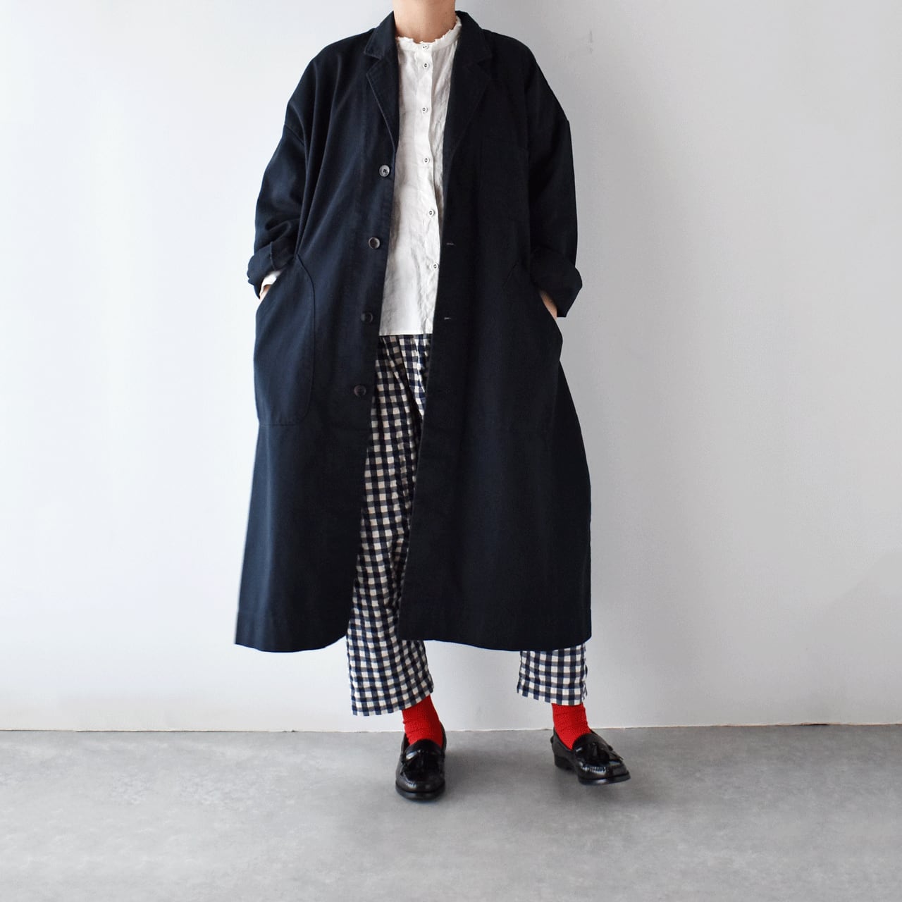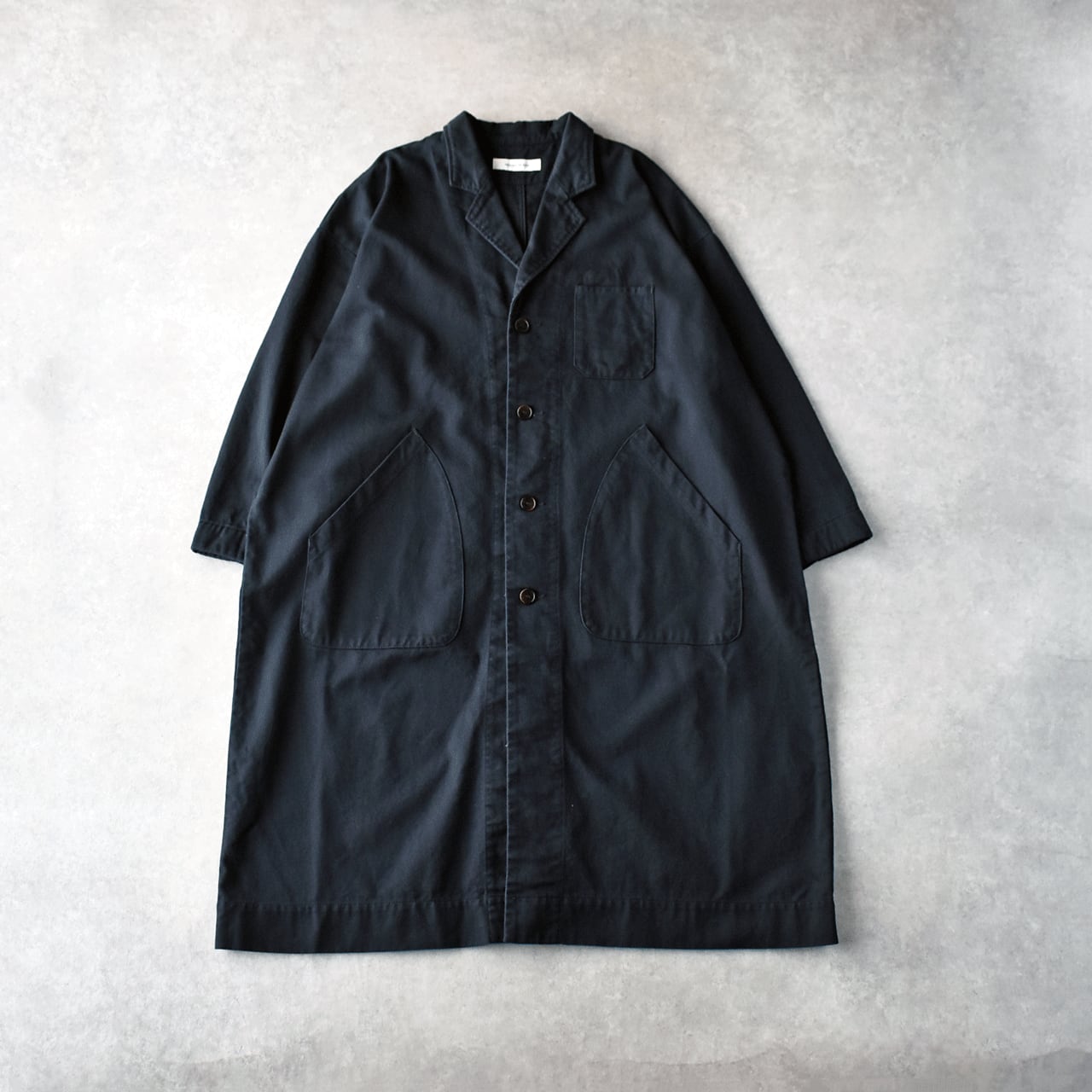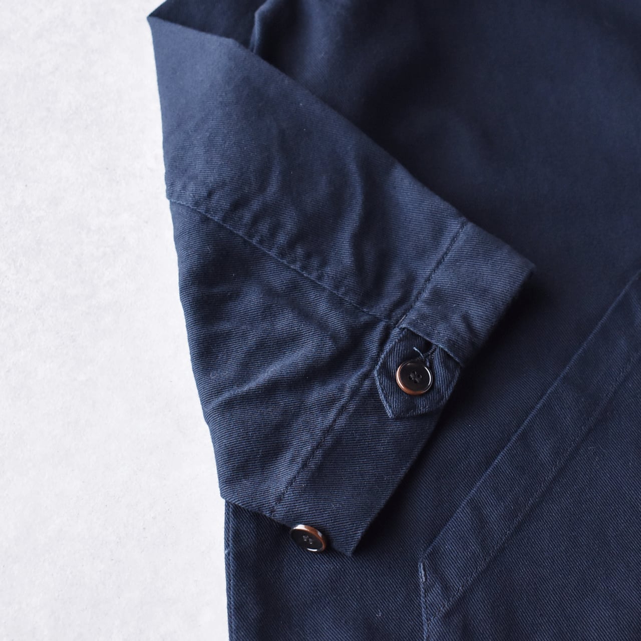 sasanqua by treesから、寒い時期から春先まで長く楽しめる新作のフレンチワークコートが届きました。ヴィンテージのマキニョンコートをお手本に、ゆったりとしたオーバーサイズシルエットに仕立てたモダンな一枚です。このコート、いつものパンツスタイルやワンピースにサッと羽織るだけで、全体の雰囲気をとても今っぽく仕上げてくれるので本当にオススメですよ。コットンリネンをツイルに織り上げた生地感も風合い豊かで、しっかりと厚みがありながらとてもしなやかで軽い着心地。両サイドには大きなポケット、胸には小ぶりなポケット、さらに左胸の内側にはスリムなペンポケットが付いているのも本格的。袖口にはベットが通っていて、ボタンを留める位置で袖幅の調整が可能。袖をクルクルッとロールアップすればこなれた印象で楽しめますよ。