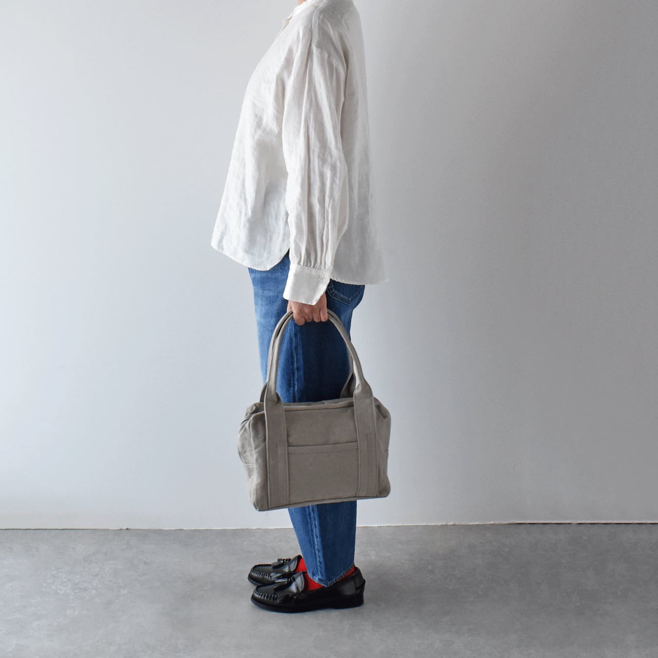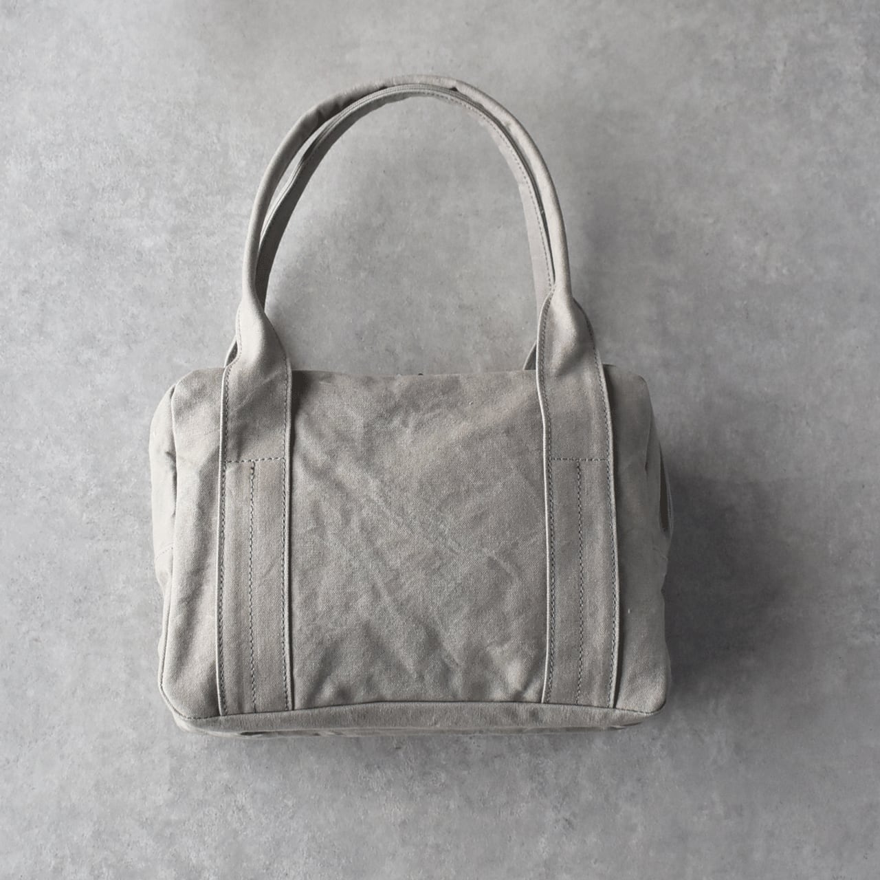 程よい硬さと厚みのある9号パラフィン帆布を使用したボックス型のトートバッグです。口元のファスナーは左右どちらからでも開閉できるダブルスライダーを採用しているので口が大きく開き、物の出し入れがしやすいです。コンパクトな見た目ですが、500mlのペットボトルが立てて収納出来るなど、日常使いには充分な収納力があります。表の片側と内側にポケットがあります。使用していく内に表面のパラフィン(ロウ)が少しずつ剥がれて風合いが増すのも素敵ですよ。