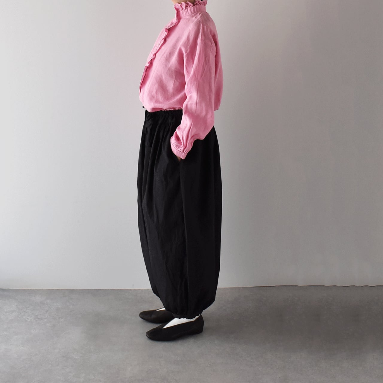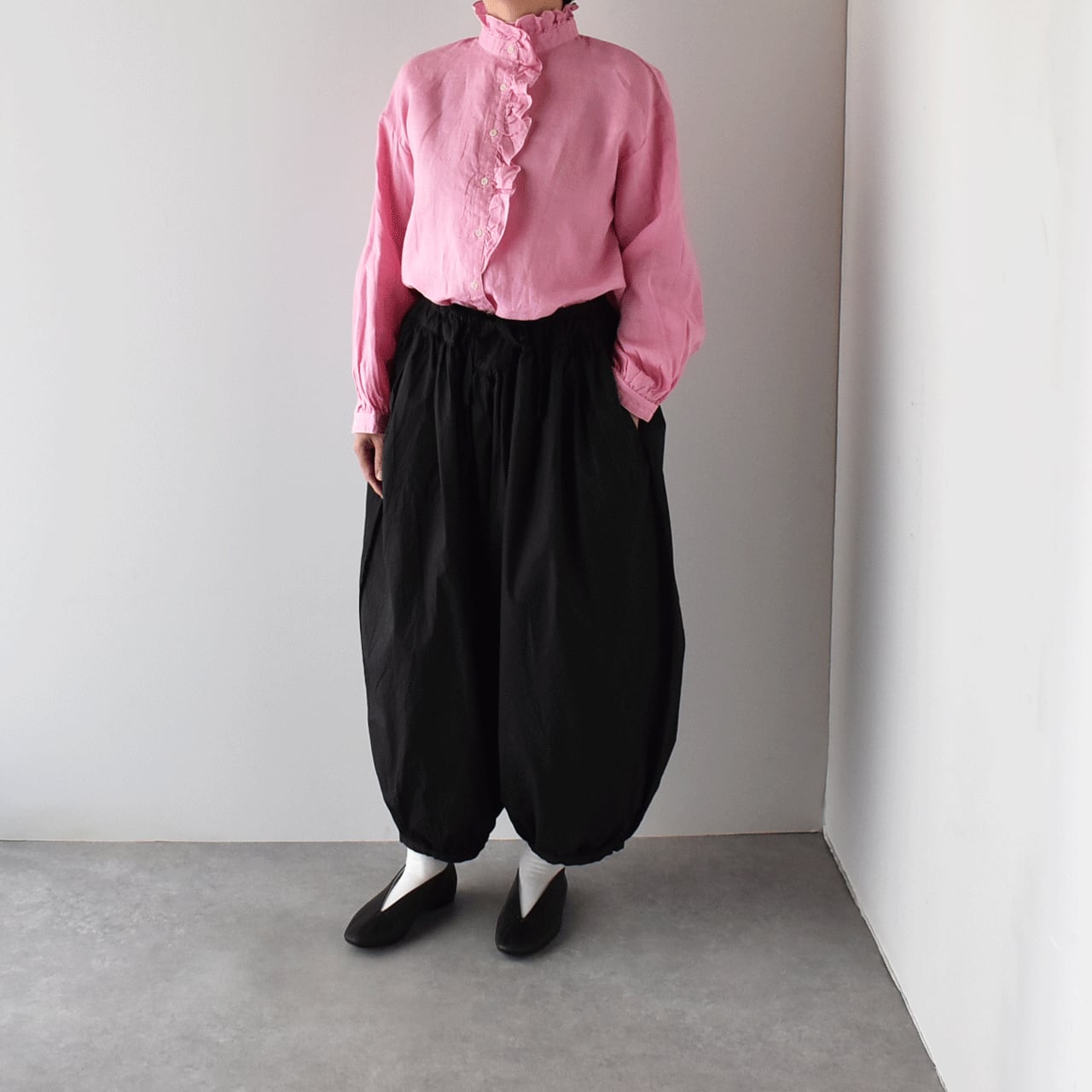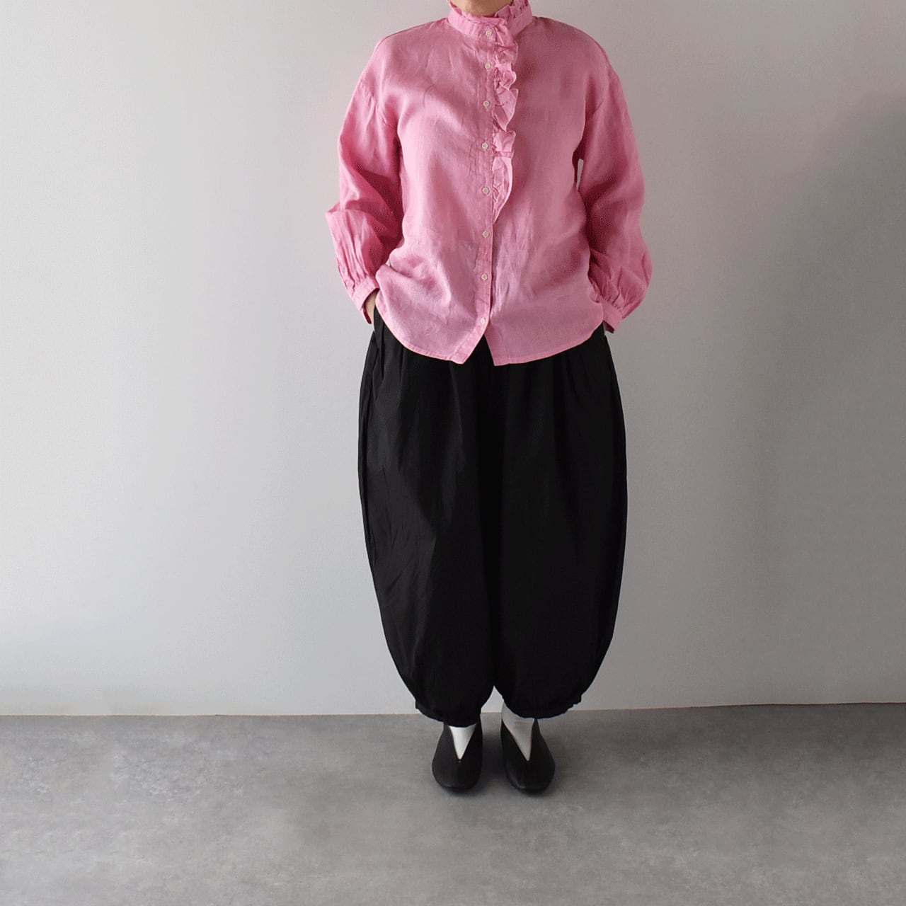 fog linen workから、襟元と前立てにロマンチックなフリルをあしらった、リネン素材のブラウスが届きました。立ち上がりのついた襟はボタンを開けてもカッコよく決まります。デニムとシンプルに合わせたり、サロペットのインナーとしてフリルを印象的に見せる着こなしもオススメ。セレモニーシーズンは、ジャケットに合わせるのも華やかですよ。様々なスタイルにとっても上品にお使い頂ける一枚です。