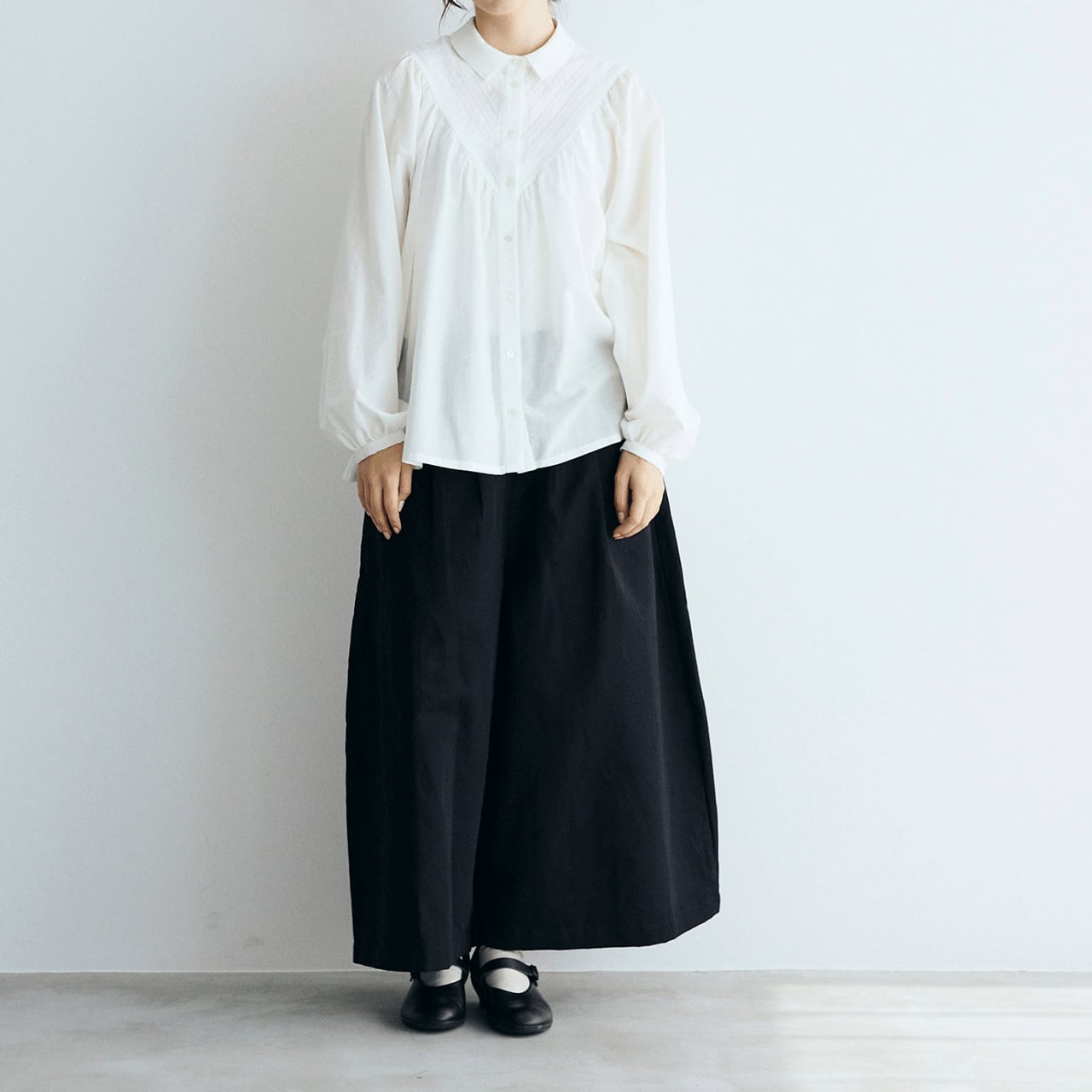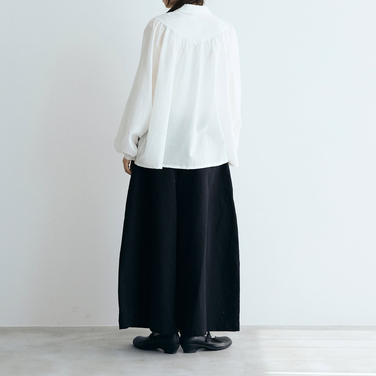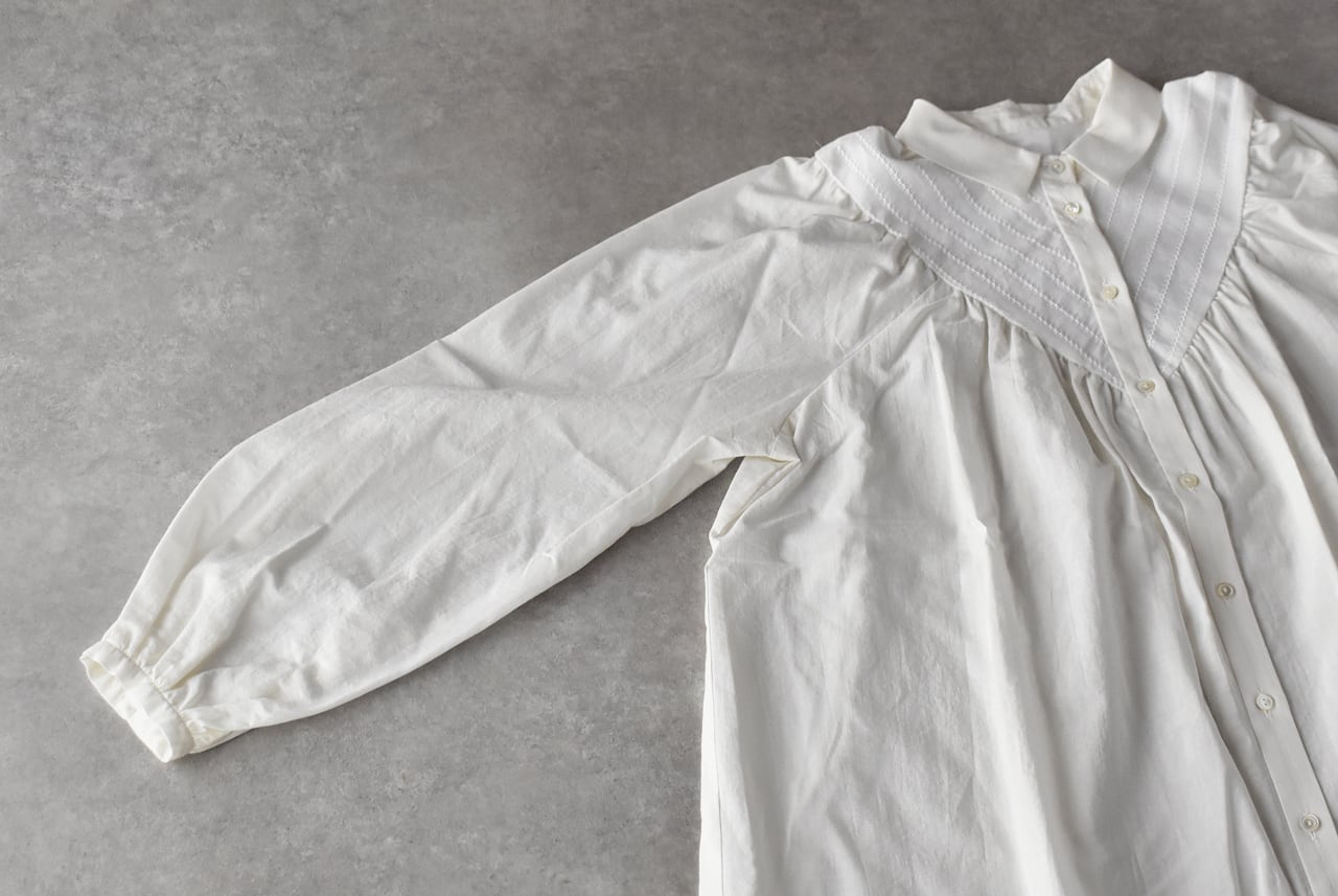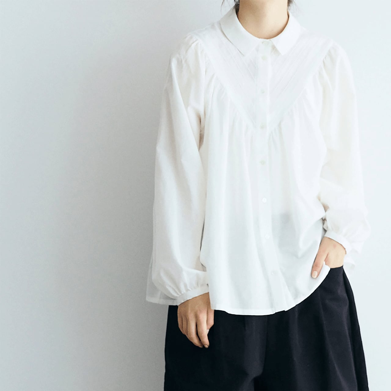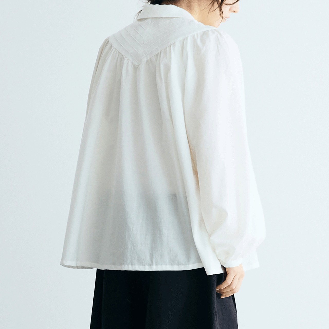MAGALIから、心待ちにしていた2026シーズンの春服の入荷がスタートしました~。こちらは肩口から胸元へと繊細なレースの切替を施した、クラシカルで気品を感じさせるコットンシルク素材のブラウスです。流れるようなギャザーもとっても美しく、ちょこんと添えられた小ぶりな襟が凛とした全体の雰囲気にほんの少しの愛らしさをプラスしてくれています。上質なコットンシルクは空気を含んだような軽い質感とシルク特有のキメ細かく滑らかな肌触りが心地よくとても快適。長く大切に着たくなる一枚です。