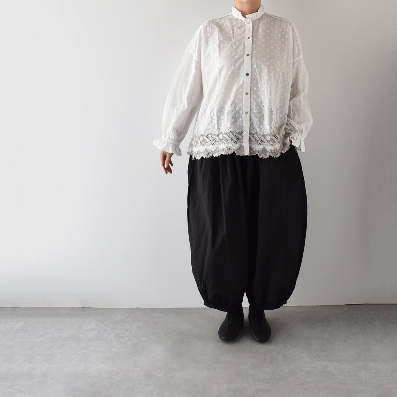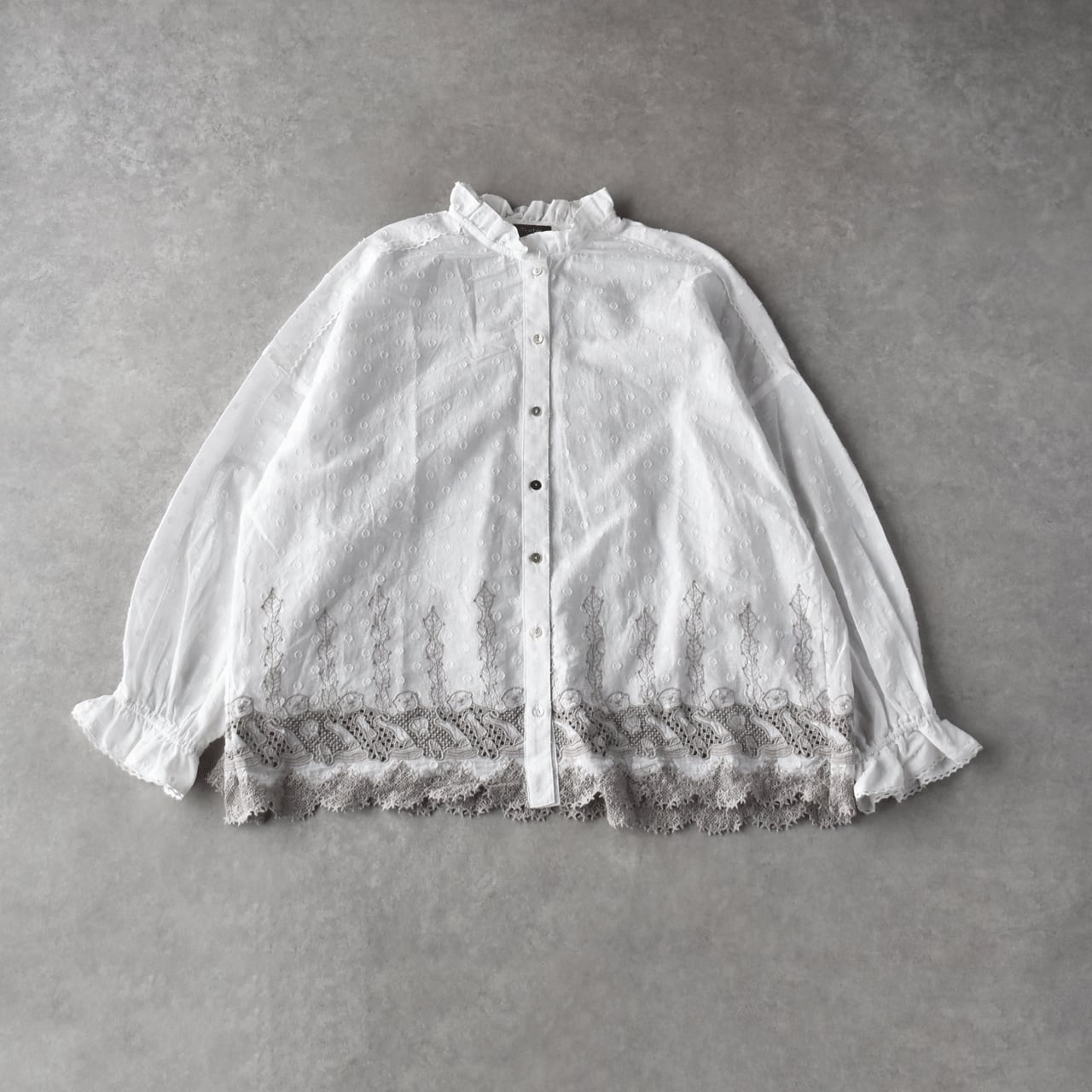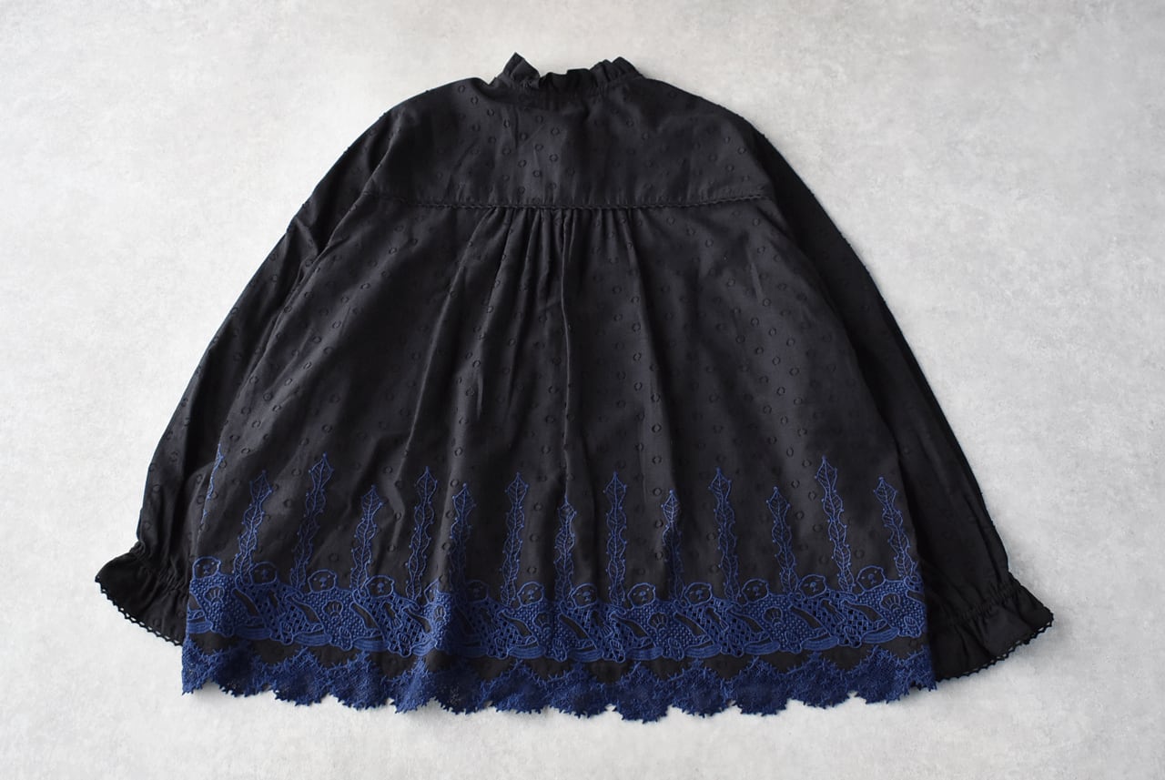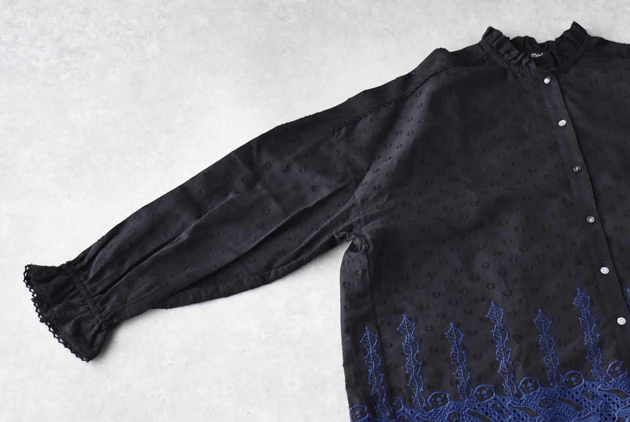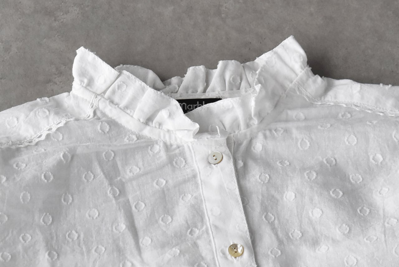 流されない様に手をつないでお昼寝中のラッコ達が可愛いレースになったmarble SUDの「ラッコレース」シリーズ。立体的なドット模様の柔らかなコットンドビー生地は、やや透け感のあるとっても軽やかな素材感です。こちらは襟と袖口のフリル使いが印象的なフリルスタンドカラーブラウス。裾の前後にぐるりとラッコレースをあしらいました。一枚でシンプルに楽しむのはもちろん、サロペットのインナーとしてフリルを強調したり、ニットやスウェットの襟元からフリルをチラ見せするのもオススメですよ。