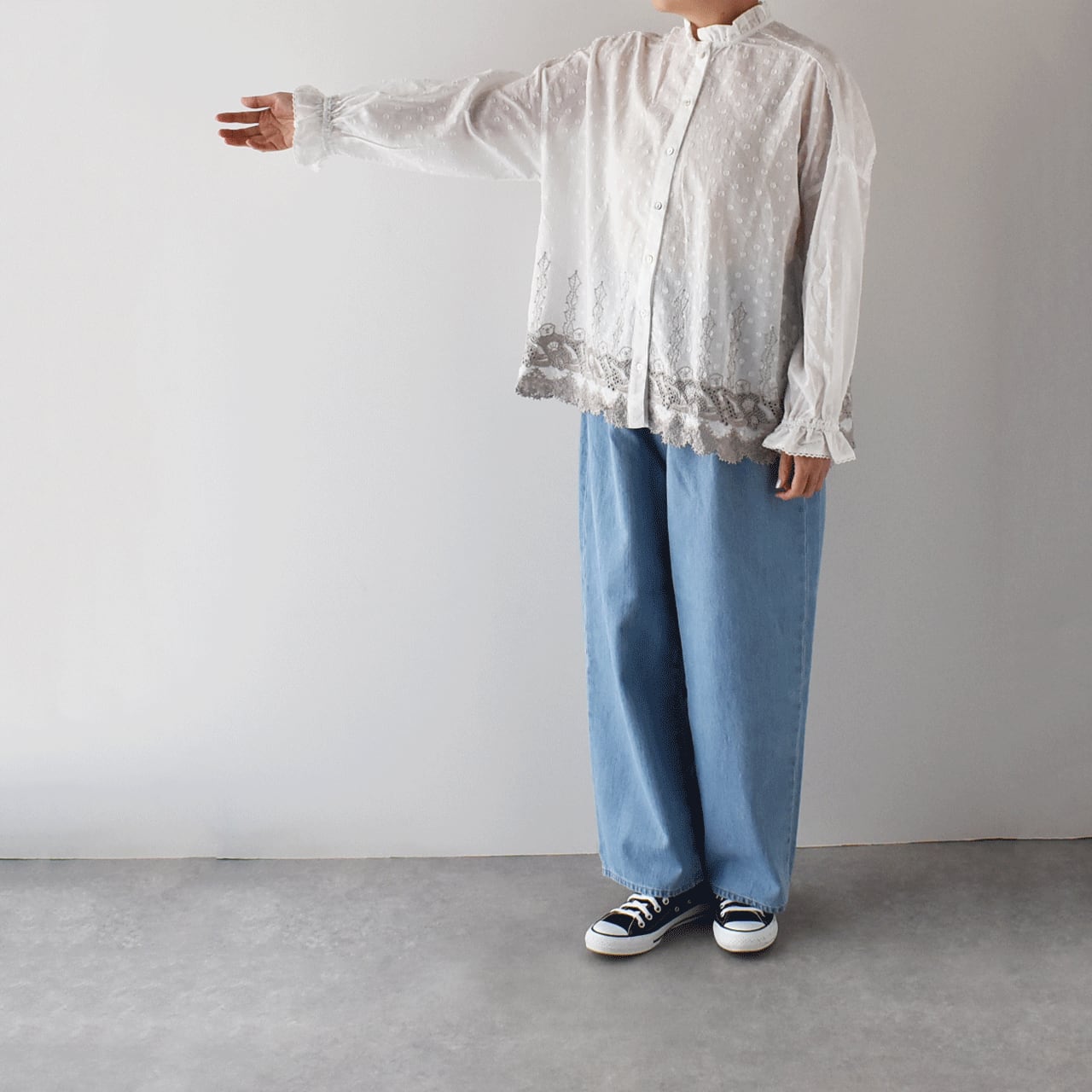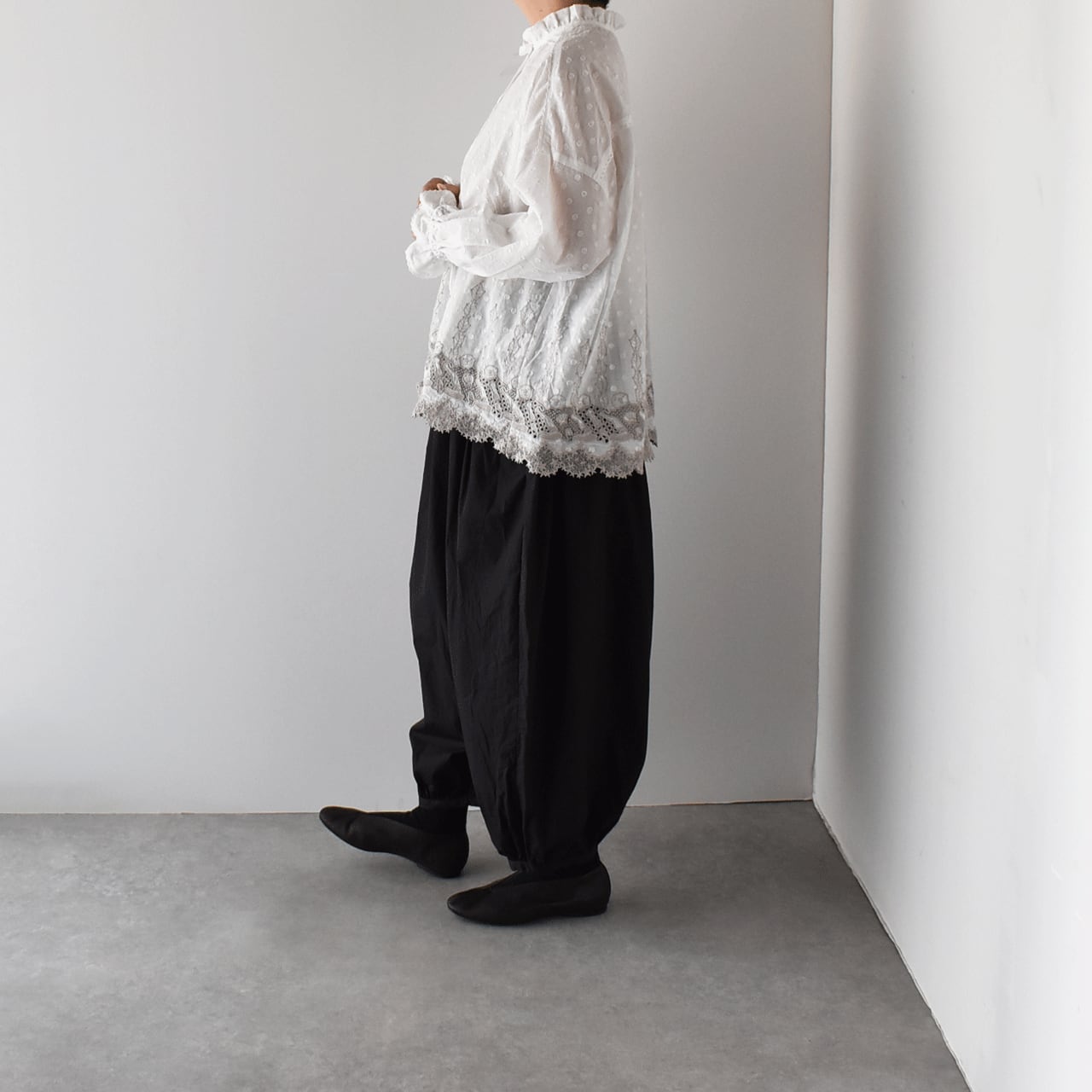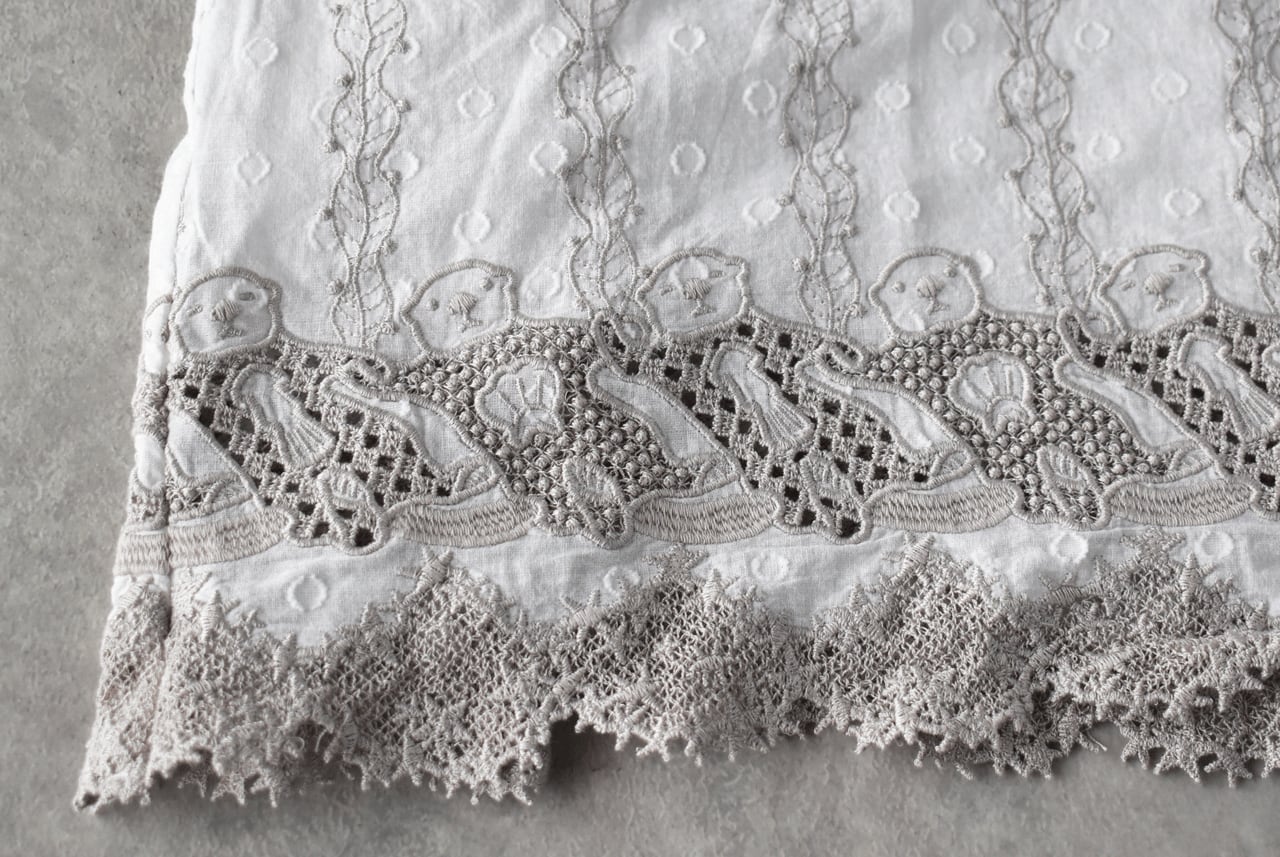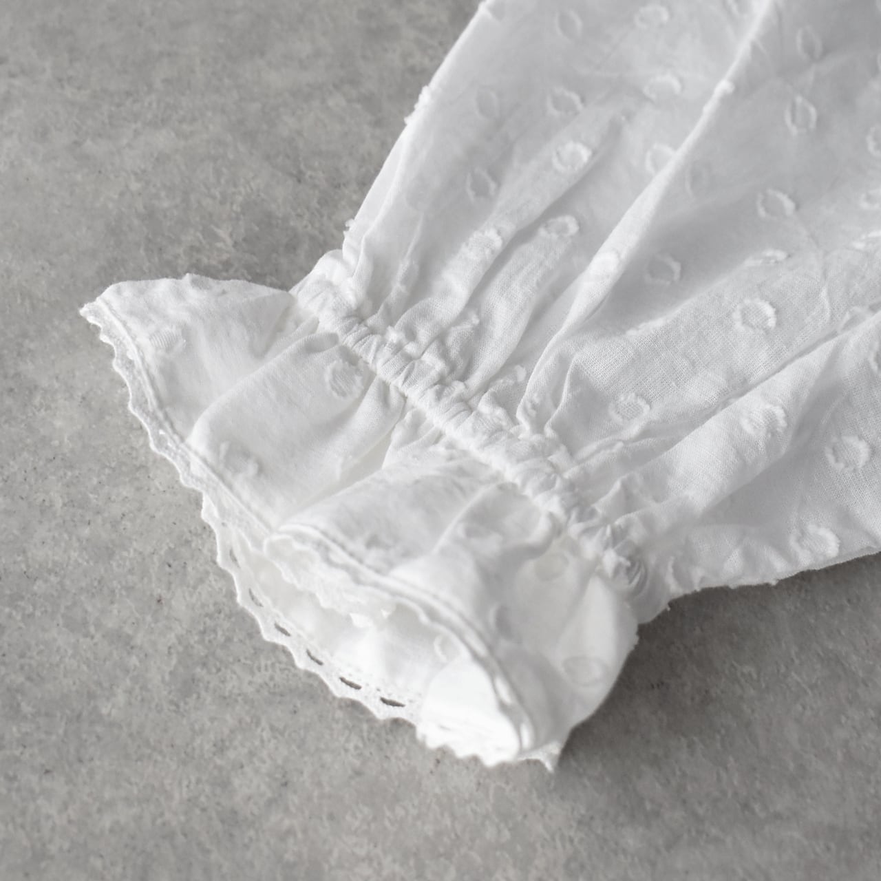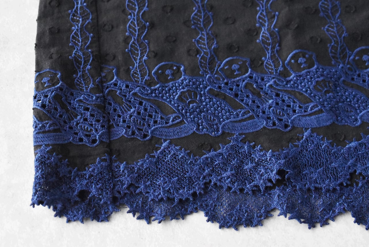 流されない様に手をつないでお昼寝中のラッコ達が可愛いレースになったmarble SUDの「ラッコレース」シリーズ。立体的なドット模様の柔らかなコットンドビー生地は、やや透け感のあるとっても軽やかな素材感です。こちらは襟と袖口のフリル使いが印象的なフリルスタンドカラーブラウス。裾の前後にぐるりとラッコレースをあしらいました。一枚でシンプルに楽しむのはもちろん、サロペットのインナーとしてフリルを強調したり、ニットやスウェットの襟元からフリルをチラ見せするのもオススメですよ。