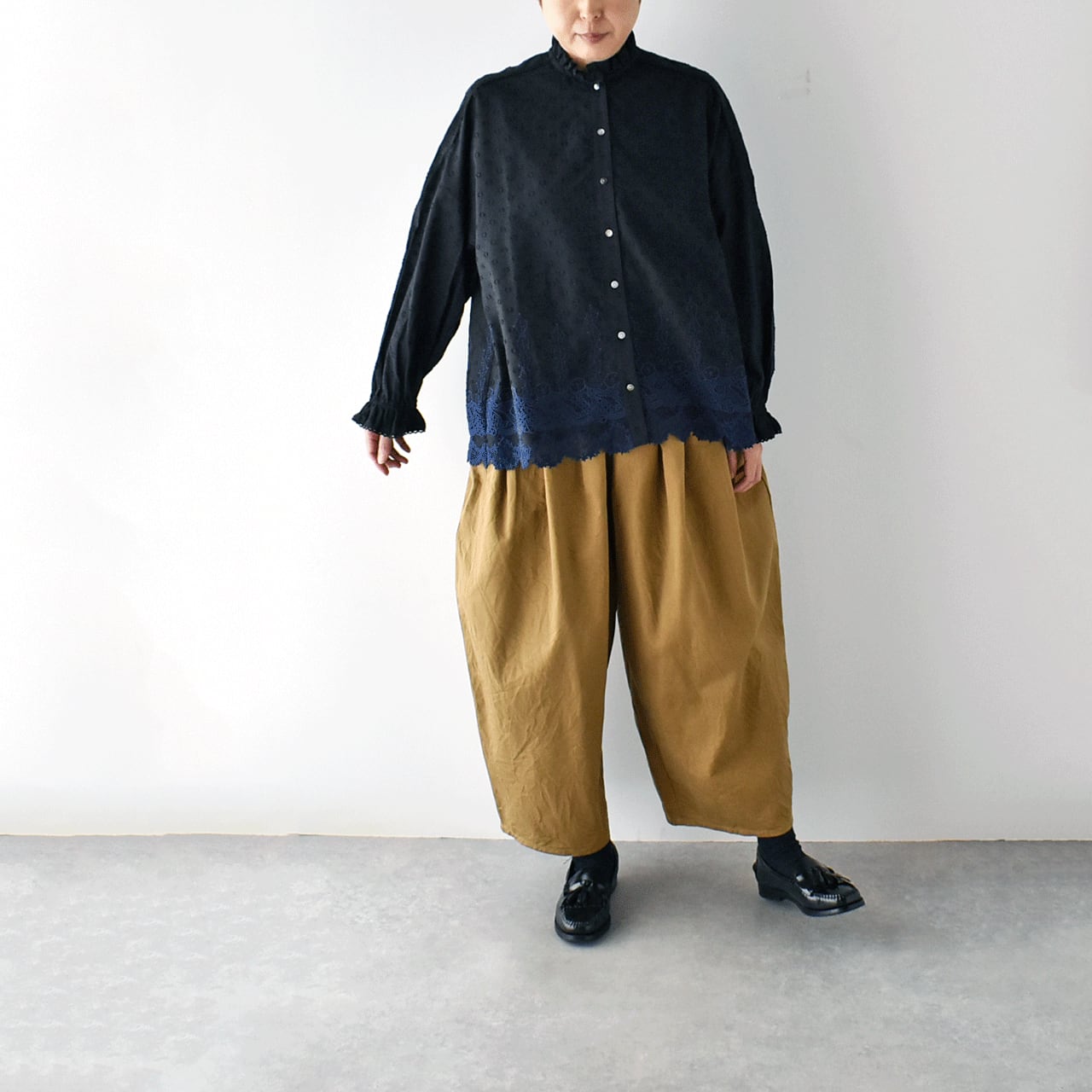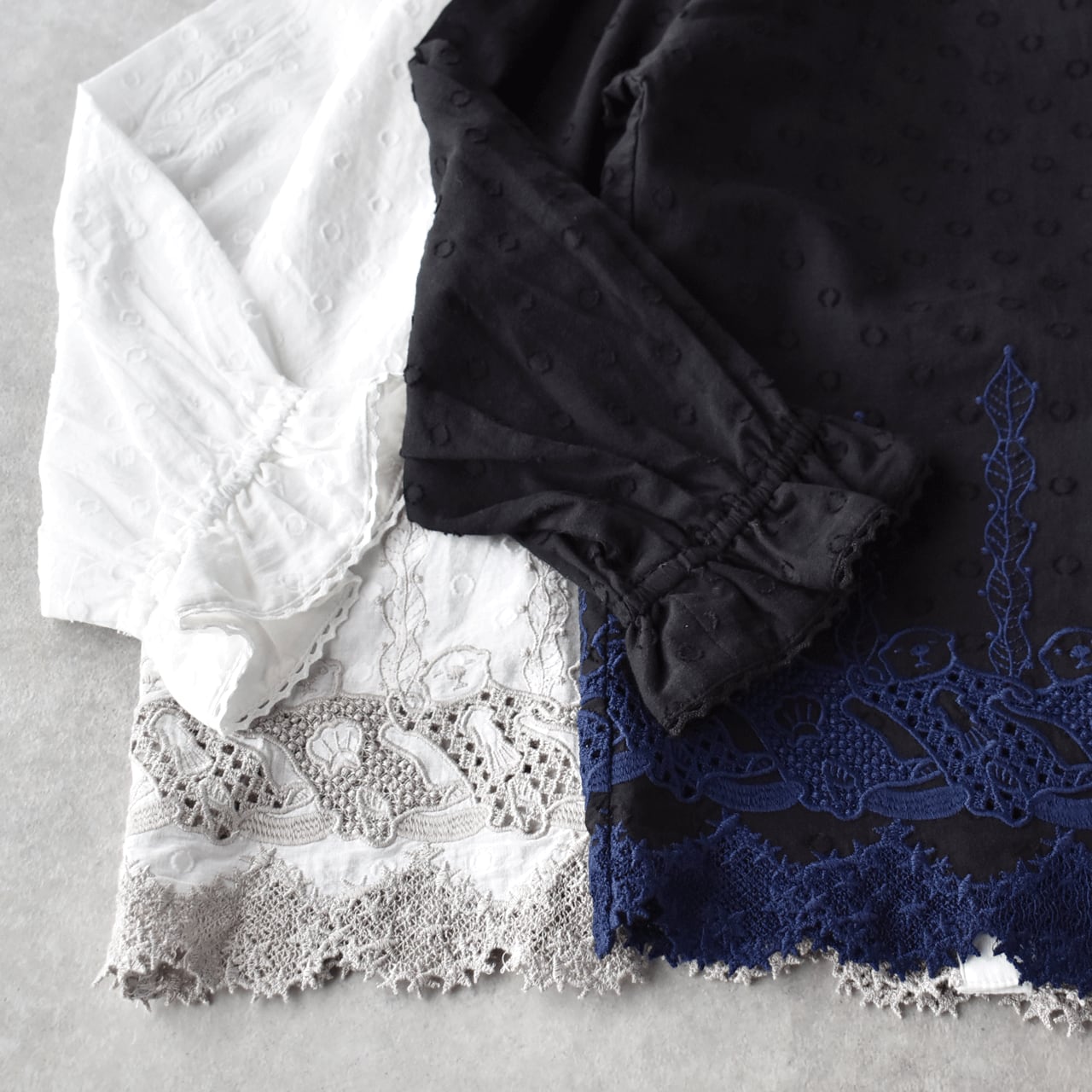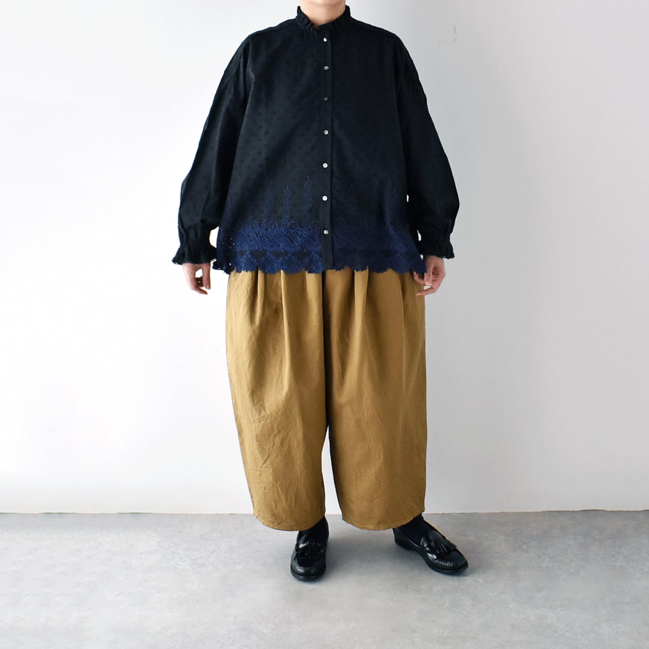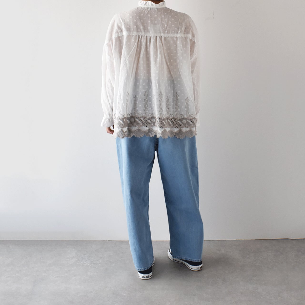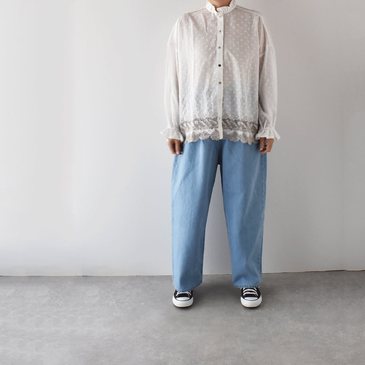 流されない様に手をつないでお昼寝中のラッコ達が可愛いレースになったmarble SUDの「ラッコレース」シリーズ。立体的なドット模様の柔らかなコットンドビー生地は、やや透け感のあるとっても軽やかな素材感です。こちらは襟と袖口のフリル使いが印象的なフリルスタンドカラーブラウス。裾の前後にぐるりとラッコレースをあしらいました。一枚でシンプルに楽しむのはもちろん、サロペットのインナーとしてフリルを強調したり、ニットやスウェットの襟元からフリルをチラ見せするのもオススメですよ。