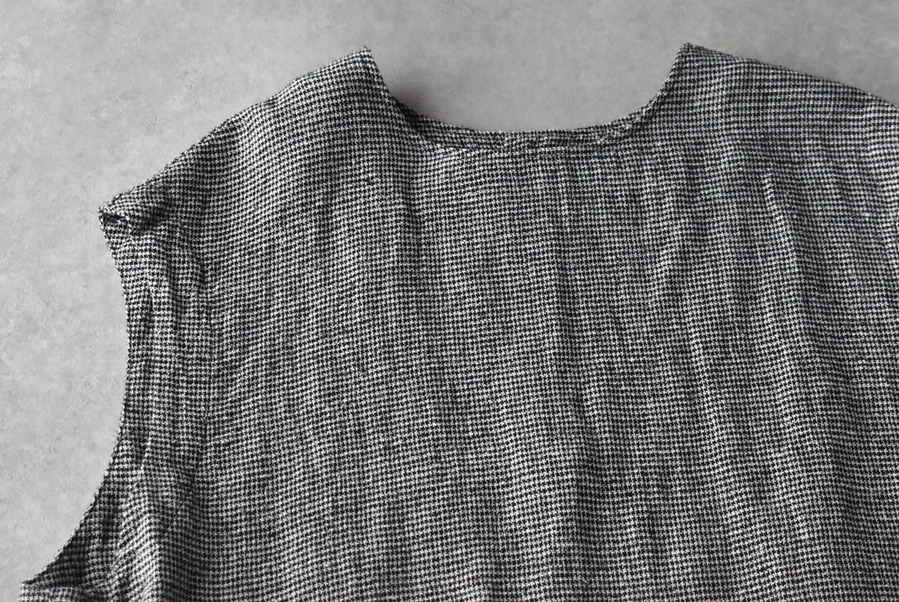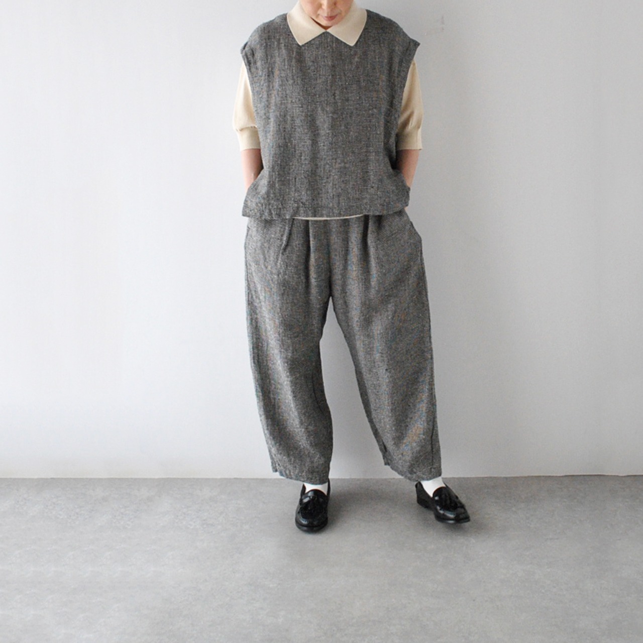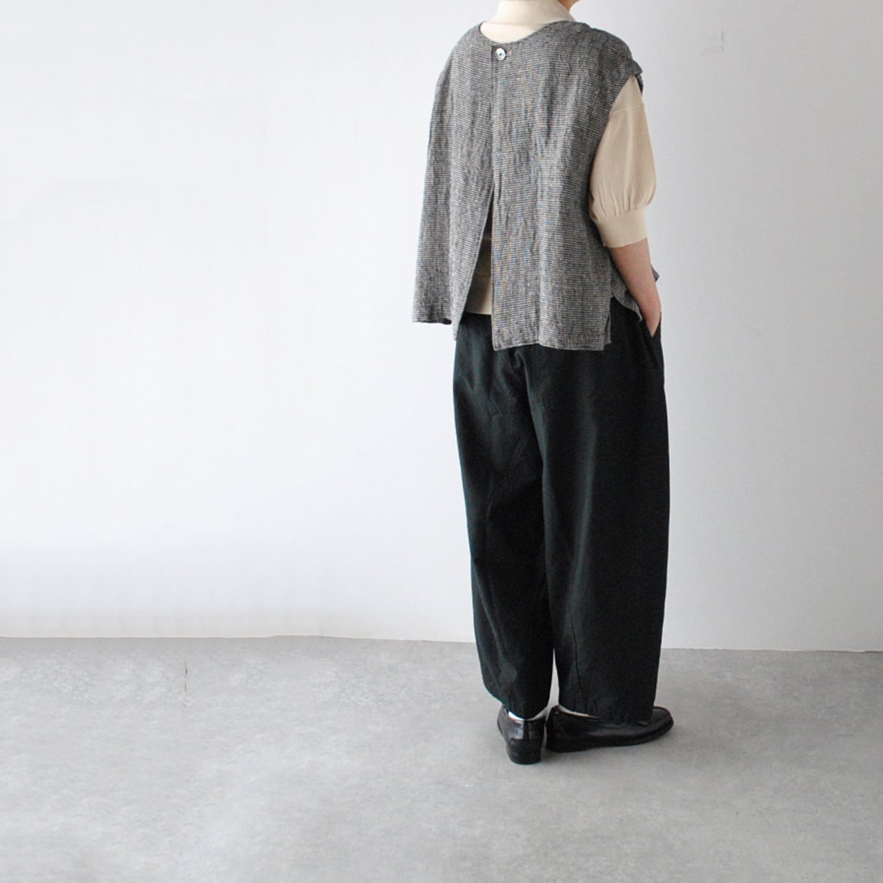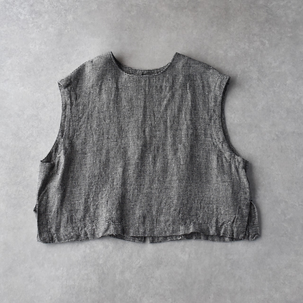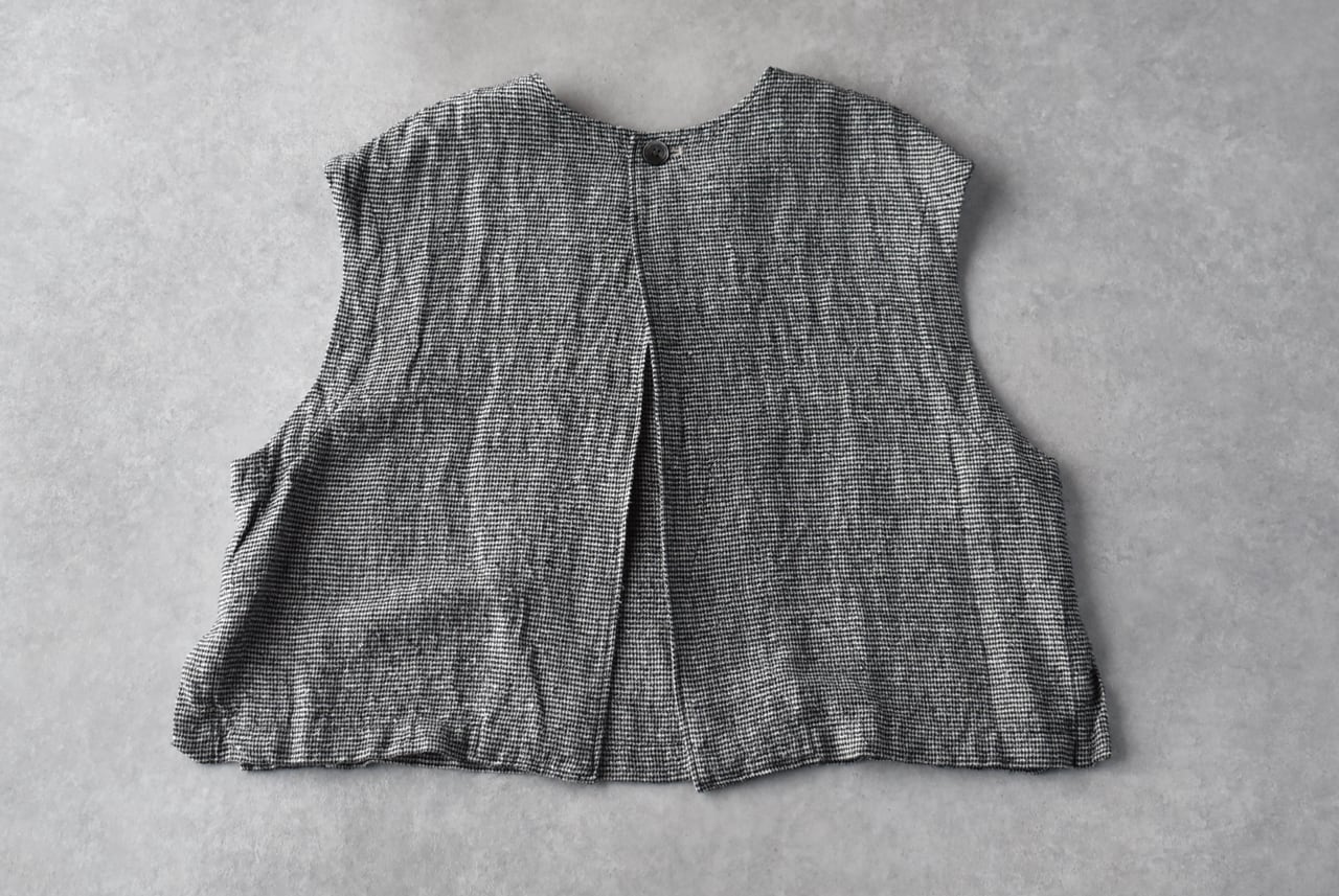 pritから、リネンにシルクをブレンドした、ふっくら柔らかなガーゼのような風合いが心地よい、ワンボタンのベストが届きました。クラシカルな千鳥格子柄は、おじさんチックな可愛らしさがありますね。ブラウスやTシャツに重ねれば、春夏の着こなしがニュアンスたっぷりに仕上がりますよ。ボタンの面を前にしても後ろにしても着用できる2WAY仕様で、身幅、アームホールが広いのでゆったり楽しめます。パンツにもスカートにもとってもバランスのよい丈感です。