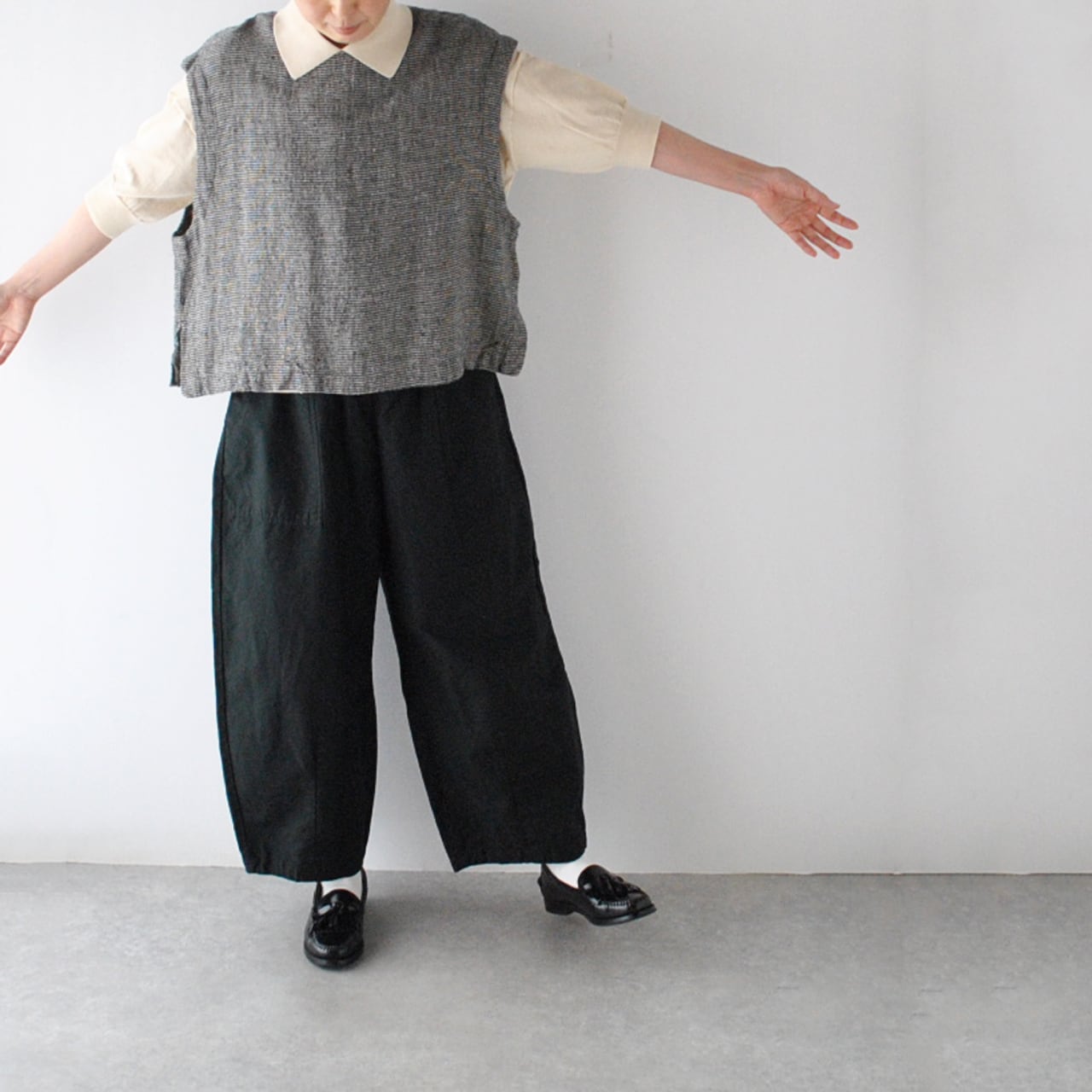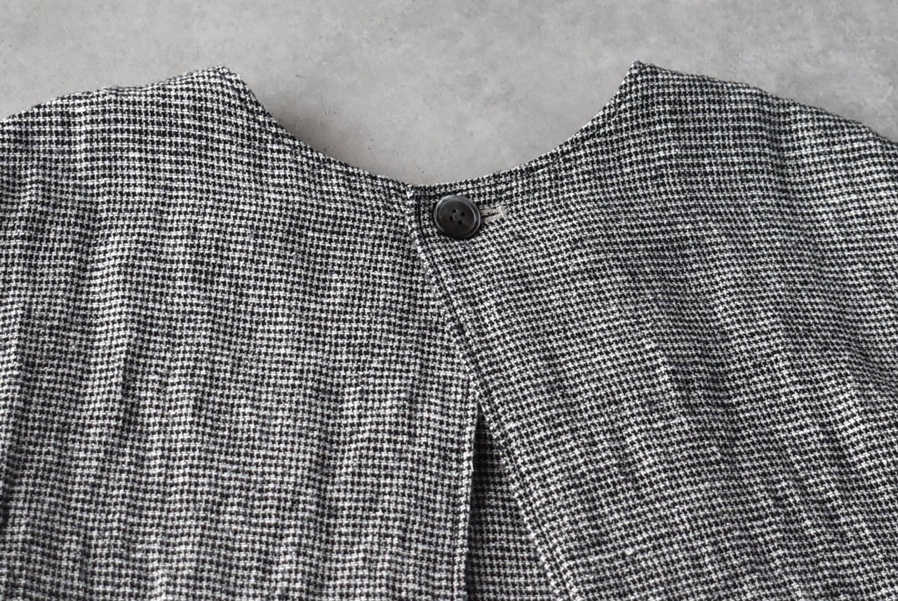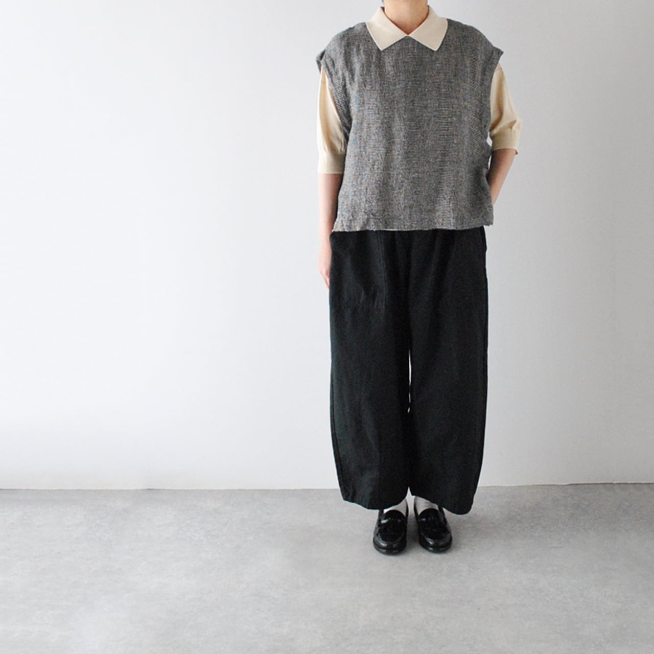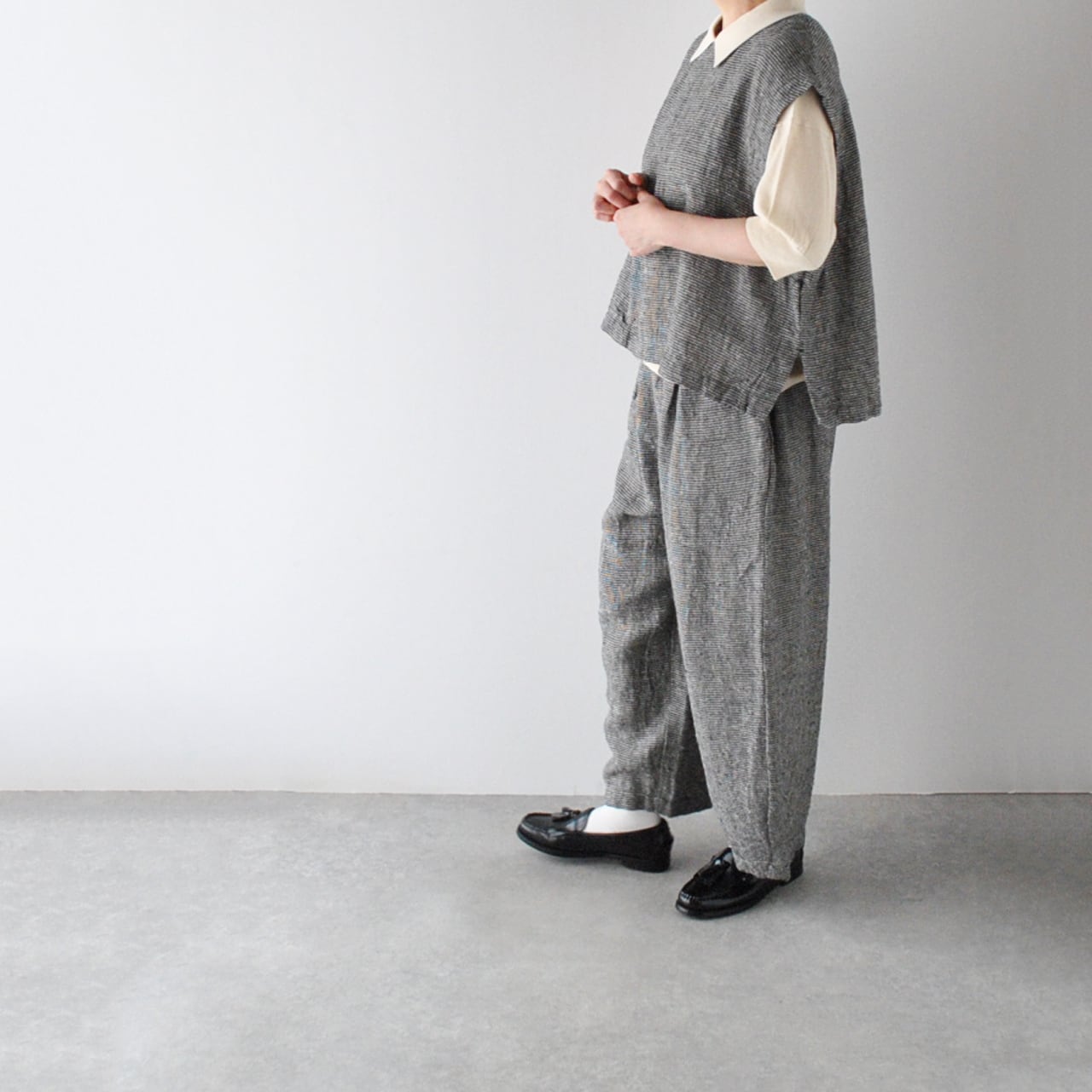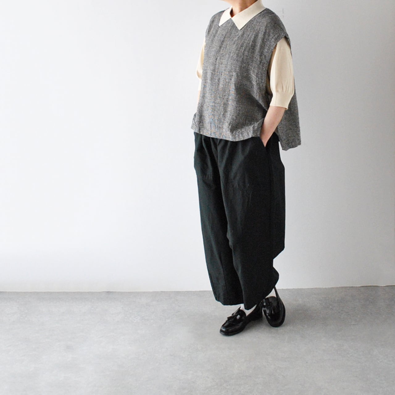 pritから、リネンにシルクをブレンドした、ふっくら柔らかなガーゼのような風合いが心地よい、ワンボタンのベストが届きました。クラシカルな千鳥格子柄は、おじさんチックな可愛らしさがありますね。ブラウスやTシャツに重ねれば、春夏の着こなしがニュアンスたっぷりに仕上がりますよ。ボタンの面を前にしても後ろにしても着用できる2WAY仕様で、身幅、アームホールが広いのでゆったり楽しめます。パンツにもスカートにもとってもバランスのよい丈感です。