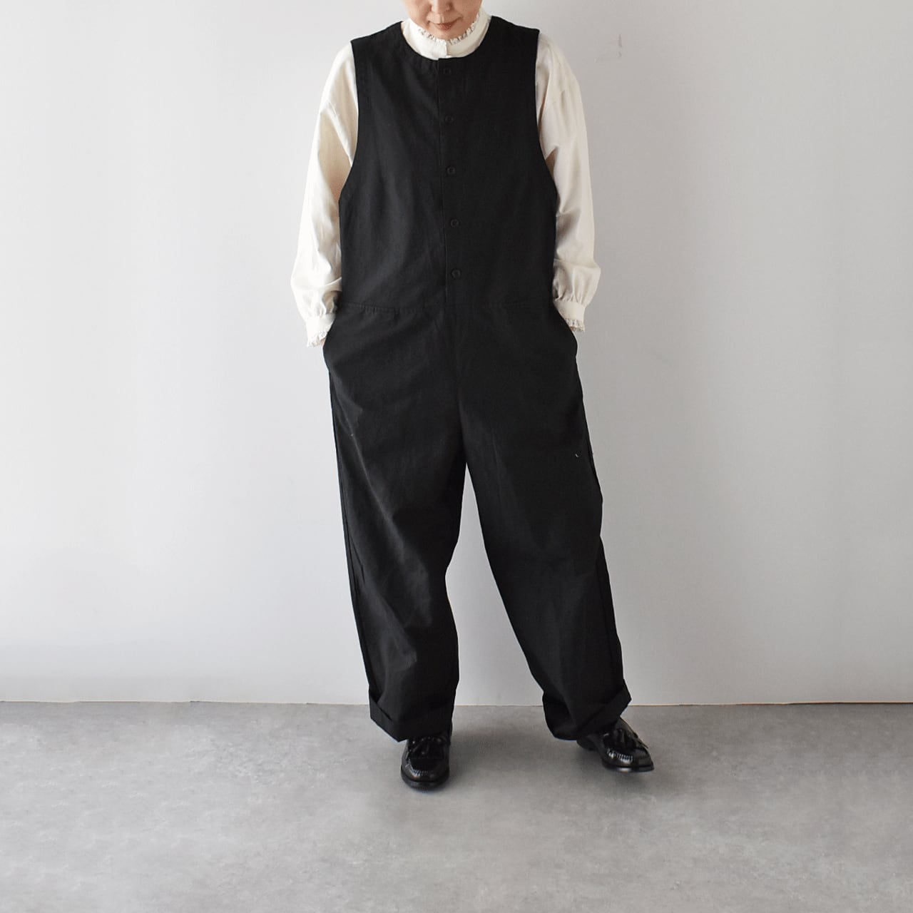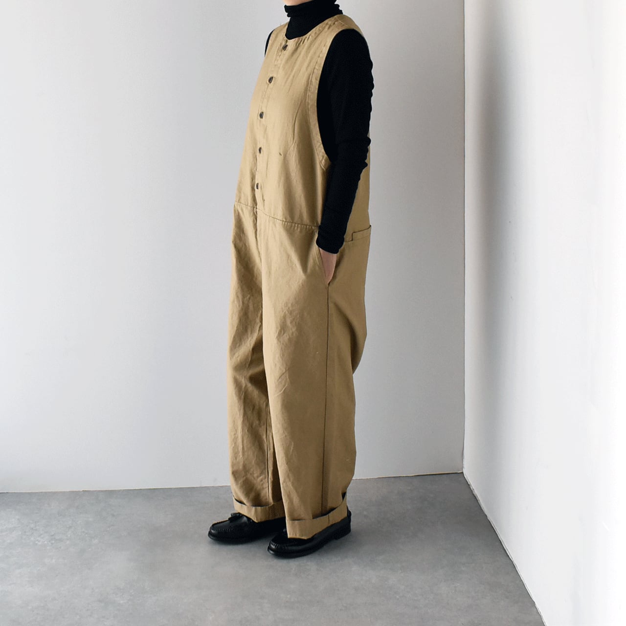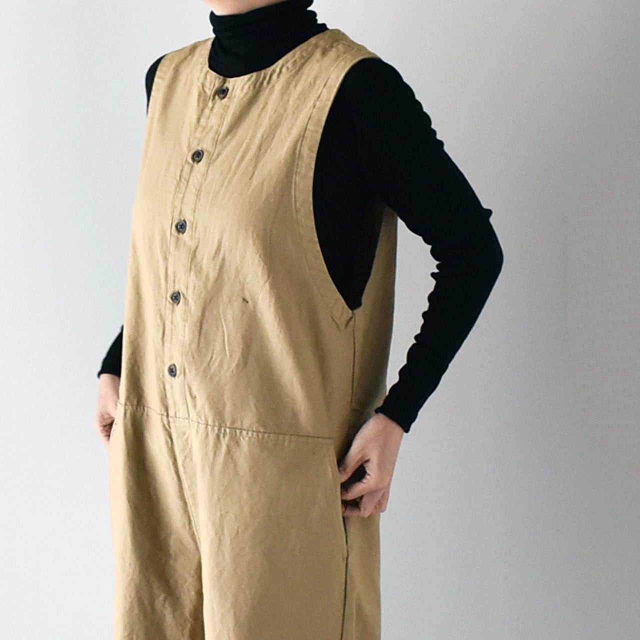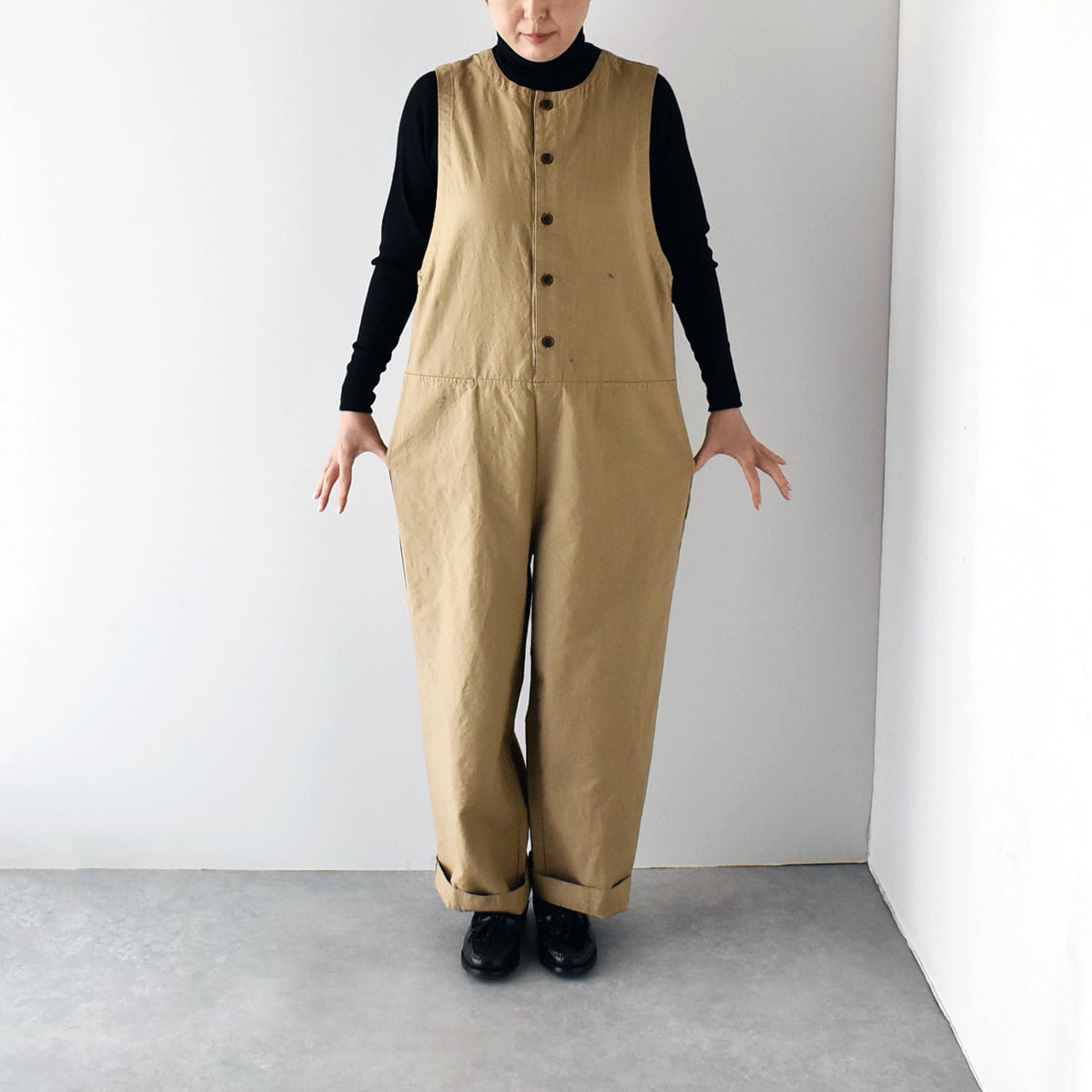 pritから、一年を通してとっても可愛いシルエットで着用頂けるオールインワンが届きました。インナーにお気に入りのブラウスやタートルネック、ボーダーTなどを合わせるだけで、簡単に雰囲気よく楽しめる一枚です。程よい厚みのあるコットンリネン素材は、しなやかで軽い着心地。股上が深く、包み込まれるような安心感がありますよ。今の時期はコートをサッと羽織っても素敵なコーディネートが完成しますよ。