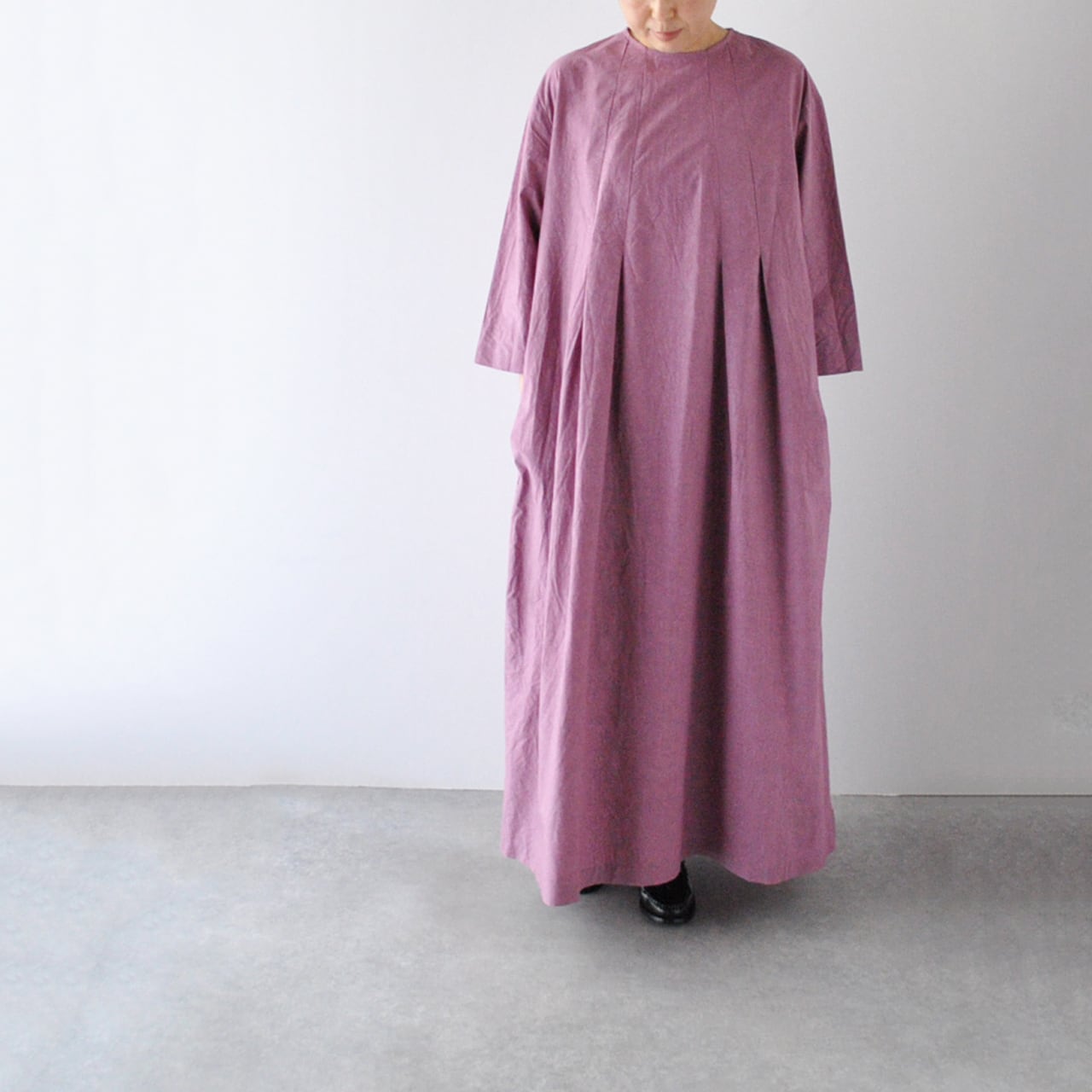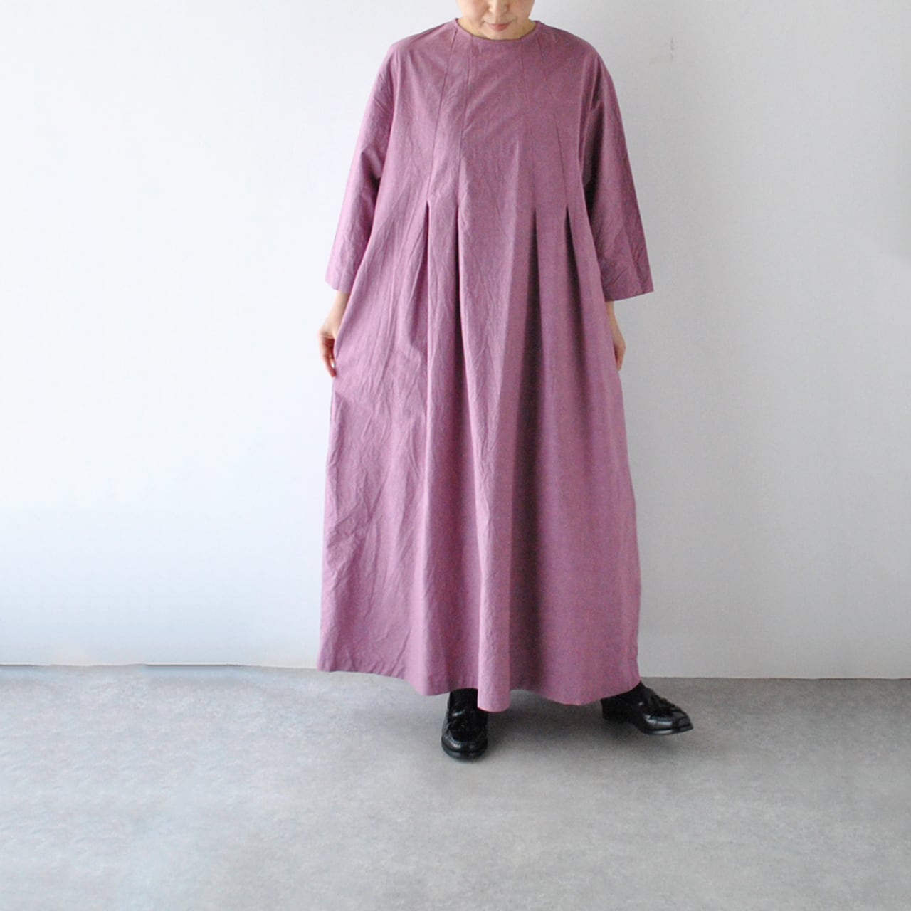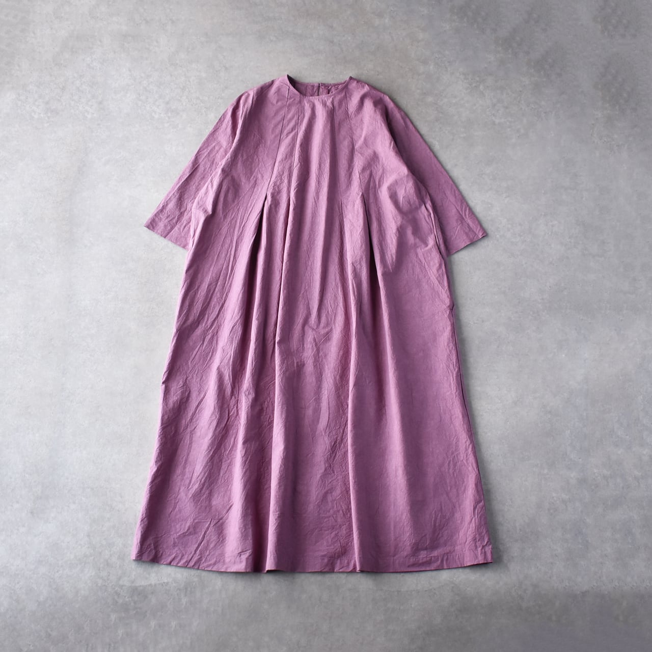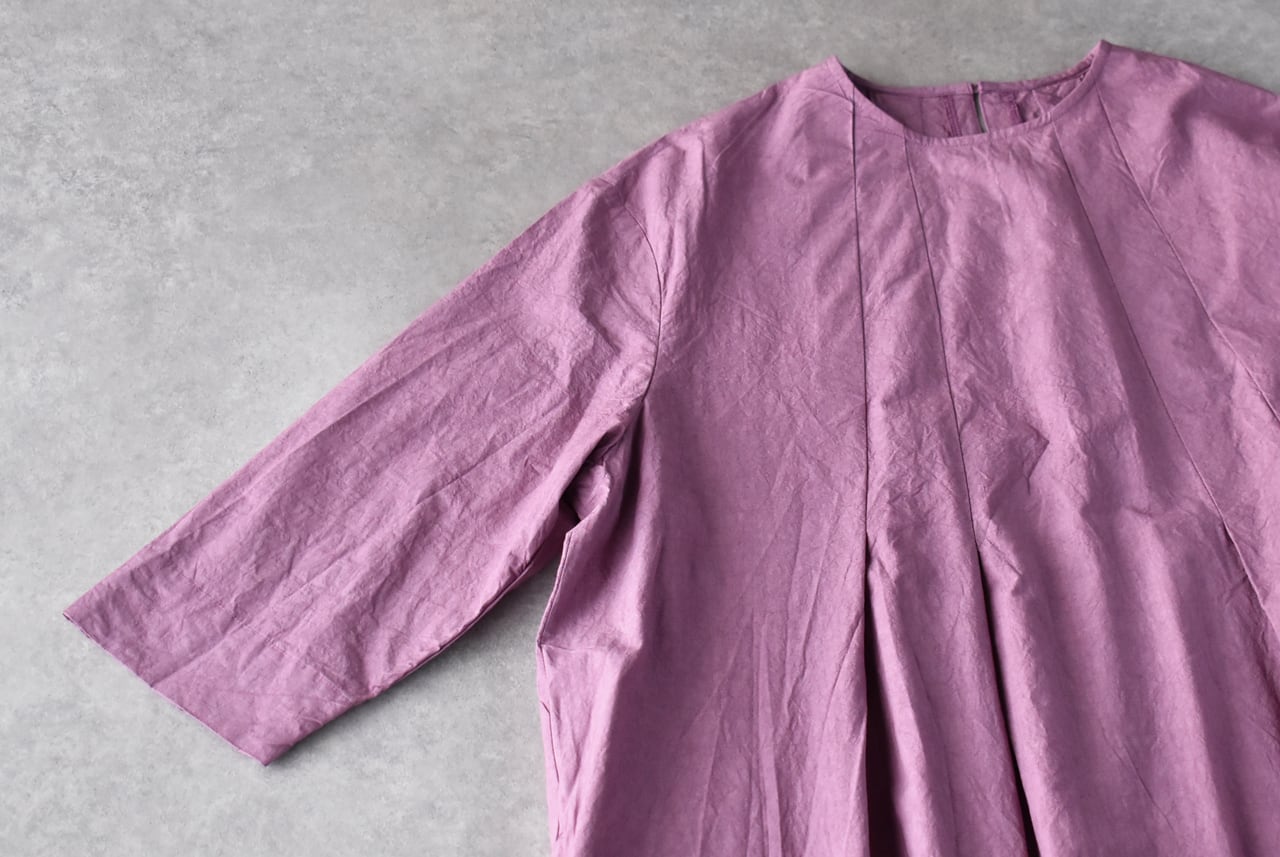 ROBE de PEAUから、職人が丁寧に染め上げたプラムカラーが春の着こなしを軽やかに彩ってくれるワンピースが届きました。前後にタックを寄せた、優しく広がるシルエットの美しさが際立つ一枚です。長めの丈感もとっても素敵ですよ。高密度に織られたコットンリネン生地は、薄手ですがしっかりとしたハリとコシがあり、自然なシワ感や染めムラのある表情も風合い豊か。暖かな春が待ち遠しくなりますね。