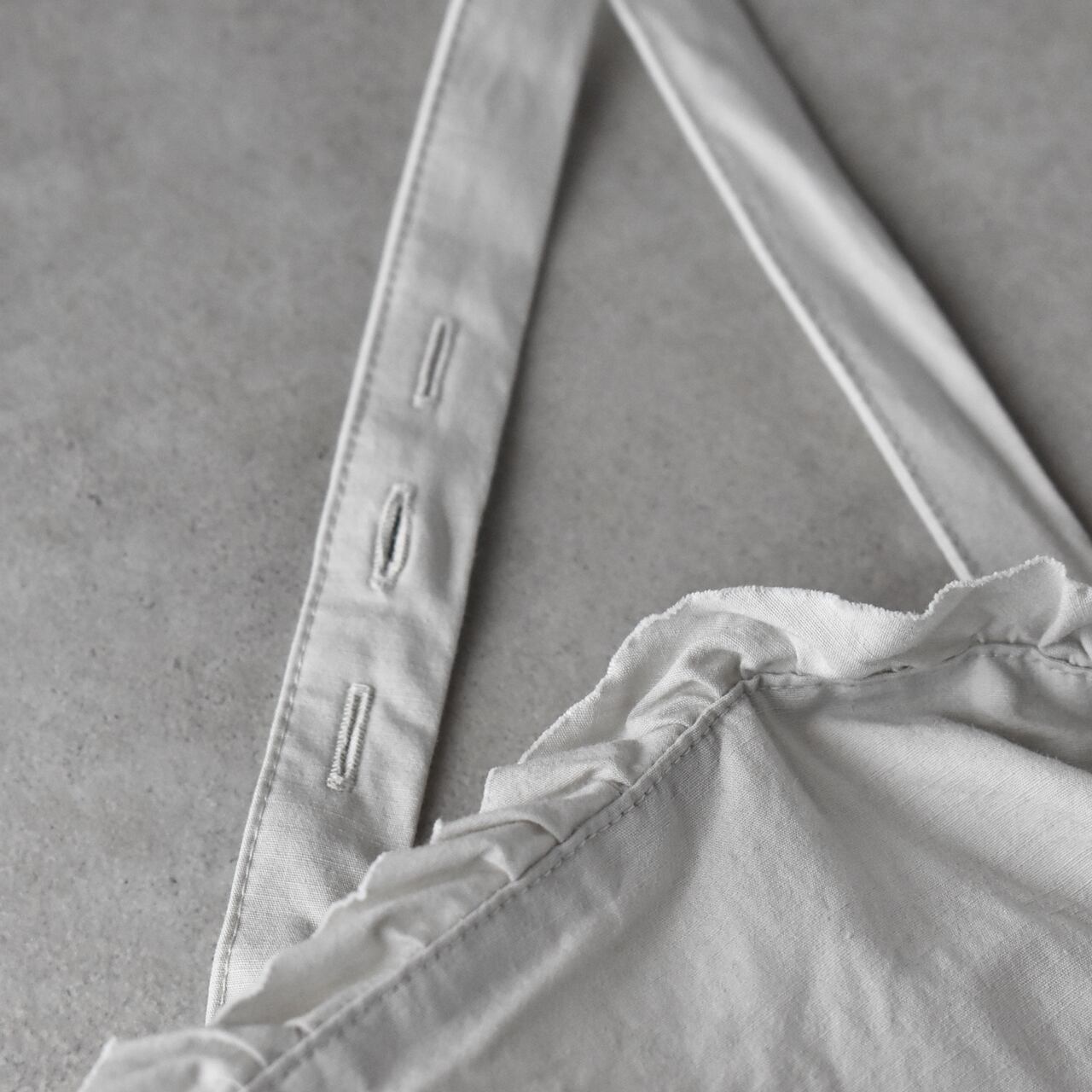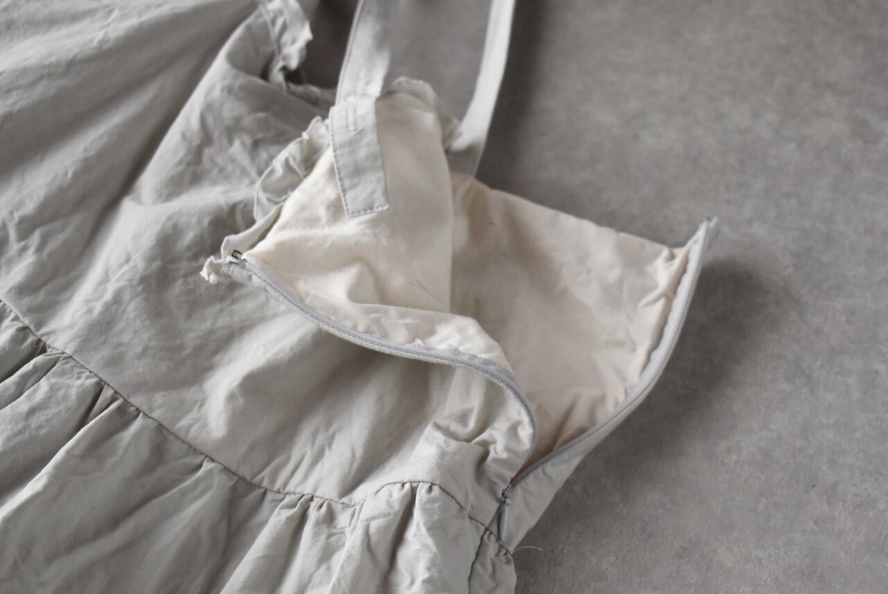 ROBE de PEAUから、胸当てのフチを彩るフリルが、まるでキャミソールのような愛らしい印象の新作サロペットが届きました。今の時期はタートルネック、暖かくなればブラウスやTシャツを合わせて、一年を通して楽しめる一枚です。ワイドなパンツ幅が大人っぽくて、とってもスタイル良く見せてくれますよ。ツヤを抑えたコットンリネンも上質で、自然なシワ感も風合い豊か。リボンを通したバックスタイルも中世のドレスのような雰囲気で素敵ですよ。左脇下に着脱用のチャックがあります。肩ヒモの長さはボタンで3段階に調節出来ます。