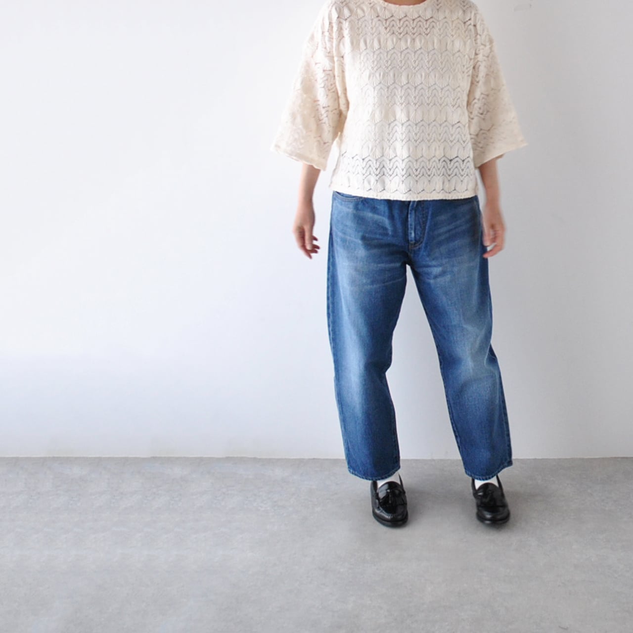 国内で数台しか残っていない織り機で織り上げた、シェル柄のレース地が繊細で可憐なROBE de PEAUのコットンニット。少しレトロで懐かしい雰囲気が今の時代にはとても新鮮で可愛いですね。シックなパンツやきれいめのスカートにはもちろん、デニムに合わせても上品に仕上げてくれますよ。透け感を活かした大人の女性のコーディネートを楽しみたい一枚です。