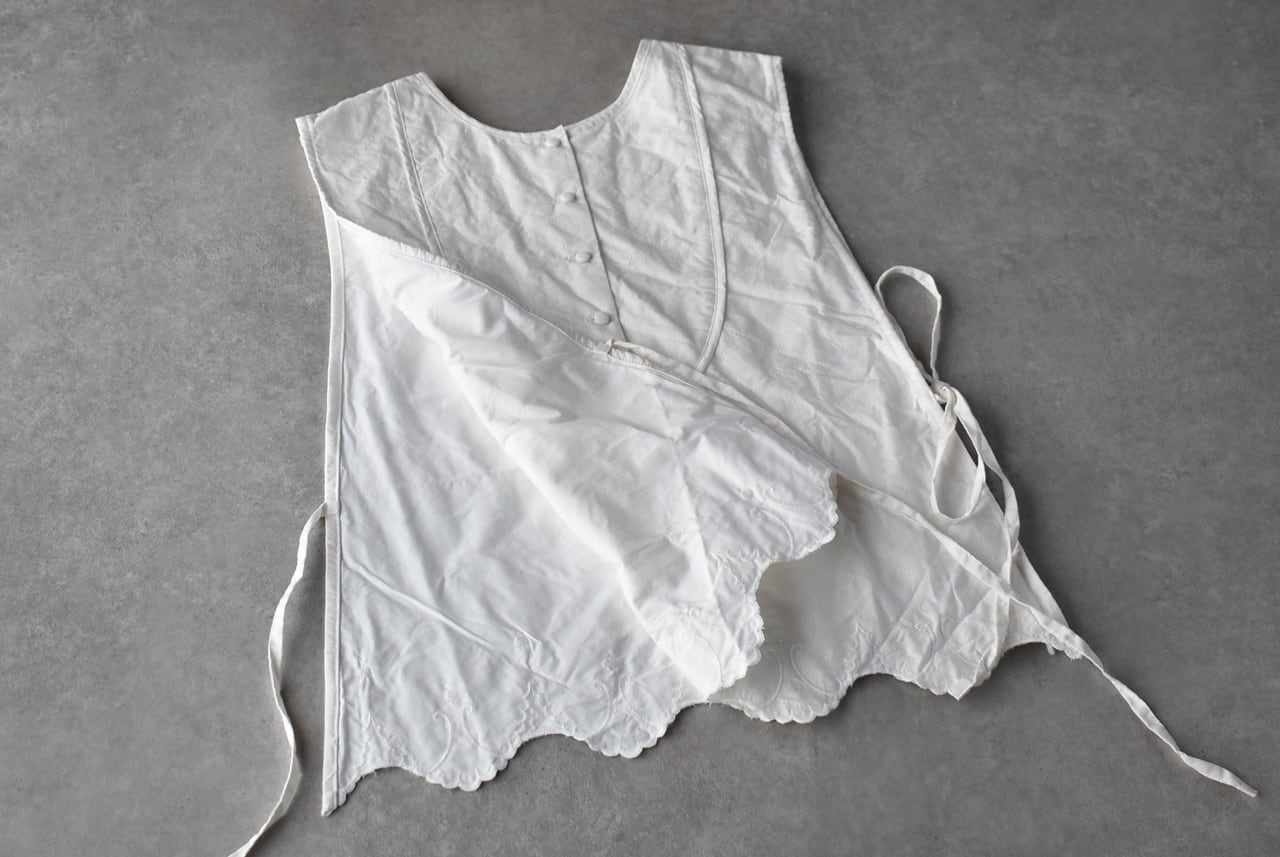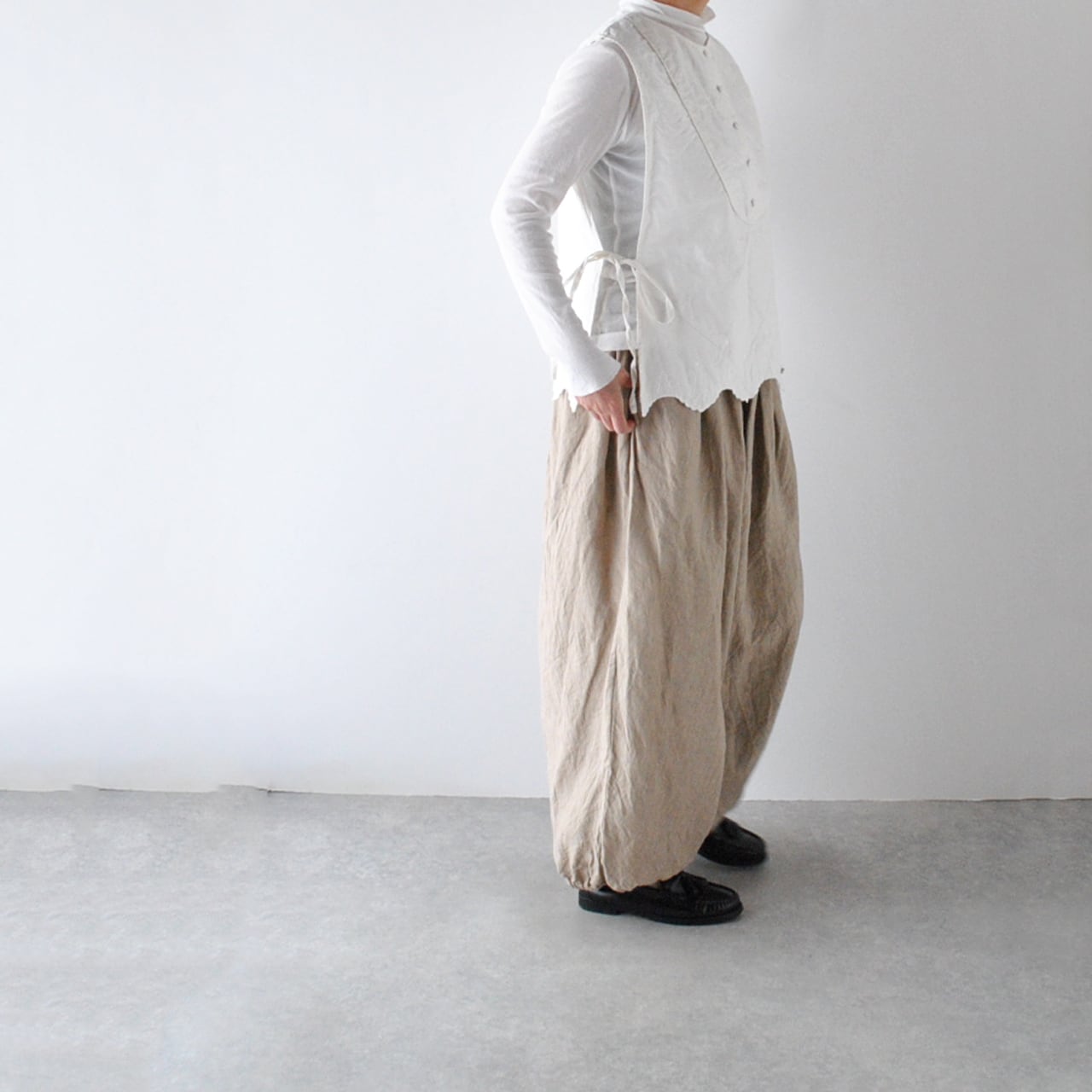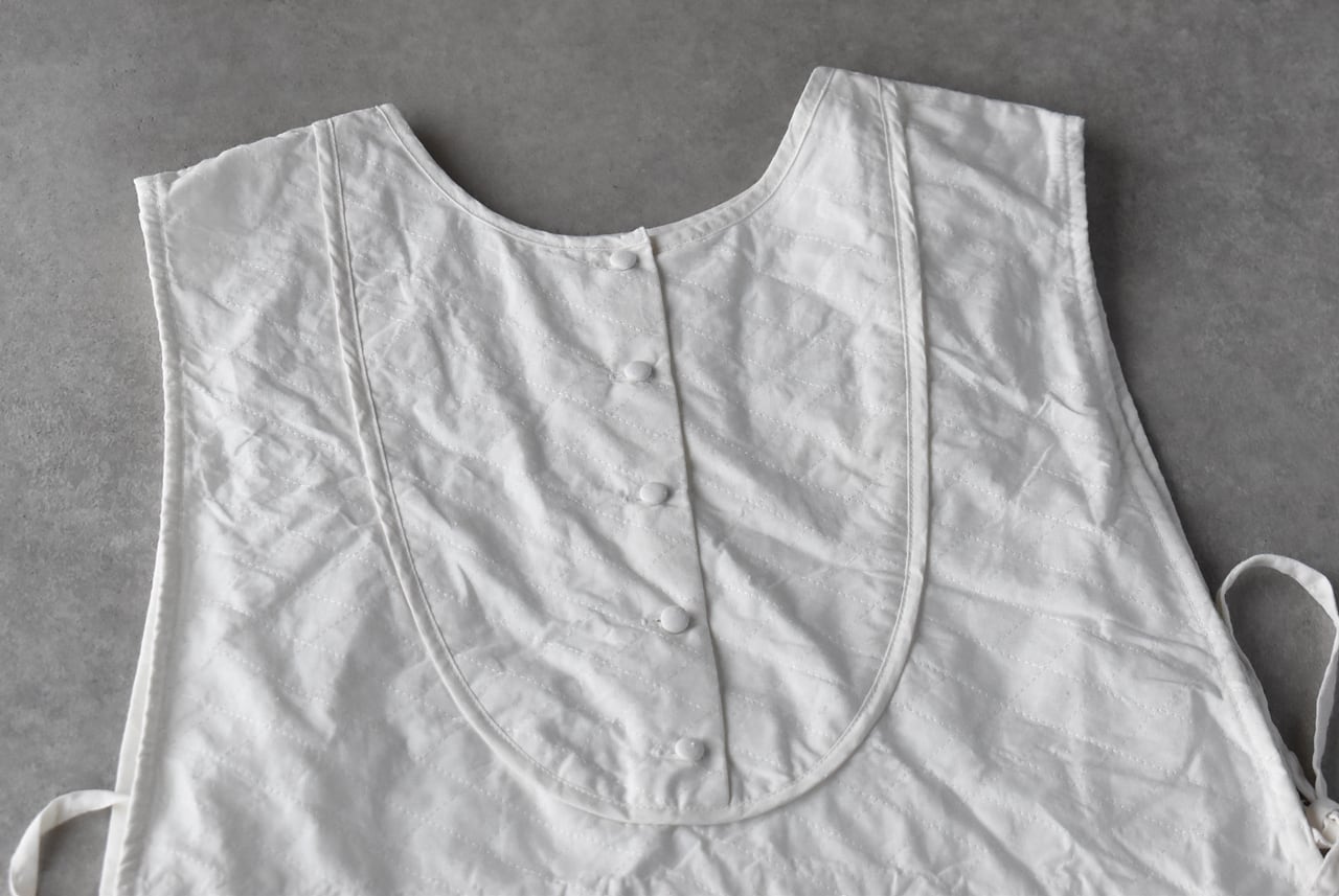 Gauze# から、両サイドのリボンをキュッと結んで着用するキルト素材のジレが届きました。お気に入りのブラウスをはじめ、Tシャツやワンピース、肌寒い時期はタートルネックなど、季節のインナーと合わせて雰囲気たっぷりに楽しめる一枚。ラウンドした胸元の切り替えと、身頃に並んだクルミボタンが可愛いですよ。裾にはアンティークを再現したスカラップレースをあしらいました。程よい厚みのあるラミーシルク素材のダイヤキルト生地も上品。いつものコーディネートにちょっとアクセントとして、ぜひ一枚プラスしてみてくださいね。