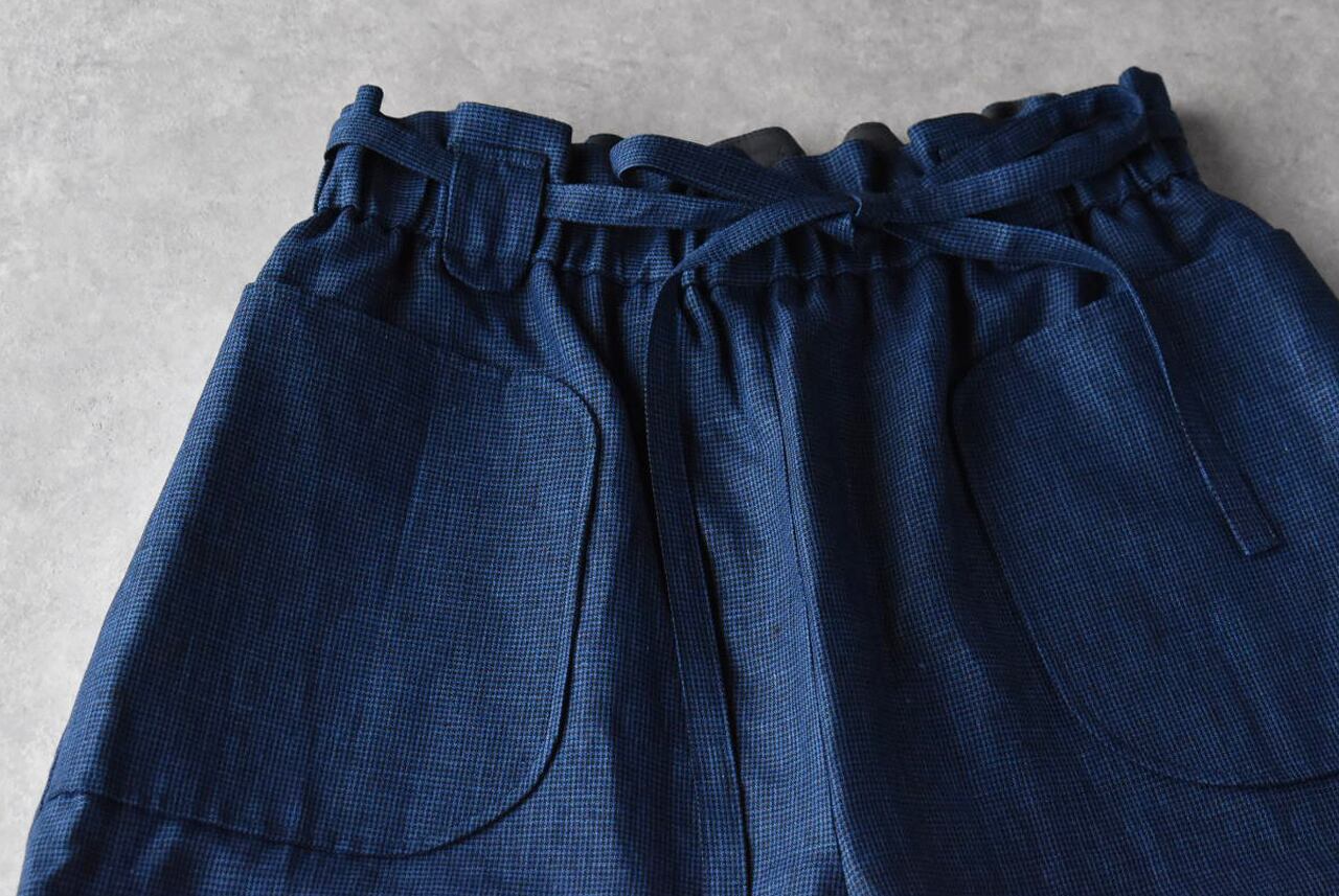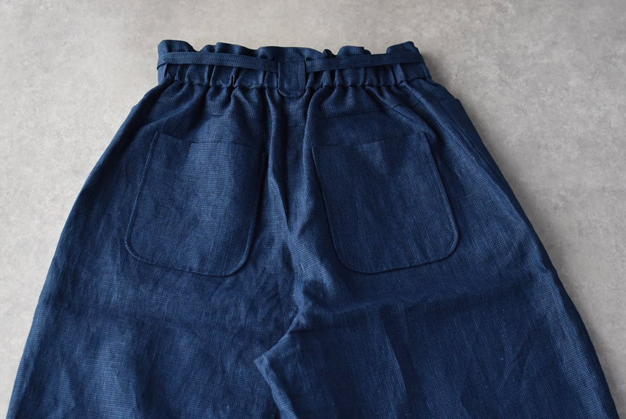 MAGALIから、たっぷりとしたボリューム感で大人っぽく履いて頂けるワイドパンツが届きました。どこか柔らかな表情のあるストレートシルエットが、身体のラインを優しく包み込んでくれる安心感のある一枚。ウエストはゴム仕様で、付属のリボンを結んで着用してもいいですし、リボンを外して内側のヒモで調節する事も出来ますよ。細かな千鳥格子柄をインディゴで染めたリネン素材は、着用する度にくたっと柔らかく、洗濯する度に少しずつ色が変化し、味わいが増すのも魅力。足を長く、上半身をスッキリと見せてくれるのも嬉しいポイントです。