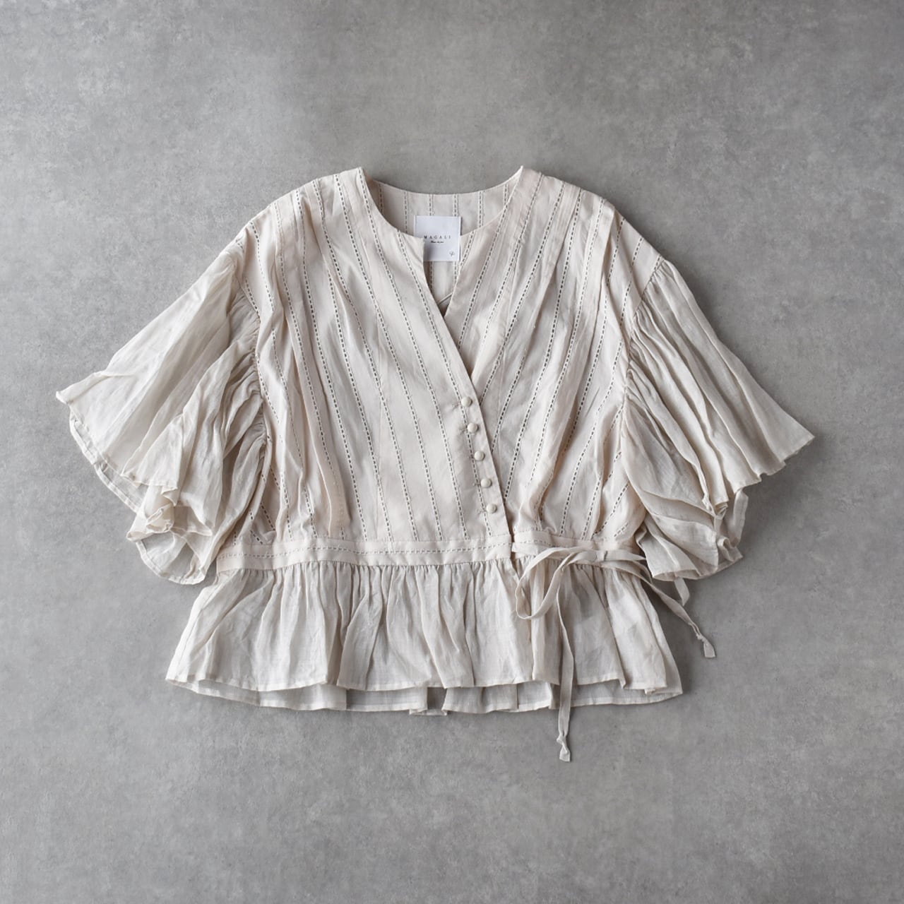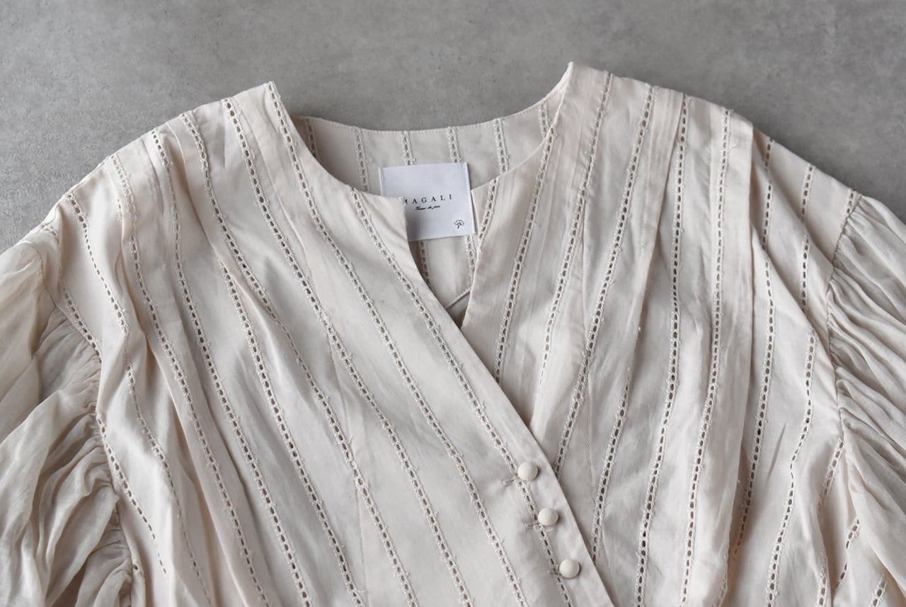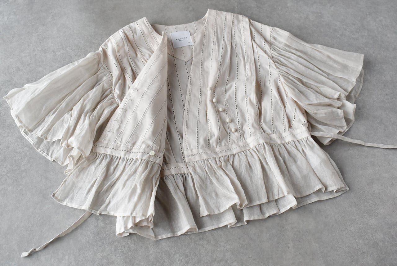 MAGALIから、ウエストのリボンをキュッと結んでカシュクールのようなデザインで楽しめる、コットンレースのブラウスが届きました。繊細なレースの表情と、空気を纏う様な軽やかさが魅力的な一枚です。広い袖にはたっぷりとギャザーを寄せ、動く度にふわりと揺れる姿がとっても美しいです。斜めに並んだクルミボタンも個性的。ブラウスとしてはもちろん、前を開けてワンピースに羽織ったコーディネートもオススメです。